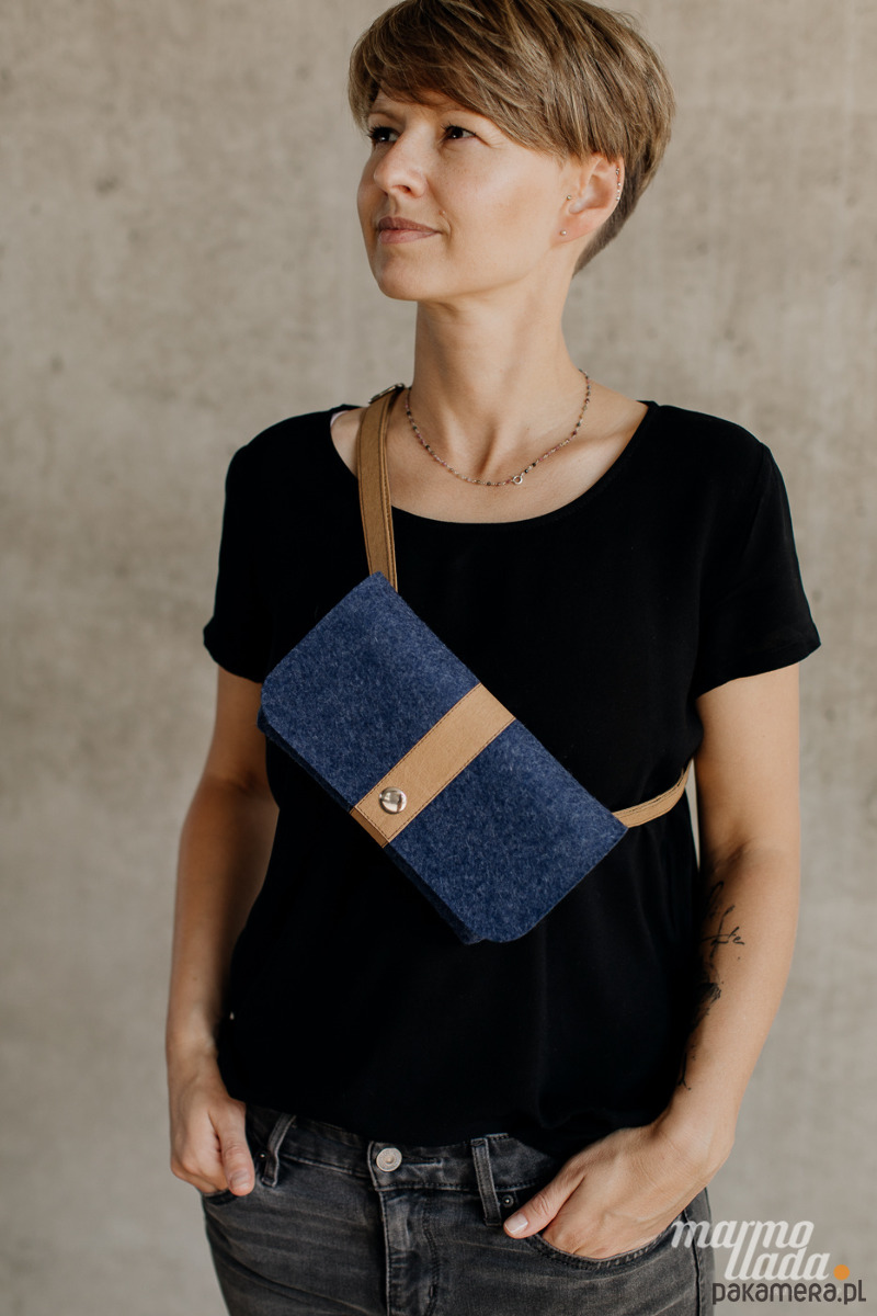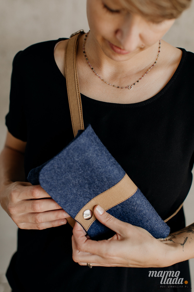 Niewielka torebka jest wykonana z grubego wełnianego filcu w kolorze niebieskim. Ma regulowany pasek wykonany z piaskowego papieru, jest zapinana na zatrzask. W zależności od potrzeby torebkę można nosić jako:
