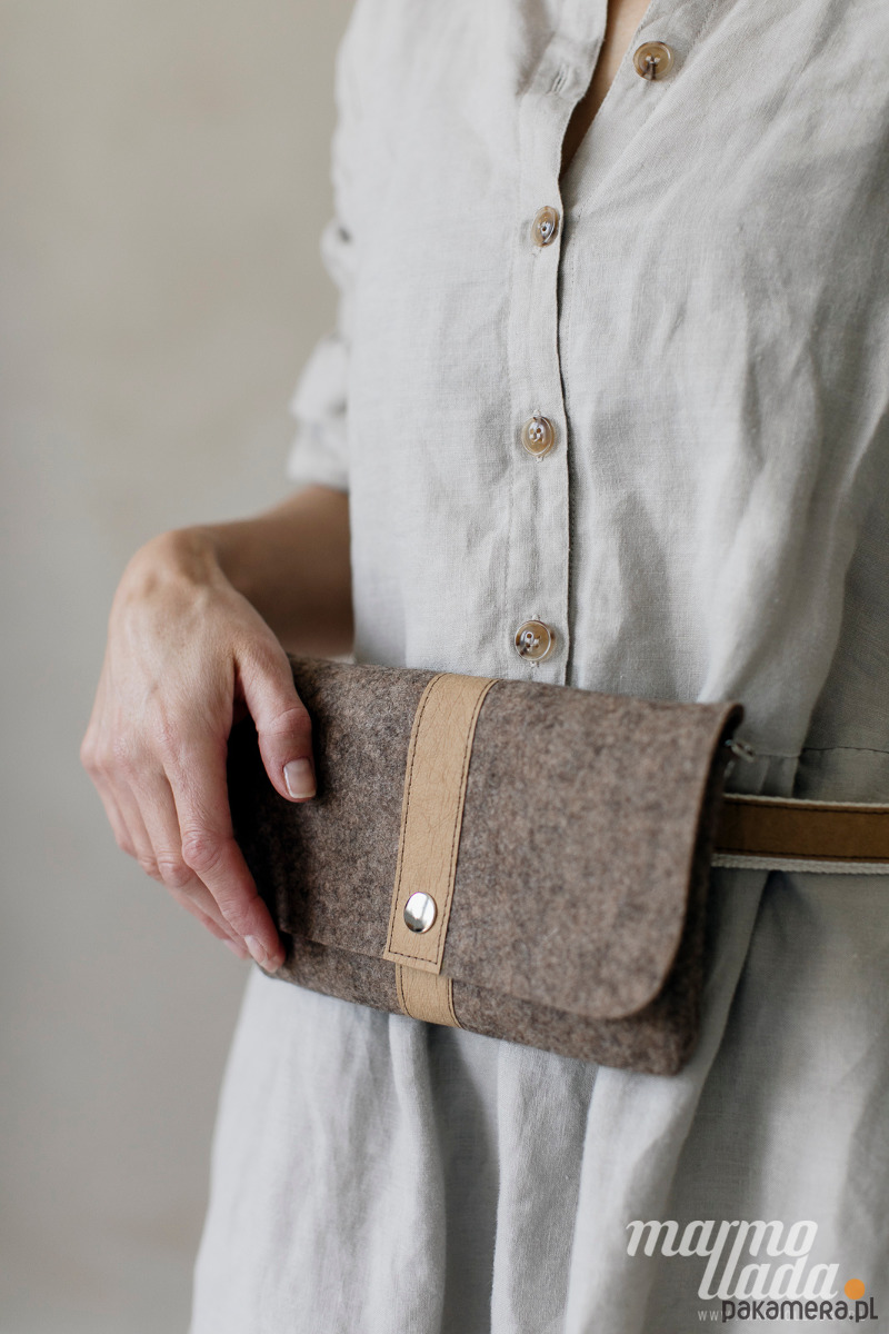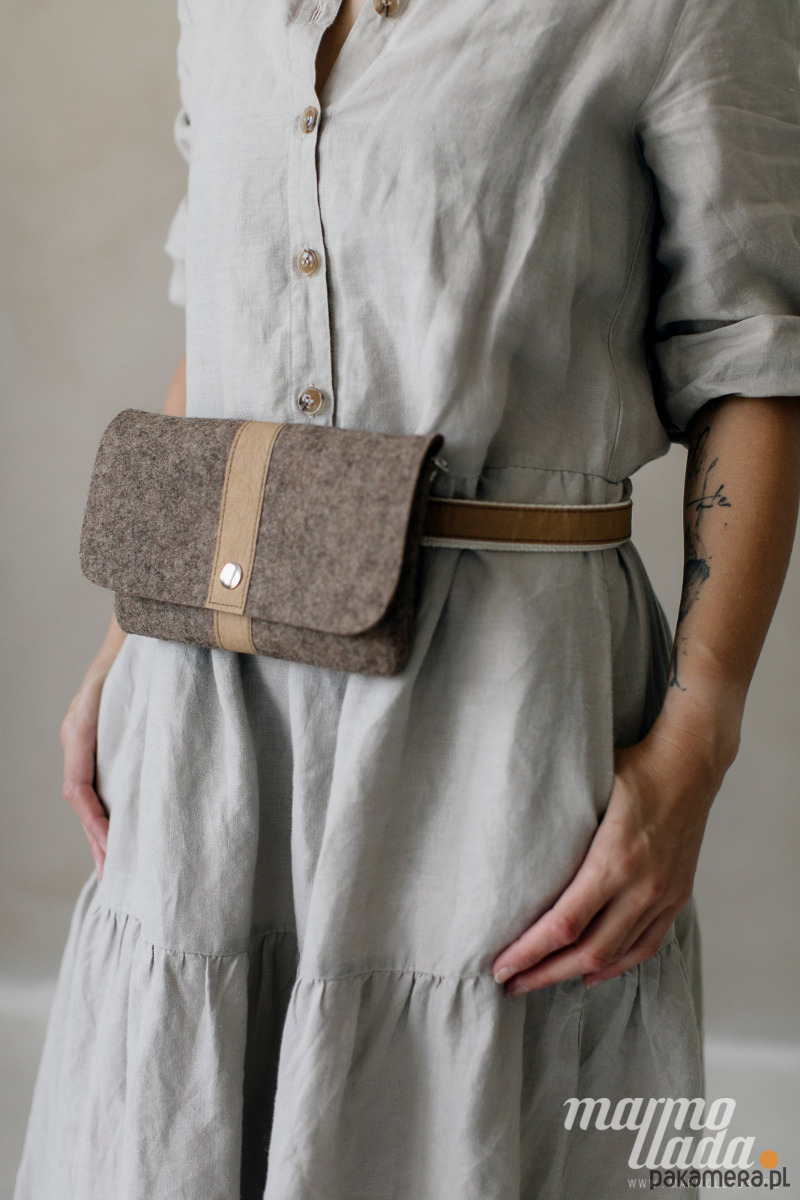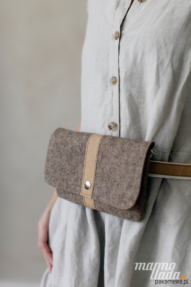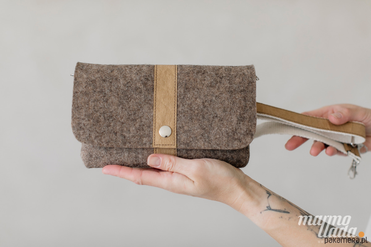 Niewielka torebka jest wykonana z grubego wełnianego filcu w kolorze kaszmiru. Ma regulowany pasek wykonany z piaskowego papieru, jest zapinana na zatrzask. W zależności od potrzeby torebkę można nosić jako: