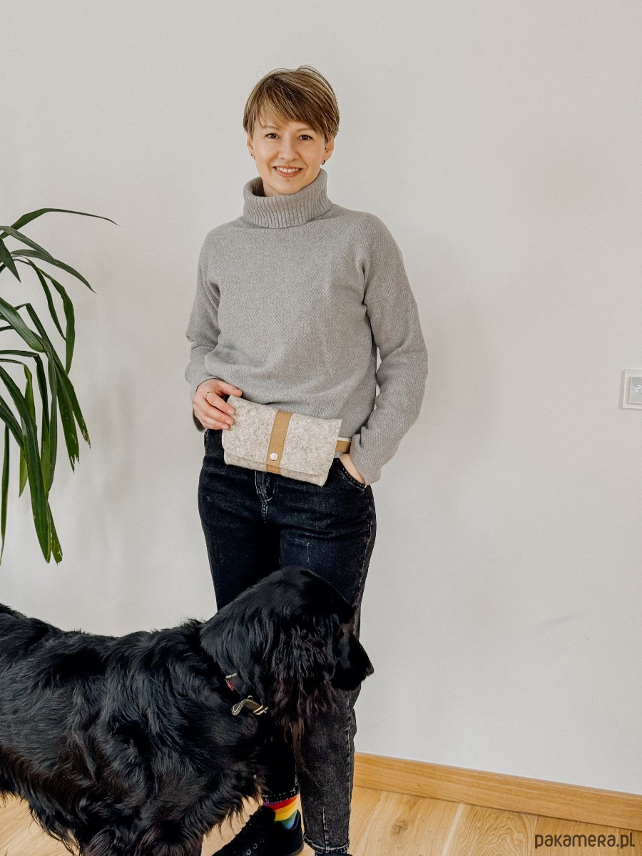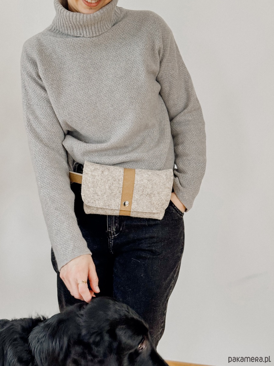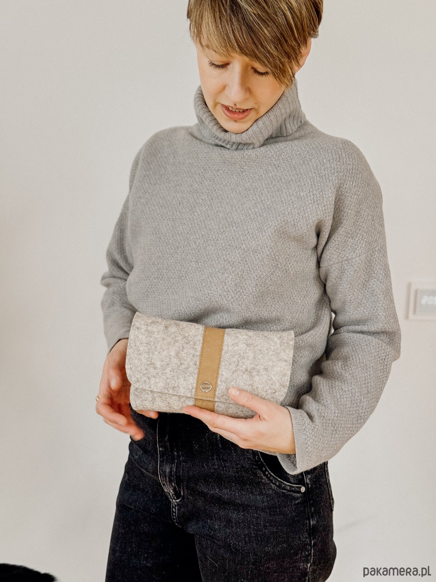 Niewielka torebka jest wykonana z grubego wełnianego filcu w kolorze beżowym. Ma regulowany pasek wykonany z piaskowego papieru, jest zapinana na zatrzask.. W zależności od potrzeby torebkę można nosić jako:
