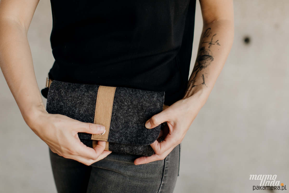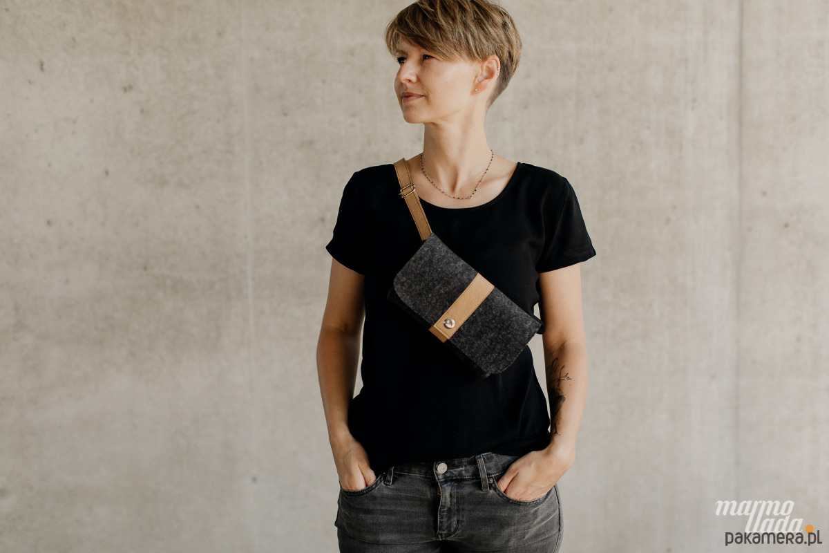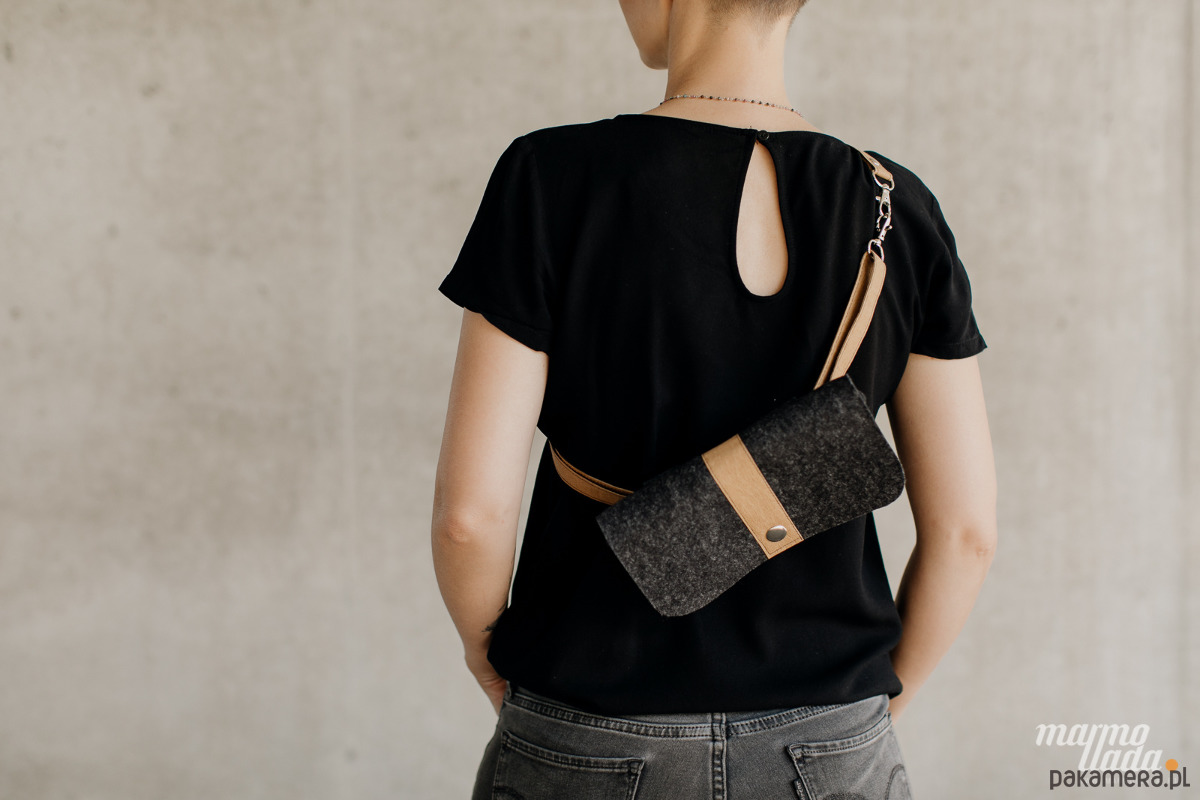 Niewielka torebka jest wykonana z grubego wełnianego filcu w kolorze grafitowym. Ma regulowany pasek wykonany z piaskowego papieru, jest zapinana na zatrzask. W zależności od potrzeby torebkę można nosić jako: