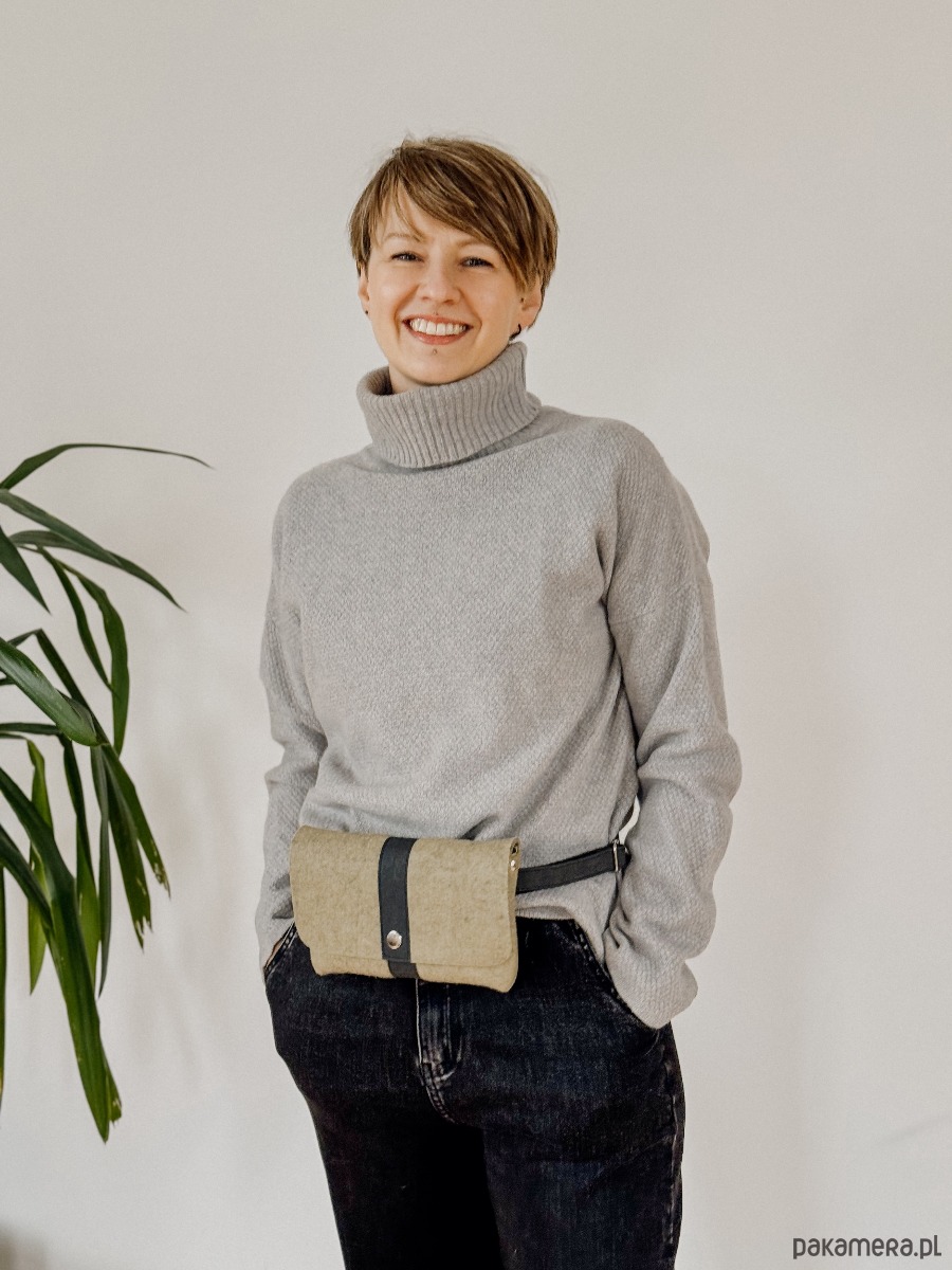 Niewielka torebka jest wykonana z grubego wełnianego filcu w kolorze miętowym. Ma regulowany pasek wykonany z czarnego papieru, jest zapinana na zatrzask.. W zależności od potrzeby torebkę można nosić jako: