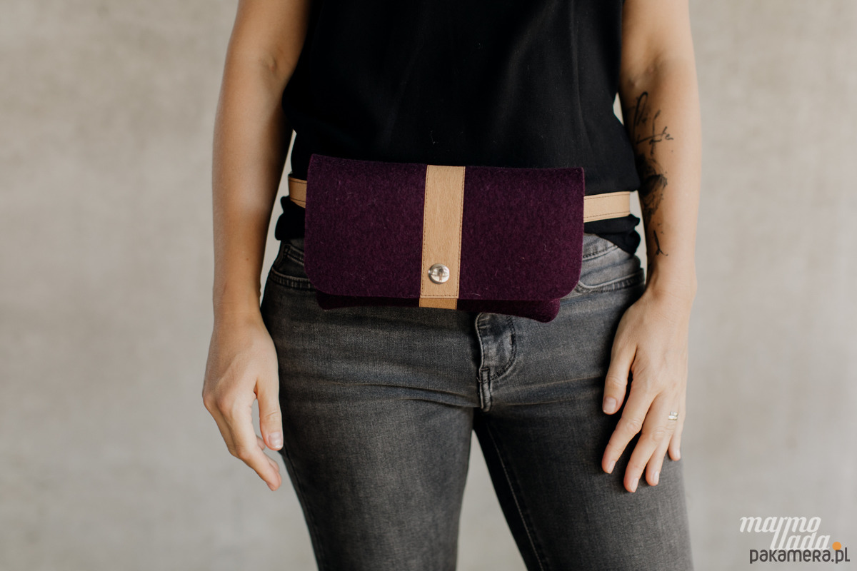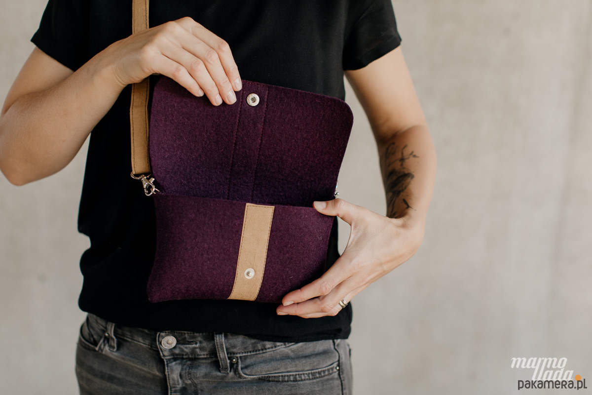 Niewielka torebka jest wykonana z grubego wełnianego filcu w kolorze burgundowym. Ma regulowany pasek wykonany z piaskowego papieru, jest zapinana na zatrzask. W zależności od potrzeby torebkę można nosić jako: