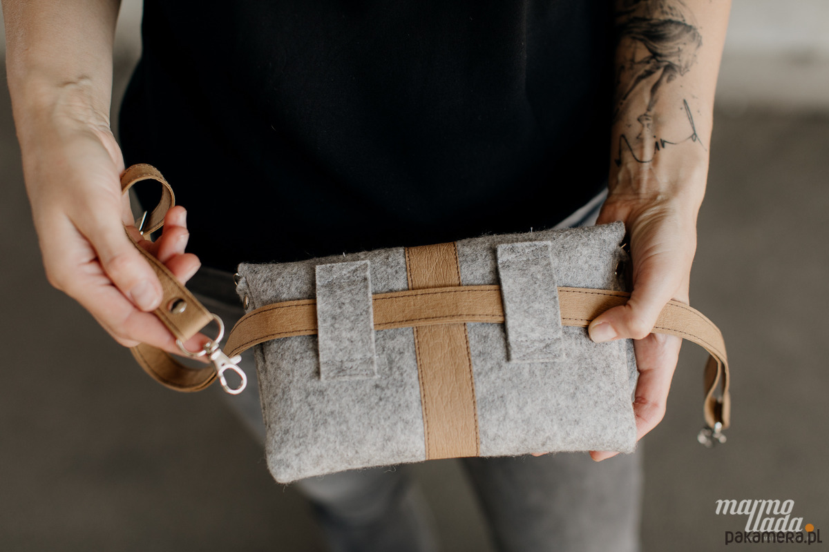 Niewielka torebka jest wykonana z grubego wełnianego filcu w kolorze szarym. Ma regulowany pasek wykonany z piaskowego papieru, jest zapinana na zatrzask. W zależności od potrzeby torebkę można nosić jako:
