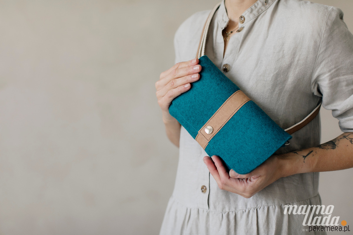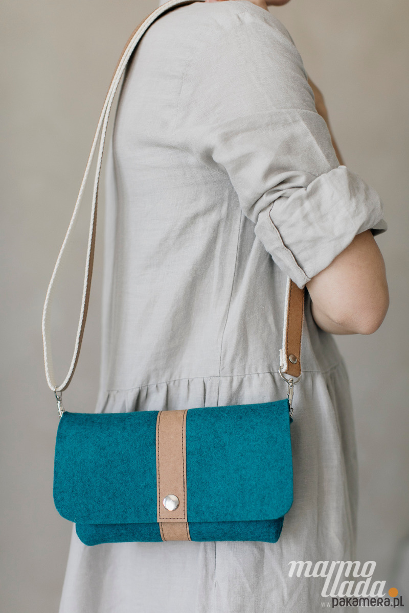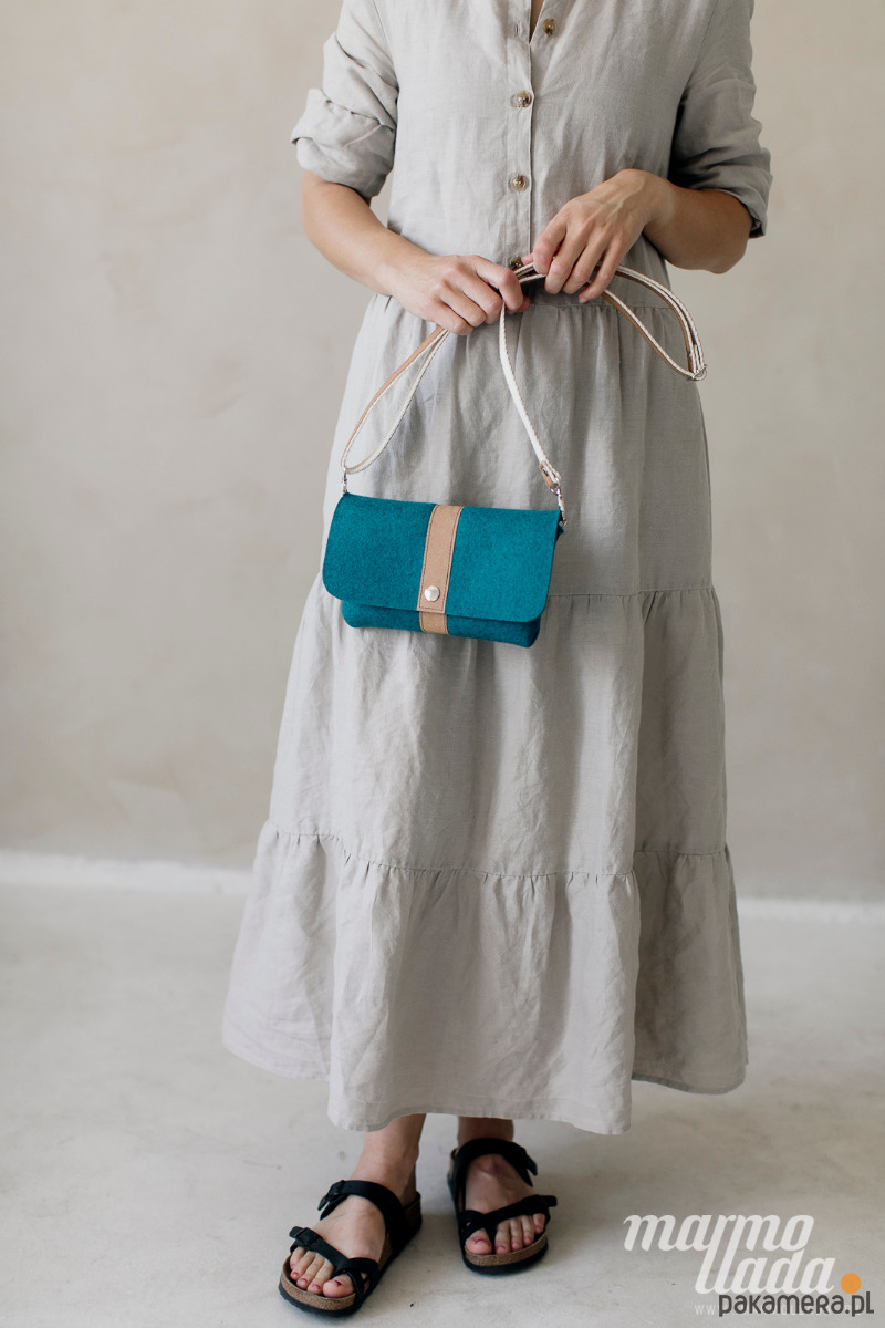 Niewielka torebka jest wykonana z grubego wełnianego filcu w kolorze turkusowym. Ma regulowany pasek wykonany z piaskowego papieru, jest zapinana na zatrzask. W zależności od potrzeby torebkę można nosić jako: