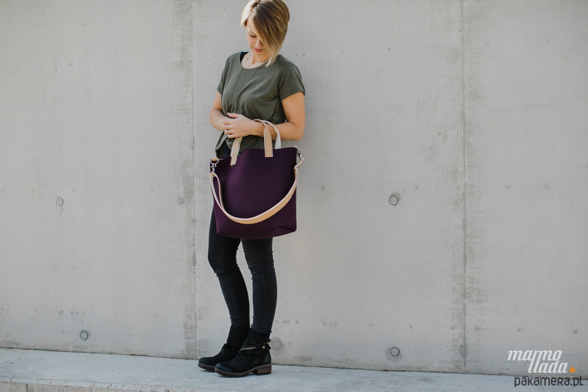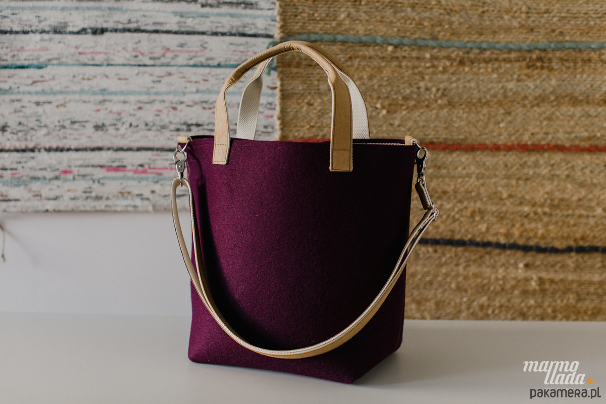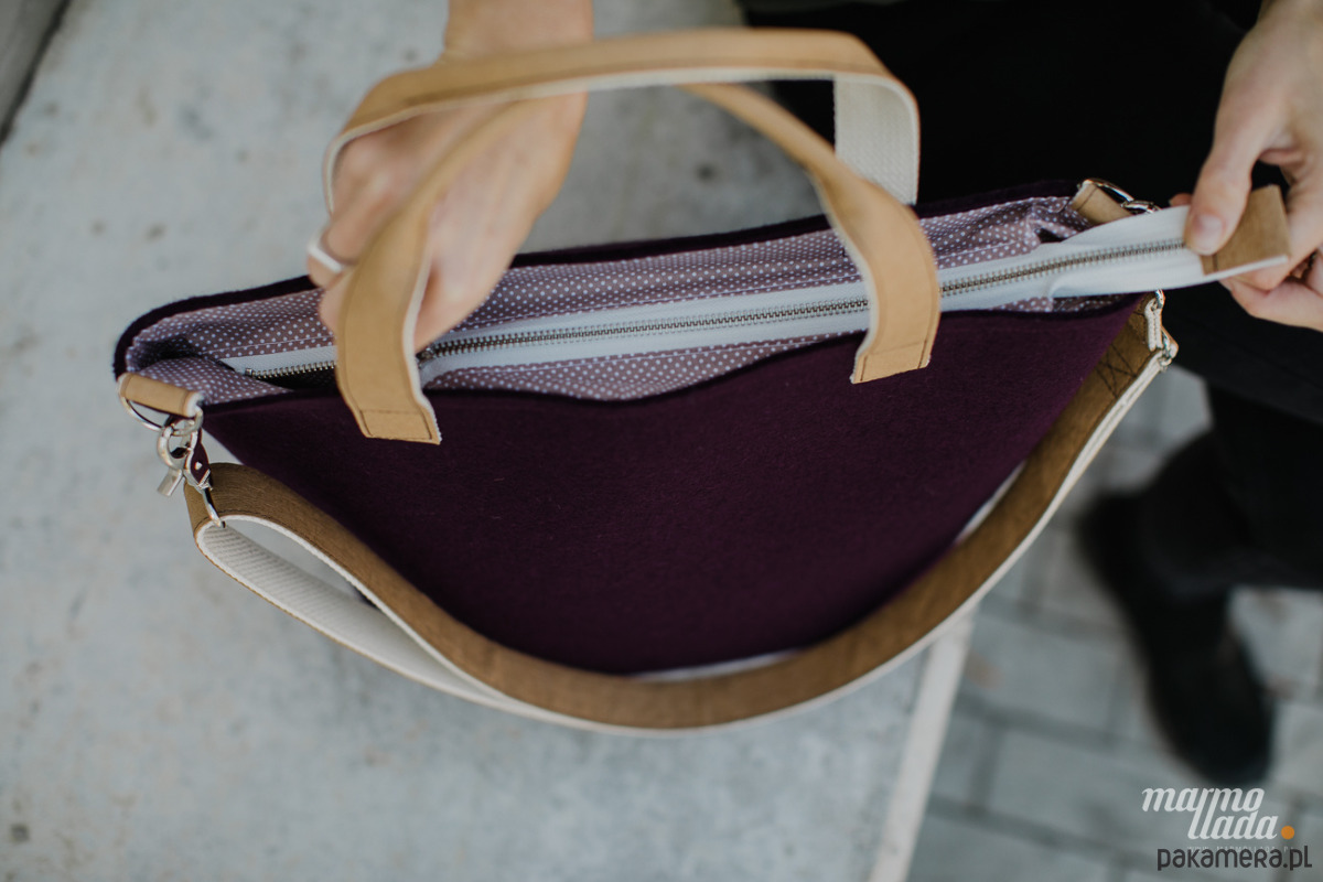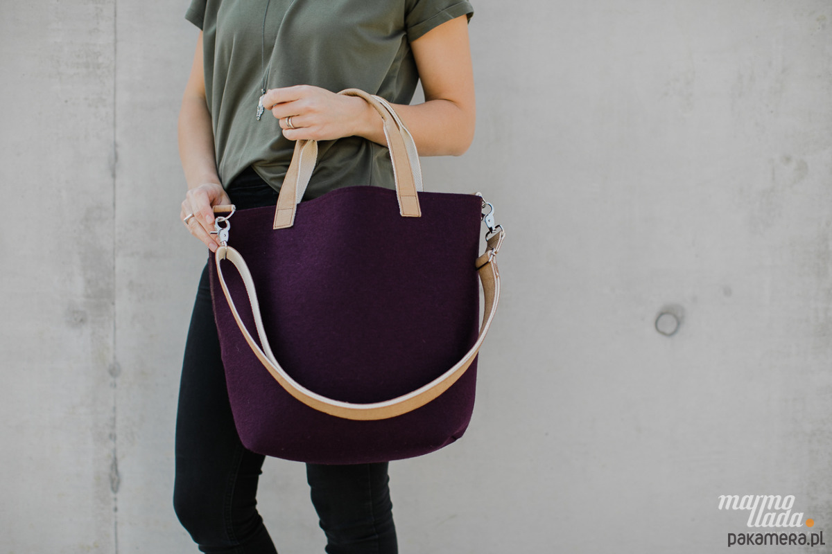 Torebka na ramię jest uszyta z wełnianego filcu w kolorze oberżyny, ma krótkie uchwyty oraz regulowany pasek wykonane z piaskowego papieru podszytego grubą taśmą bawełnianą.