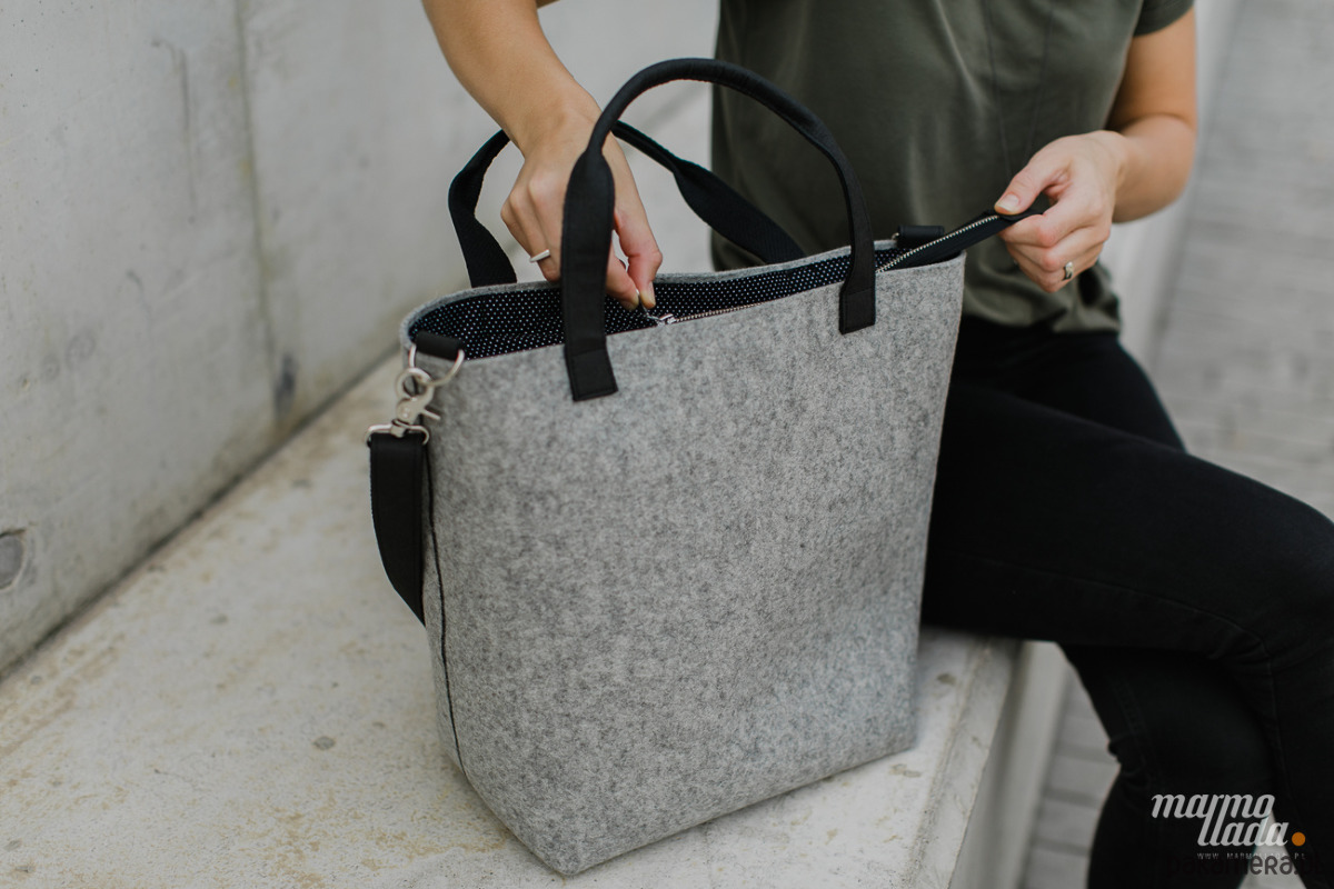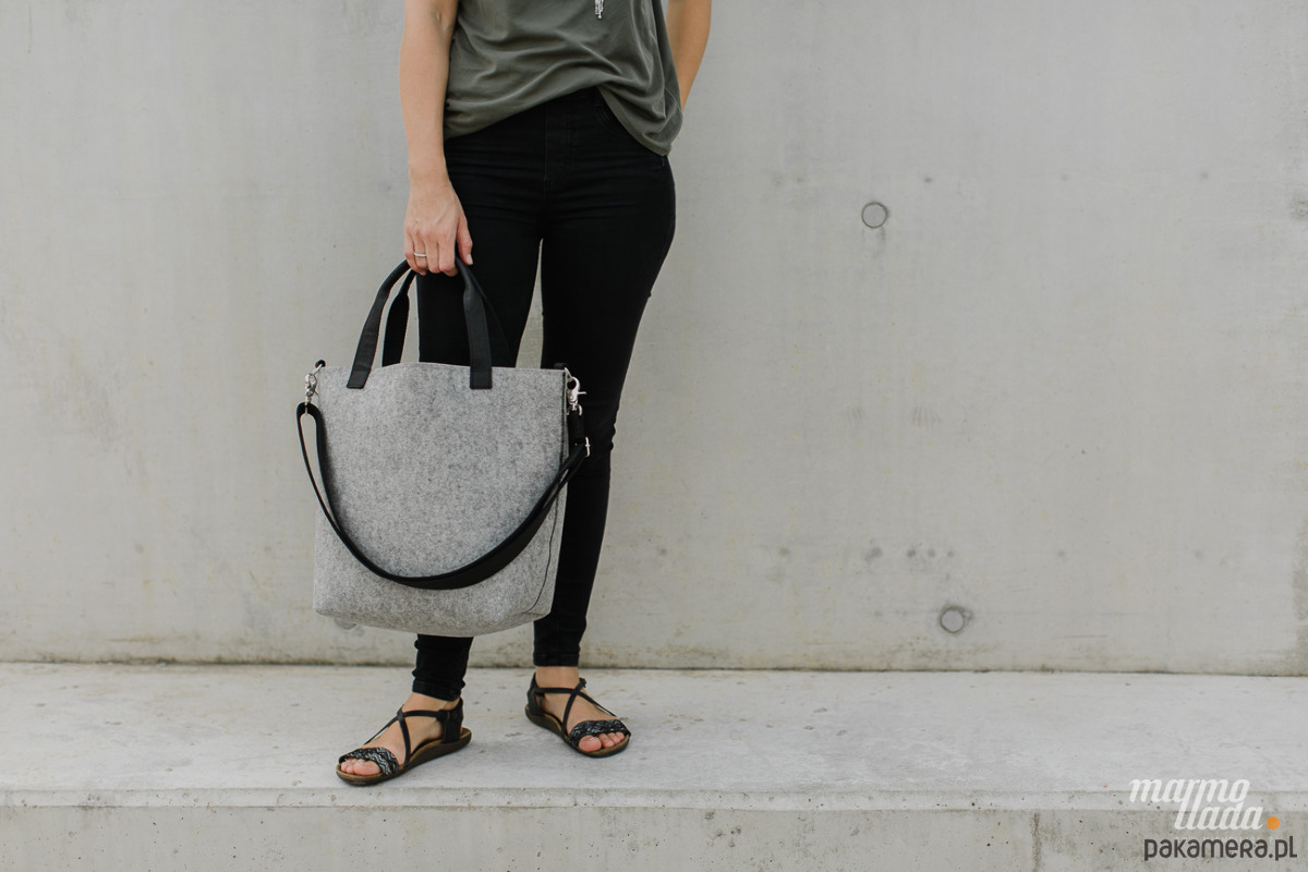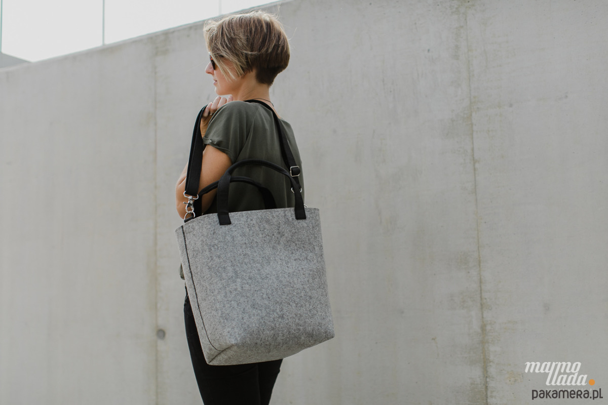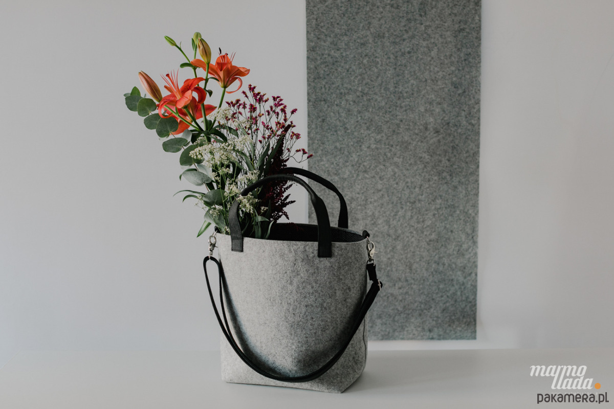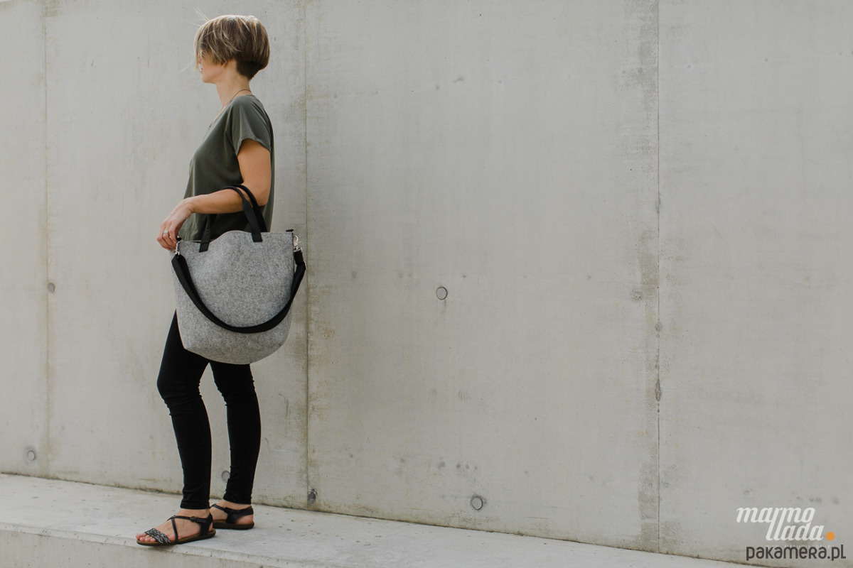 Torebka jest wykonana z grubego wełnianego filcu w kolorze szary melanż, ma krótkie uchwyty oraz regulowany pasek wykonane z czarnego papieru podszytego grubą taśmą bawełnianą.