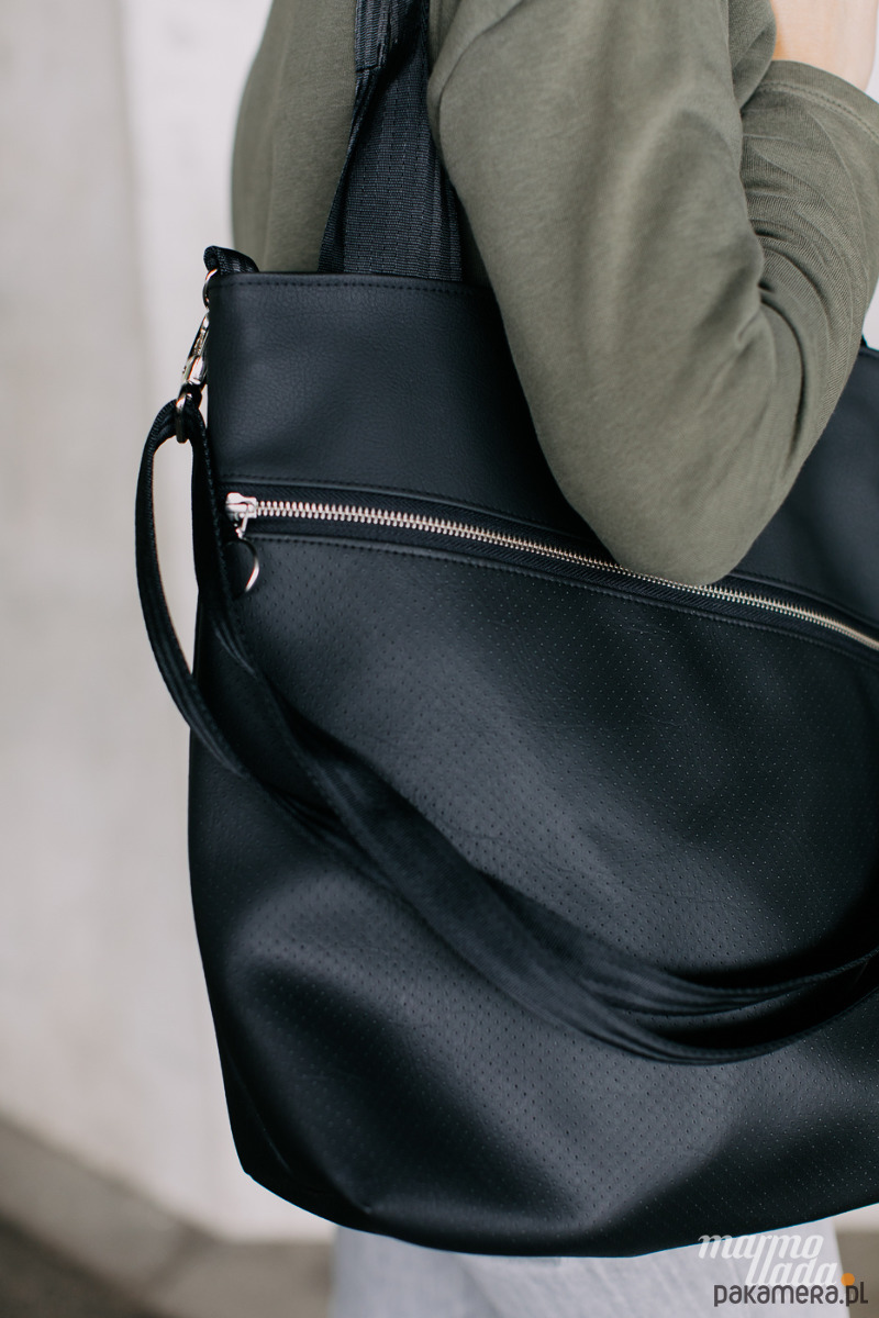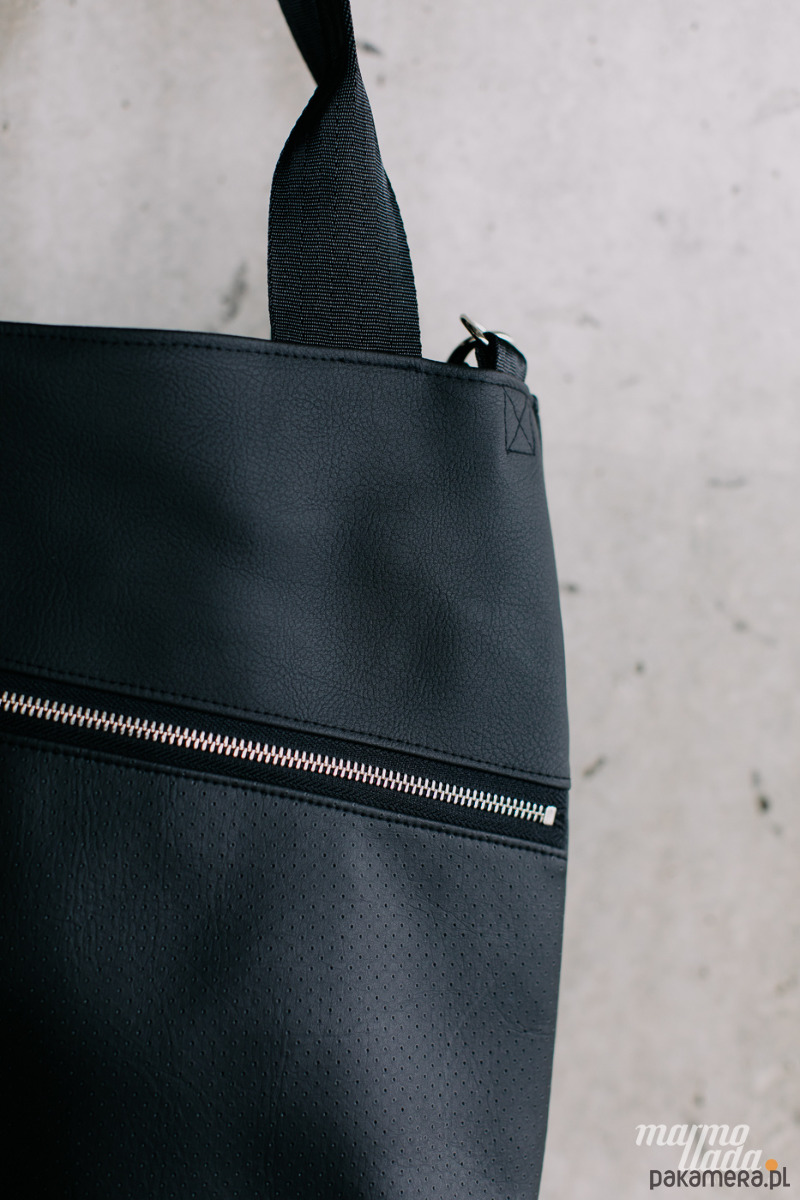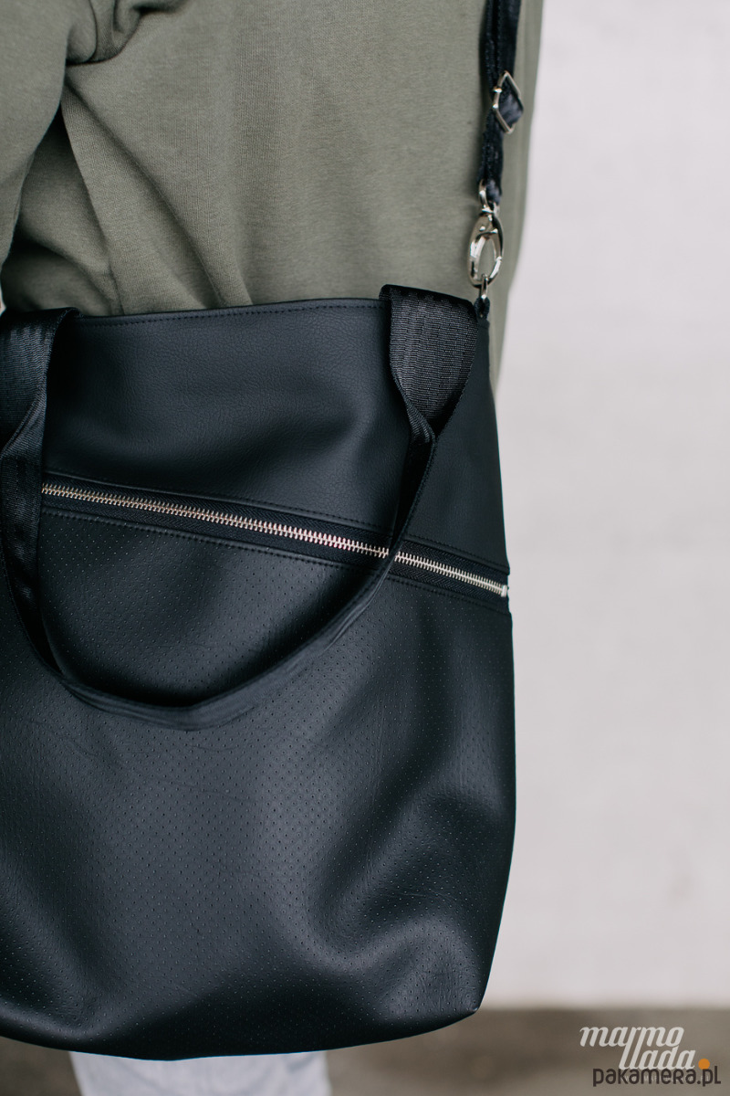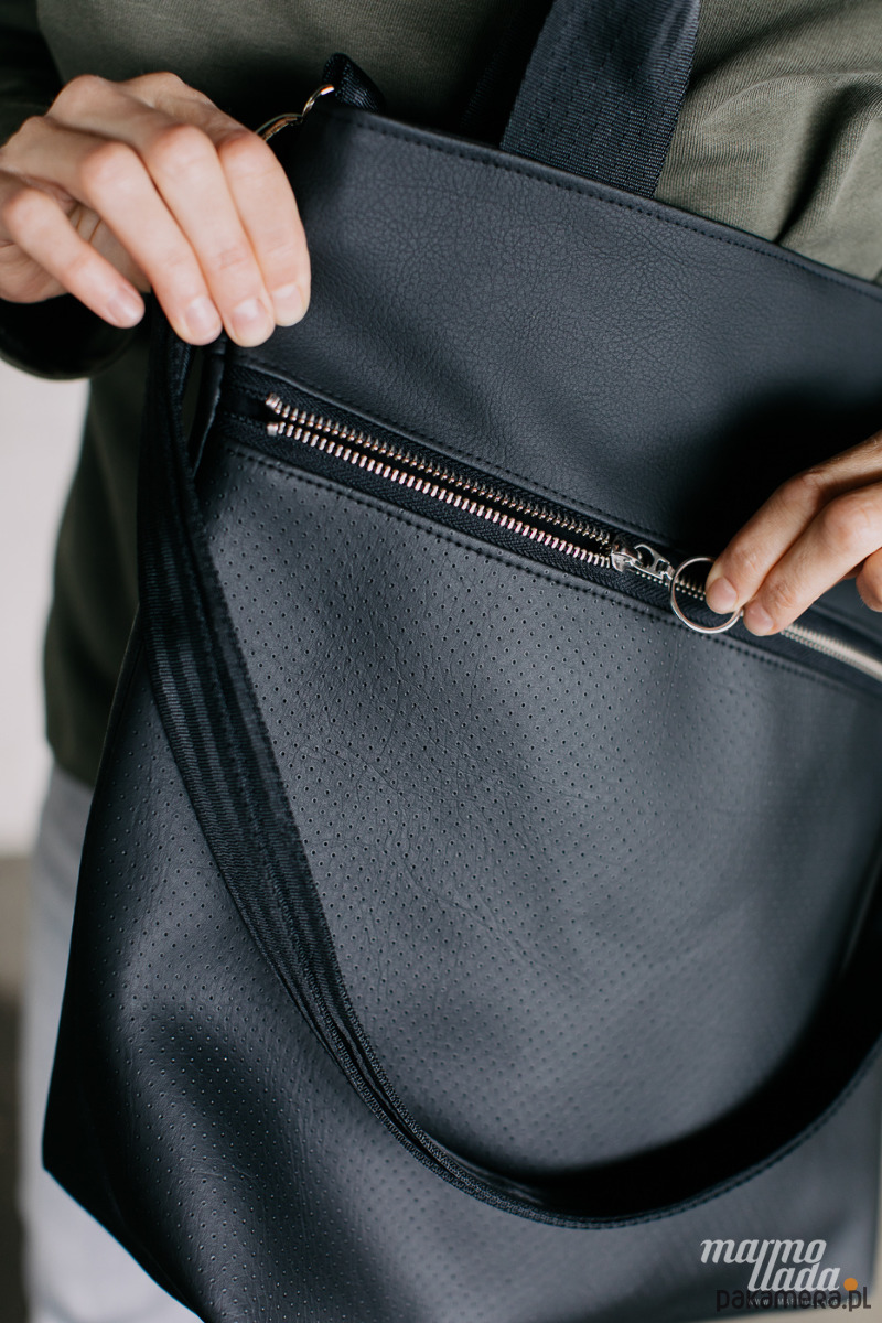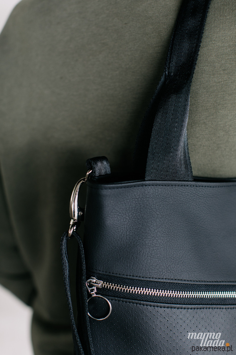 Klasyczna, prostokątna torebka, wykonana z tkaniny tapicerskiej: czarnej gładkiej połączonej z czarną tkaniną z małymi dziurkami, obie bardzo przyjemne w dotyku. Torebka posiada regulowany pasek do noszenia torby na skos oraz uchwyty do noszenia na ramieniu wykonane z pasów samochodowych w kolorze czarnym. Na zewnątrz znajduje się spora kieszeń zapinana na metalowy zamek.