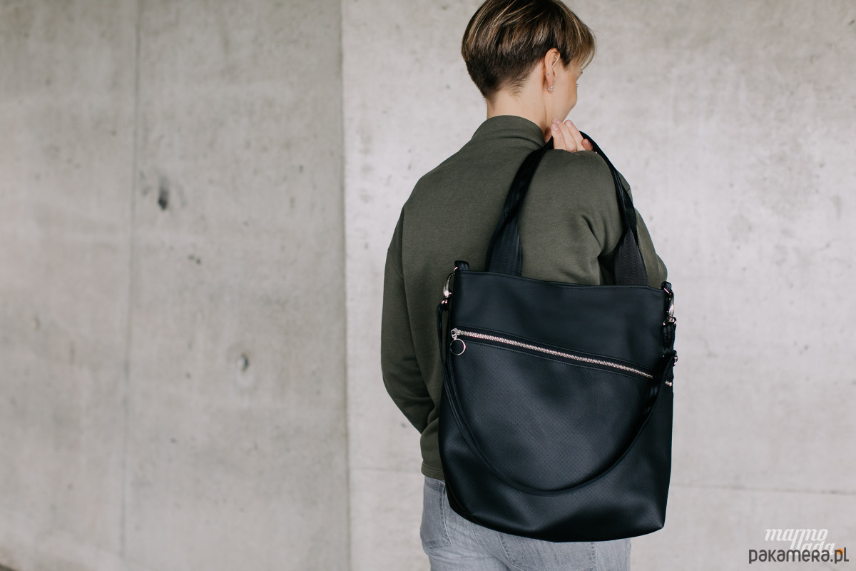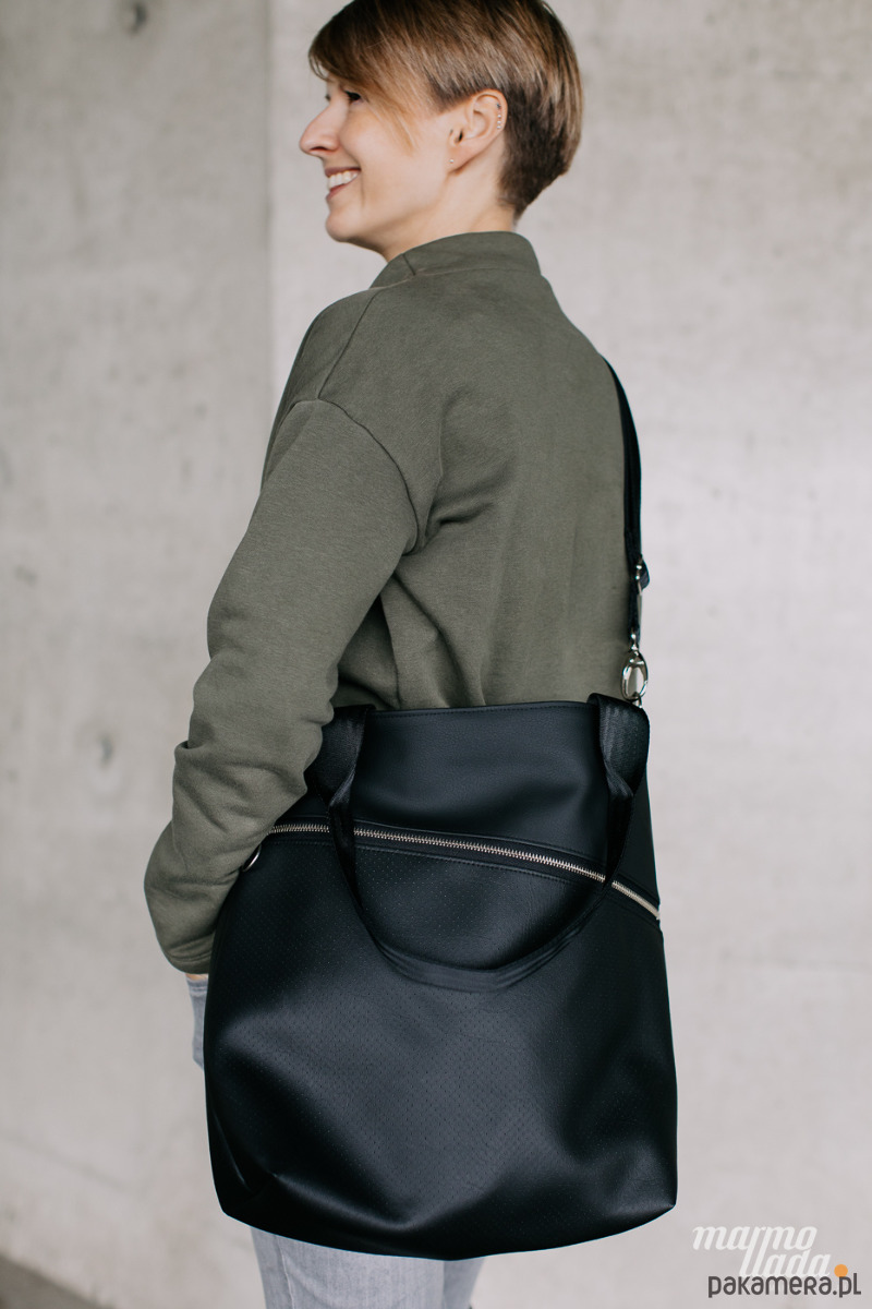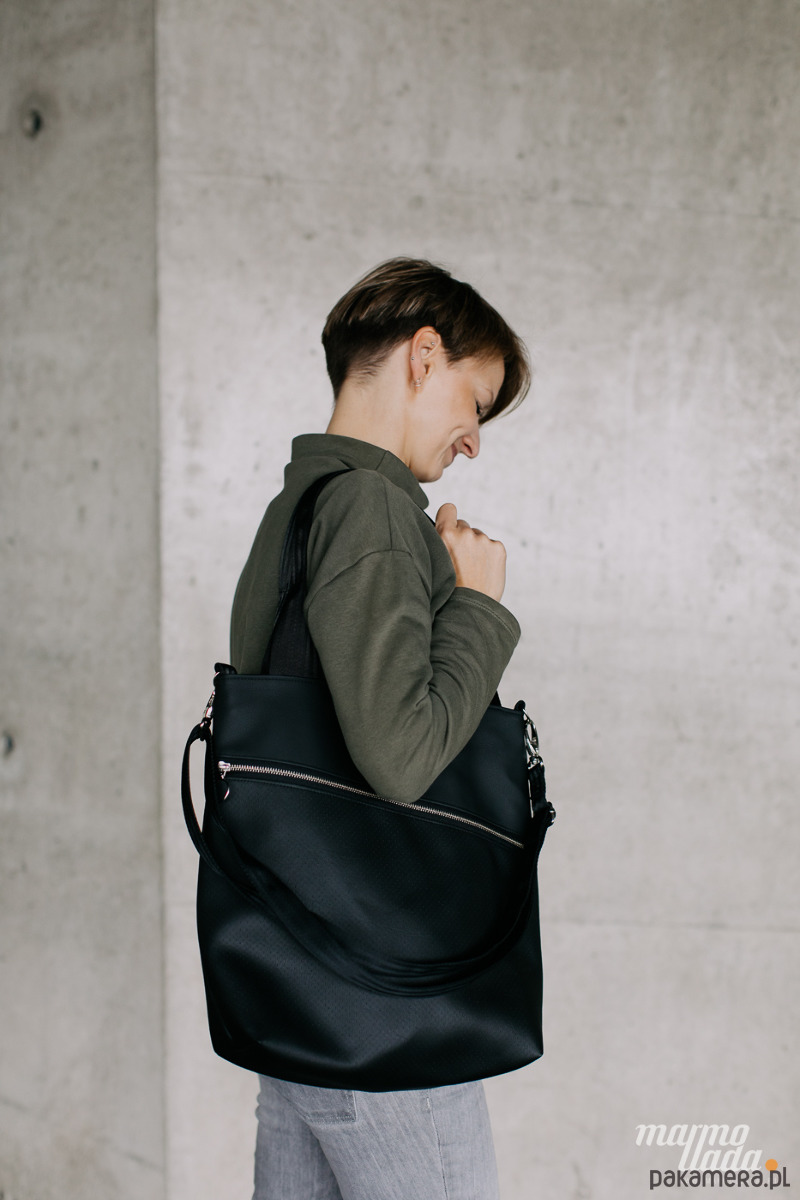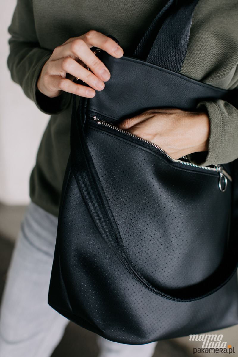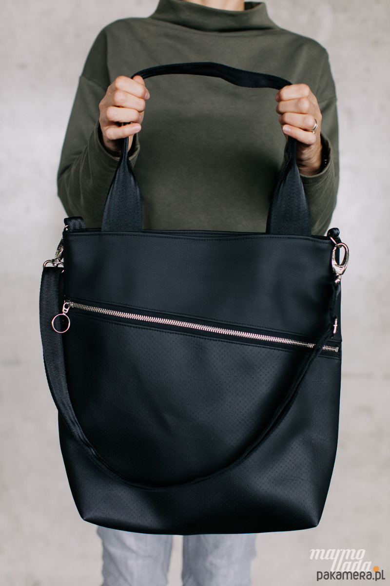 Klasyczna, prostokątna torebka, wykonana z tkaniny tapicerskiej: czarnej gładkiej połączonej z czarną tkaniną z małymi dziurkami, obie bardzo przyjemne w dotyku. Torebka posiada regulowany pasek do noszenia torby na skos oraz uchwyty do noszenia na ramieniu wykonane z pasów samochodowych w kolorze czarnym. Na zewnątrz znajduje się spora kieszeń zapinana na metalowy zamek.