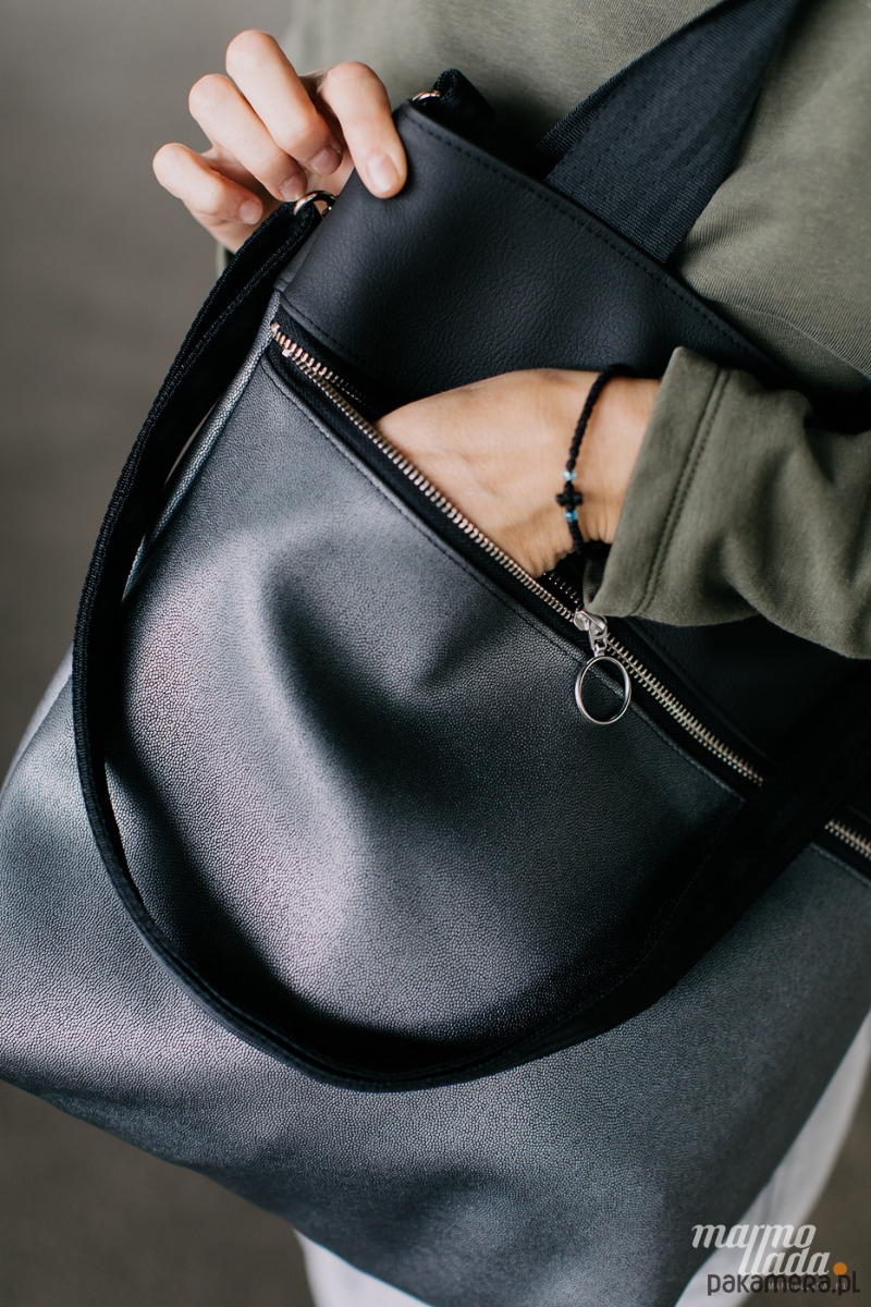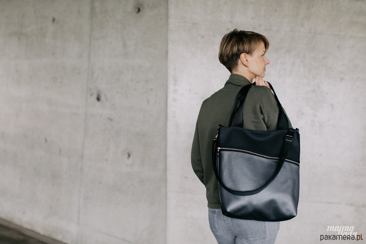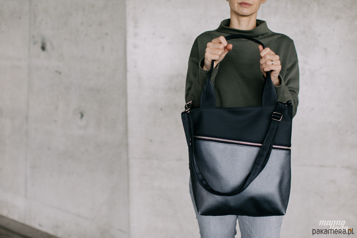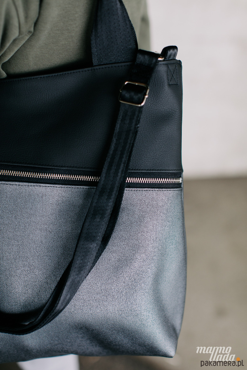 Klasyczna, prostokątna torebka, wykonana z tkaniny samochodowej: czarnej gładkiej połączonej z miękką, połyskującą w srebrnym odcieniu tkaniną. Torebka posiada regulowany pasek do noszenia torby na skos oraz uchwyty do noszenia na ramieniu wykonane z pasów samochodowych w kolorze czarnym. Na zewnątrz znajduje się spora kieszeń zapinana na metalowy zamek.