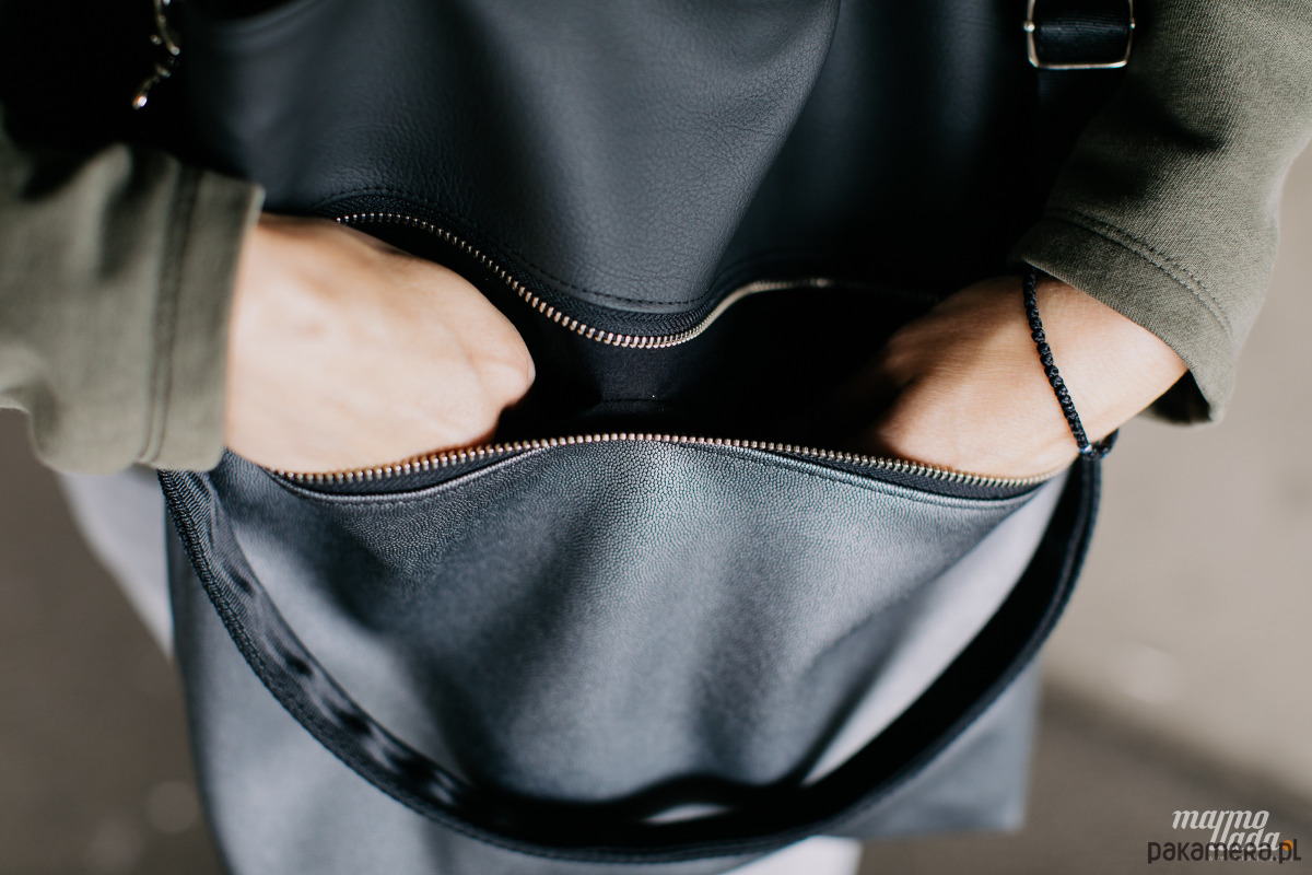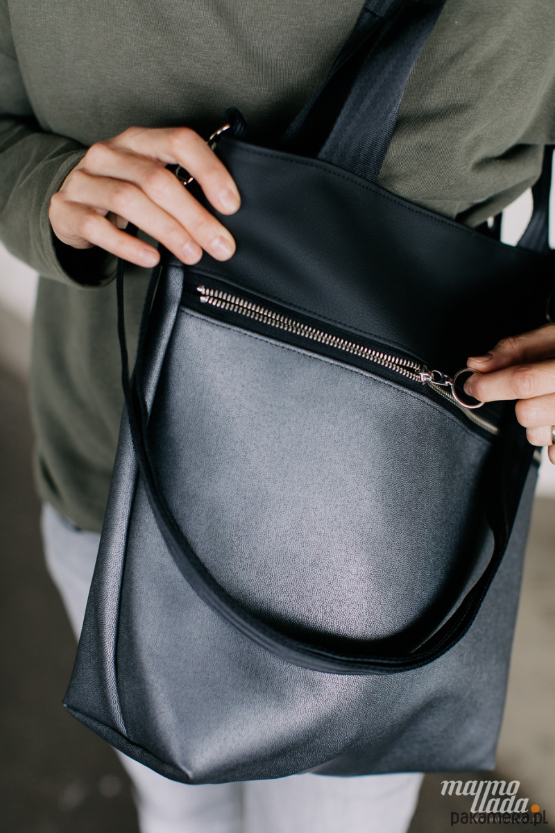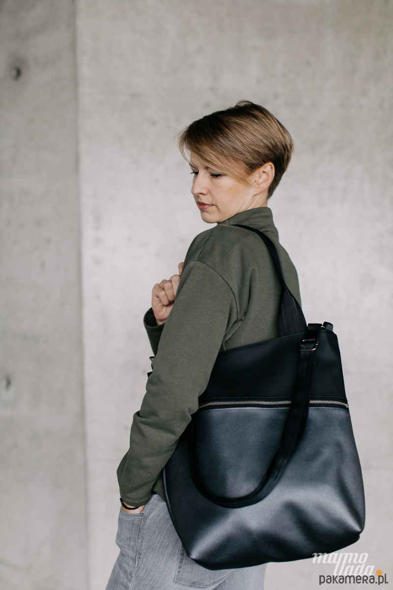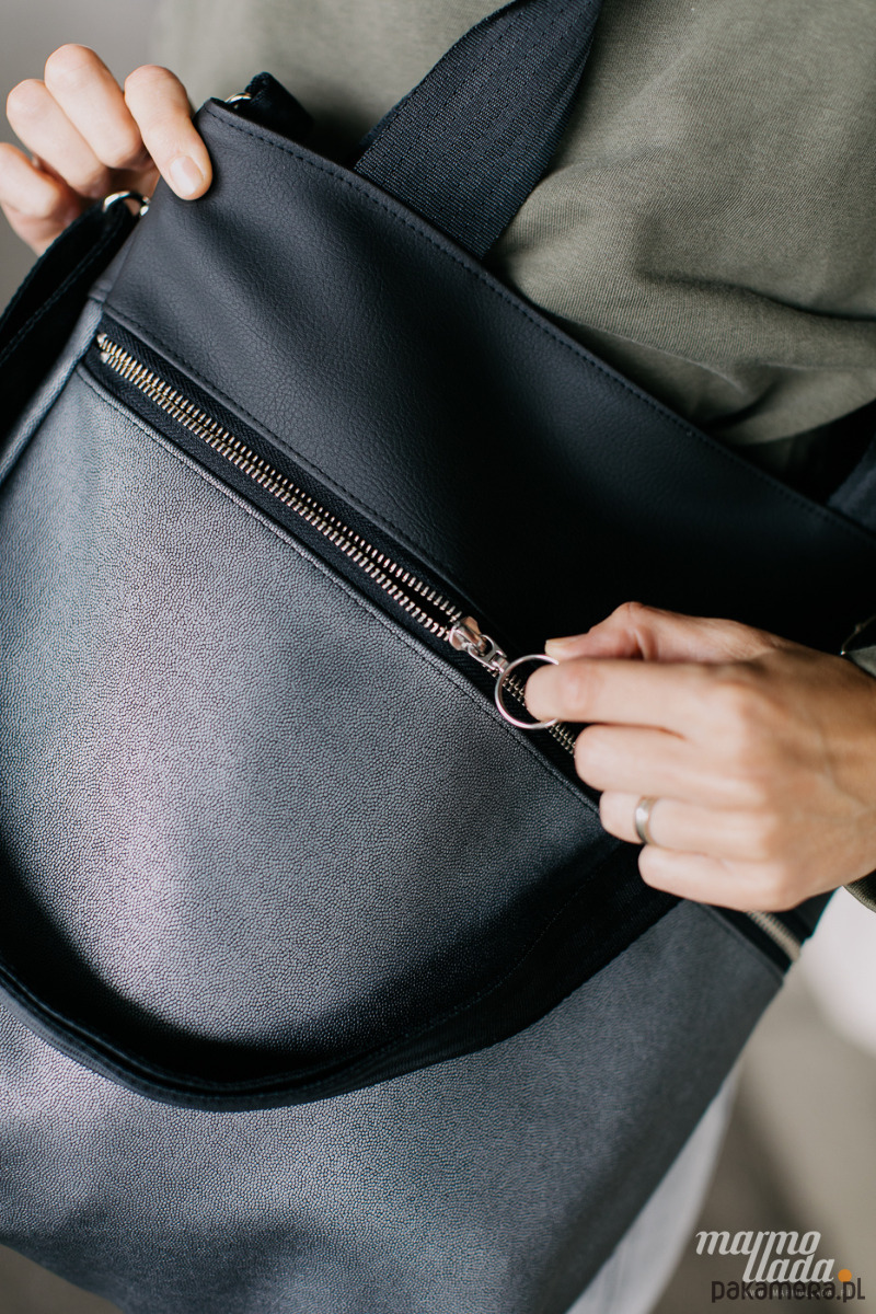 Klasyczna, prostokątna torebka, wykonana z tkaniny samochodowej: czarnej gładkiej połączonej z miękką, połyskującą w srebrnym odcieniu tkaniną. Torebka posiada regulowany pasek do noszenia torby na skos oraz uchwyty do noszenia na ramieniu wykonane z pasów samochodowych w kolorze czarnym. Na zewnątrz znajduje się spora kieszeń zapinana na metalowy zamek.