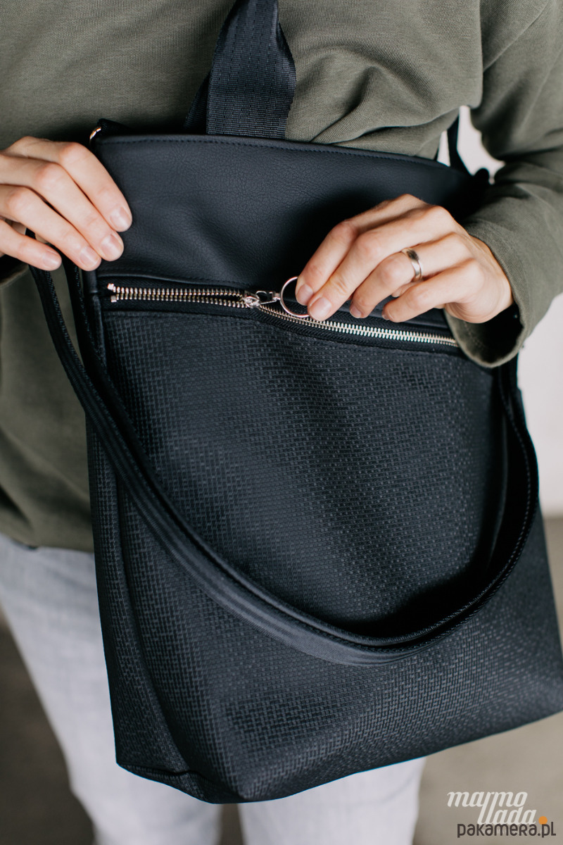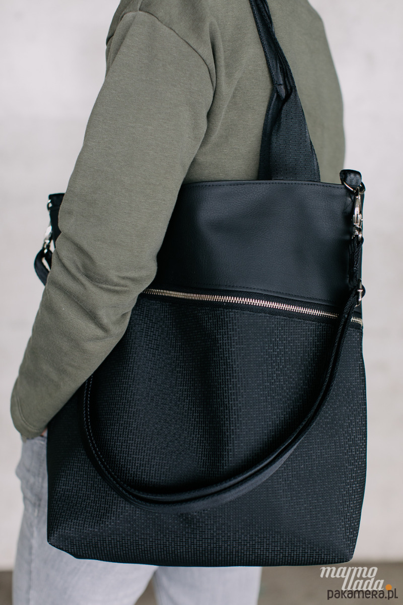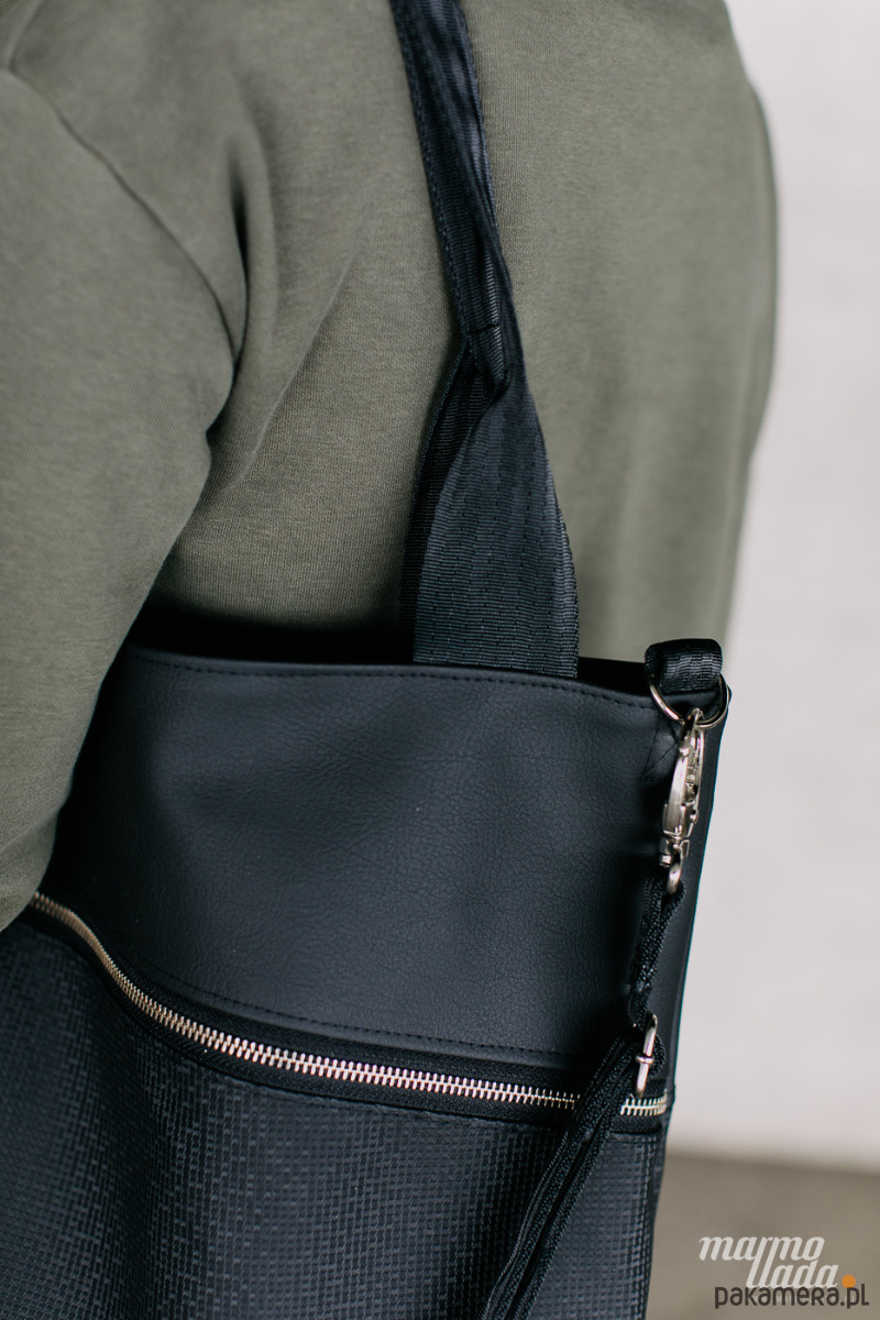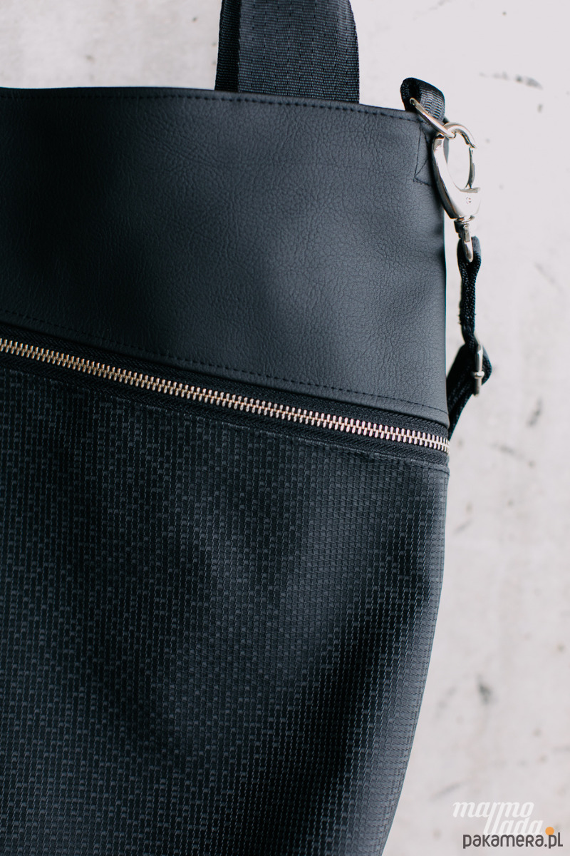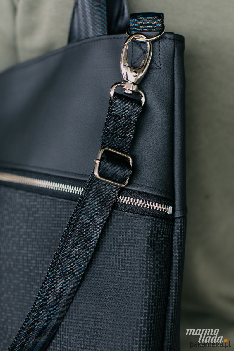 Klasyczna, prostokątna torebka, wykonana z tkaniny samochodowej: czarnej gładkiej połączonej z chropowatą i nieco szorstką w dotyku tkaniną w kolorze czarnym. Torebka posiada regulowany pasek do noszenia torby na skos oraz uchwyty do noszenia na ramieniu wykonane z pasów samochodowych w kolorze czarnym. Na zewnątrz znajduje się spora kieszeń zapinana na metalowy zamek.