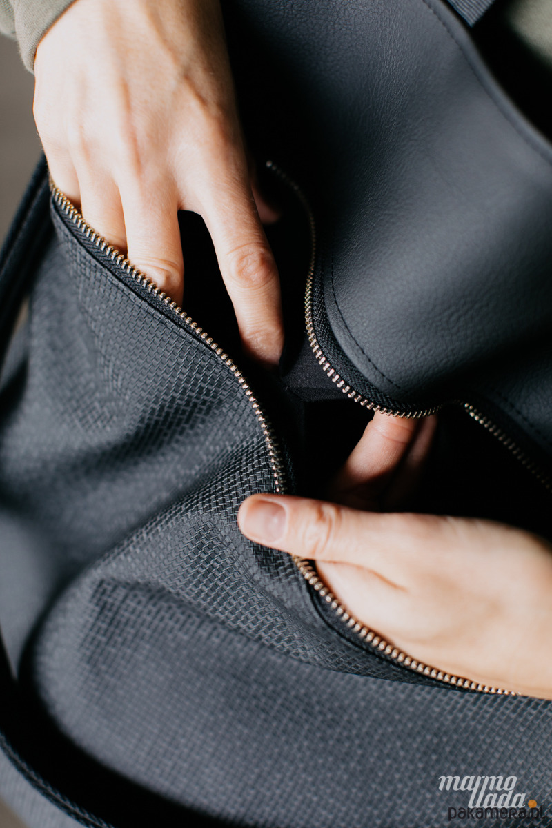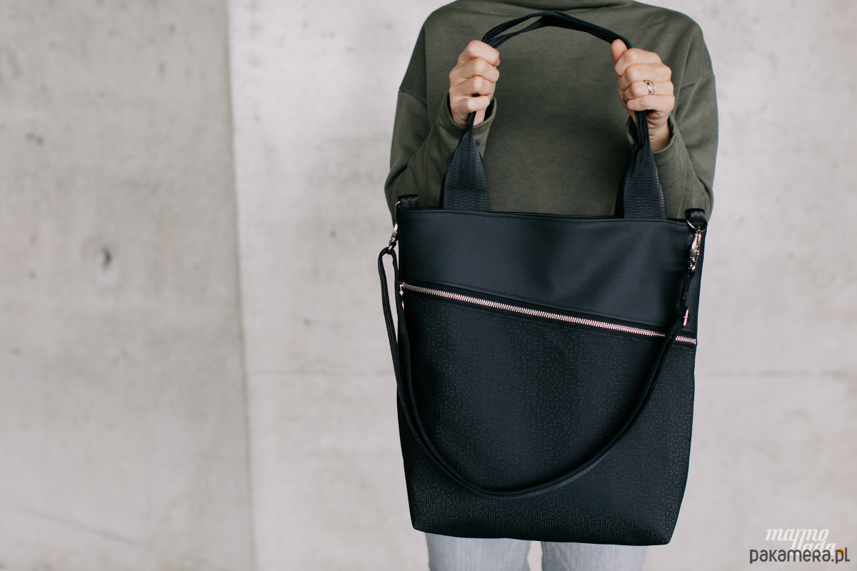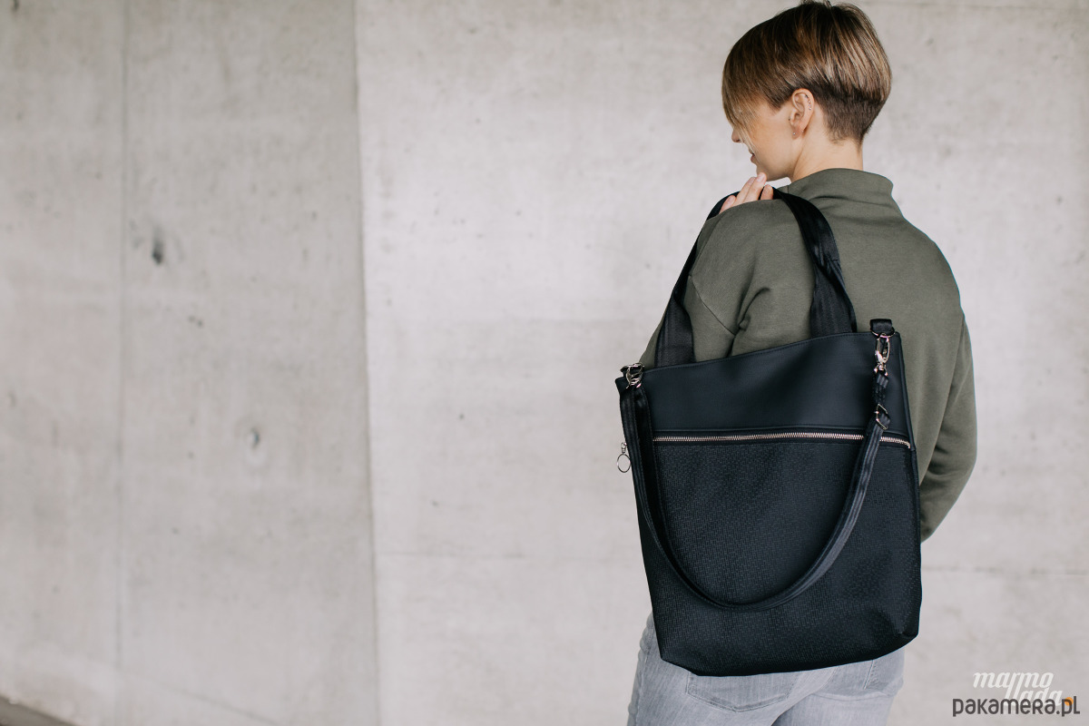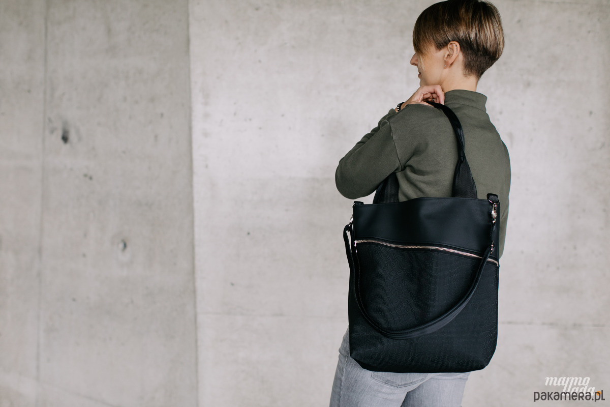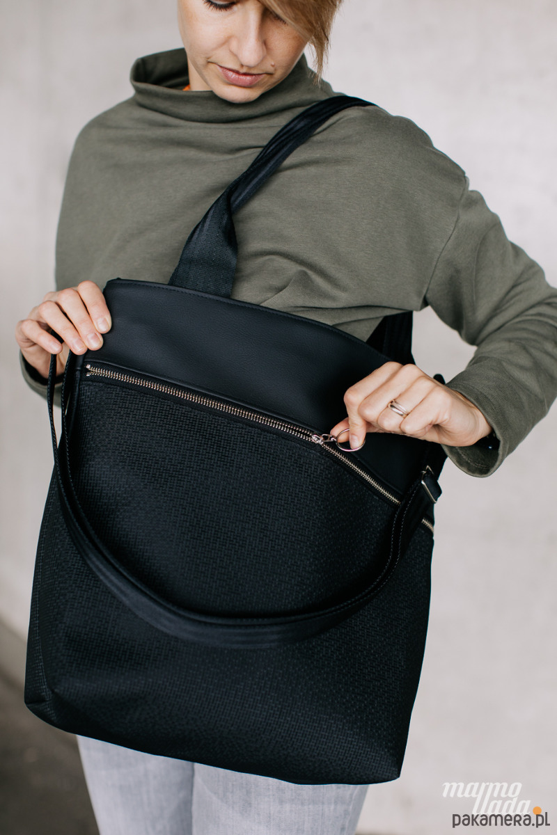Klasyczna, prostokątna torebka, wykonana z tkaniny samochodowej: czarnej gładkiej połączonej z chropowatą i nieco szorstką w dotyku tkaniną w kolorze czarnym. Torebka posiada regulowany pasek do noszenia torby na skos oraz uchwyty do noszenia na ramieniu wykonane z pasów samochodowych w kolorze czarnym. Na zewnątrz znajduje się spora kieszeń zapinana na metalowy zamek.