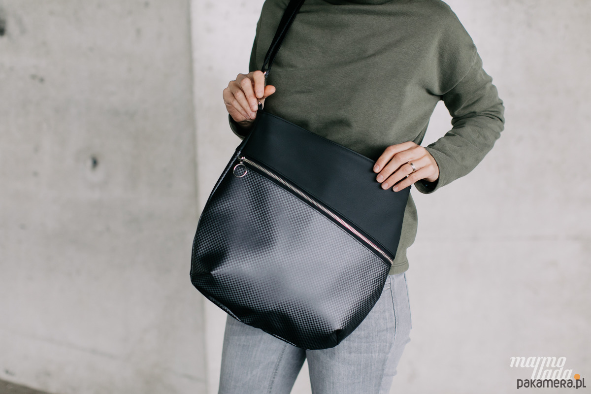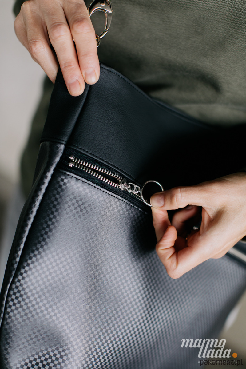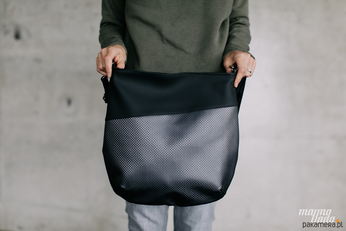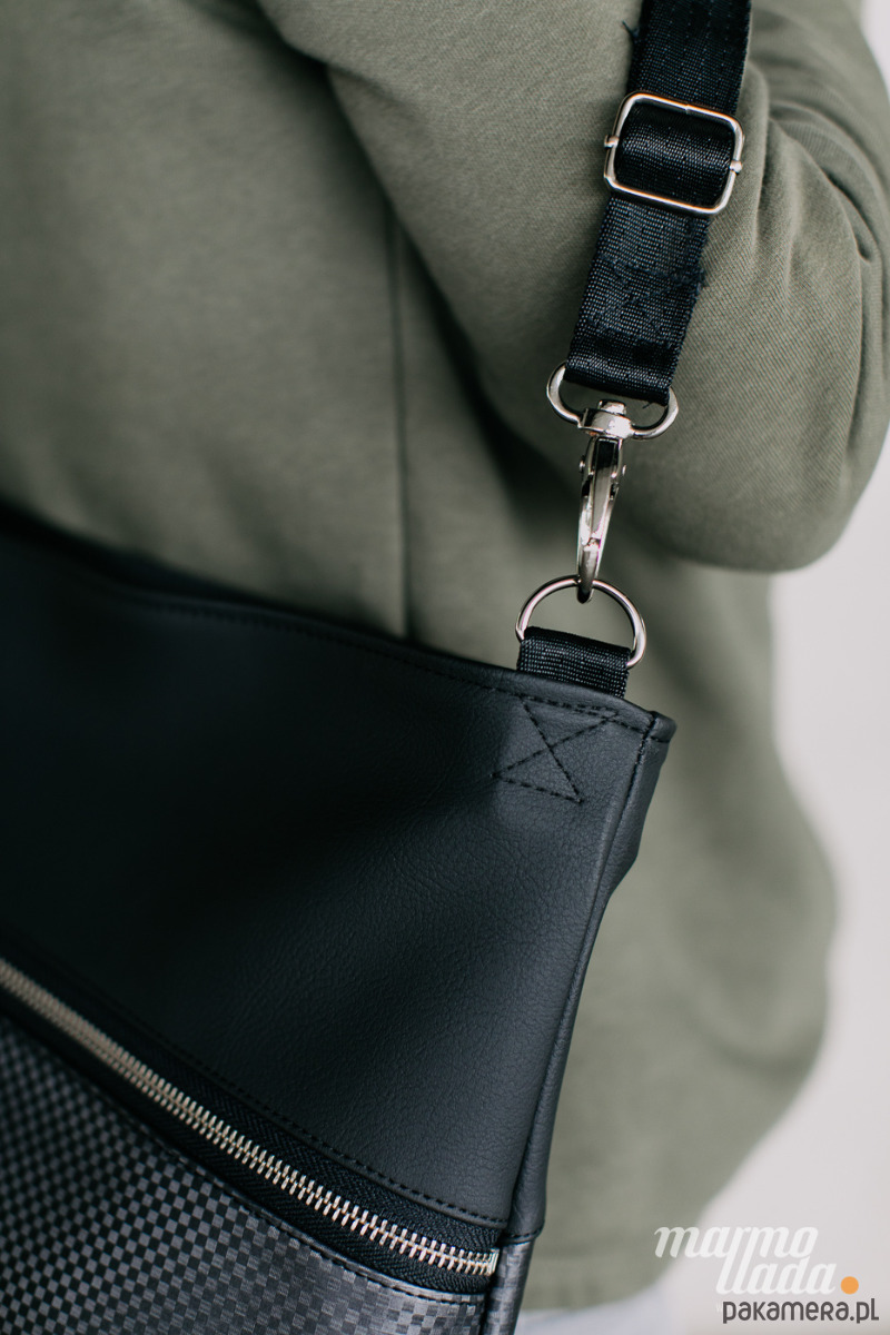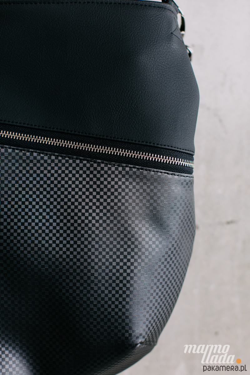 Niewielka torebka o półokrągłym kształcie, wykonana z tkaniny tapicerskiej: czarnej gładkiej połączonej z połyskującą i równie miłą w dotyku tkaniną o we wzór szachownicy w kolorze srebrnym. Torebka posiada regulowany pasek do noszenia torby na skos wykonany z pasów samochodowych w kolorze czarnym. Na zewnątrz znajduje się spora kieszeń zapinana na metalowy zamek.