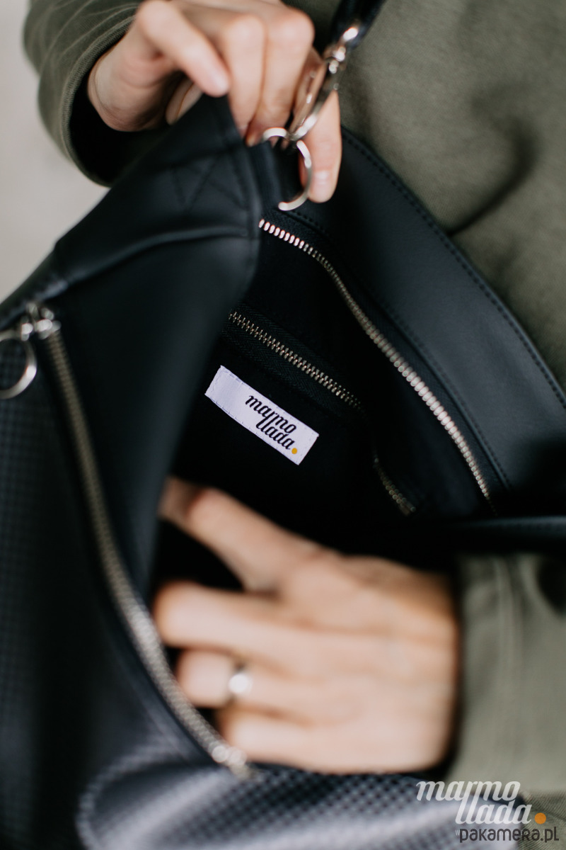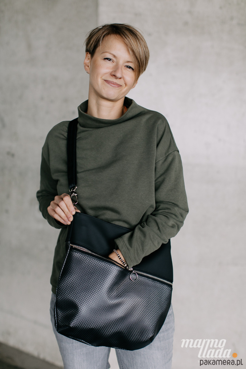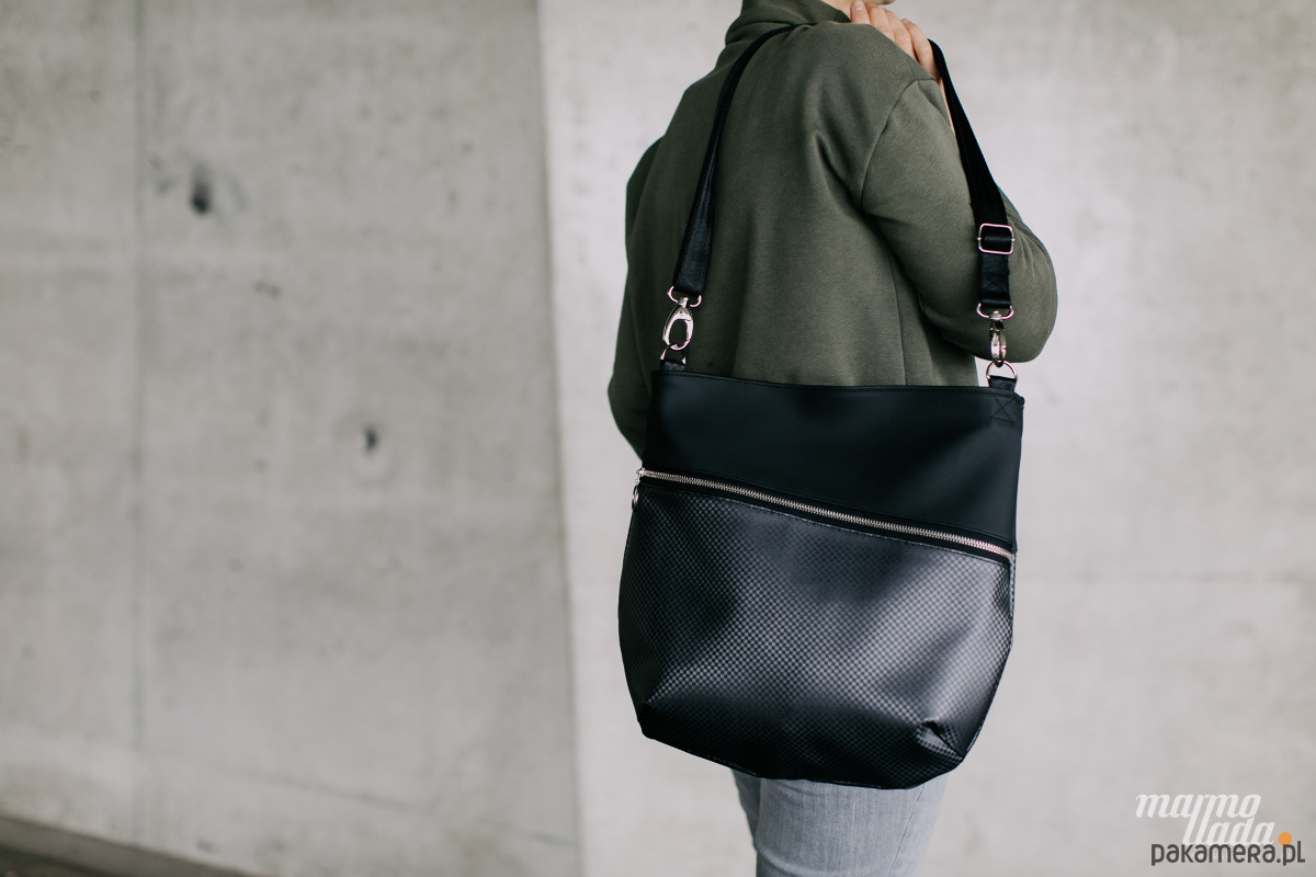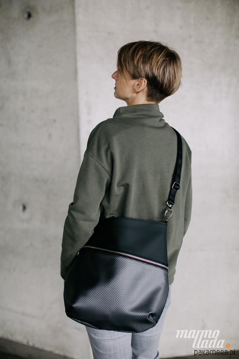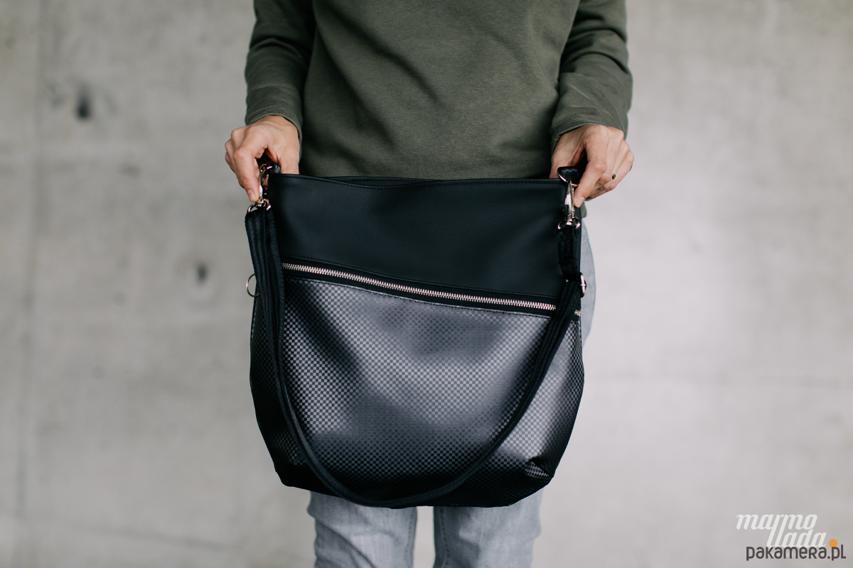 Niewielka torebka o półokrągłym kształcie, wykonana z tkaniny tapicerskiej: czarnej gładkiej połączonej z połyskującą i równie miłą w dotyku tkaniną o we wzór szachownicy w kolorze srebrnym. Torebka posiada regulowany pasek do noszenia torby na skos wykonany z pasów samochodowych w kolorze czarnym. Na zewnątrz znajduje się spora kieszeń zapinana na metalowy zamek.