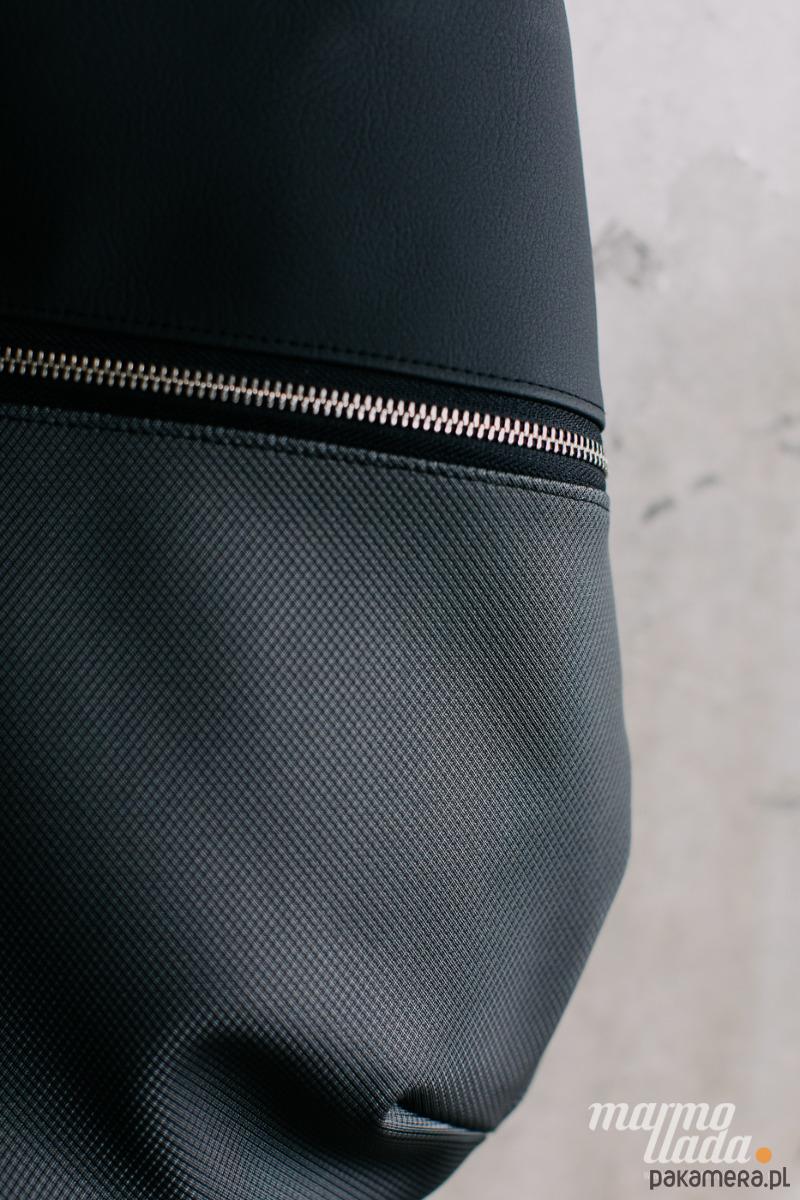 Niewielka torebka o półokrągłym kształcie, wykonana z tkaniny tapicerskiej: czarnej gładkiej połączonej z szarą, mieniącą się tkaniną w liczne skośnie przecinające się linie przypominające diamenty, obie miłe w dotyku. Torebka posiada regulowany pasek do noszenia torby na skos wykonany z pasów samochodowych w kolorze czarnym. Na zewnątrz znajduje się spora kieszeń zapinana na metalowy zamek.