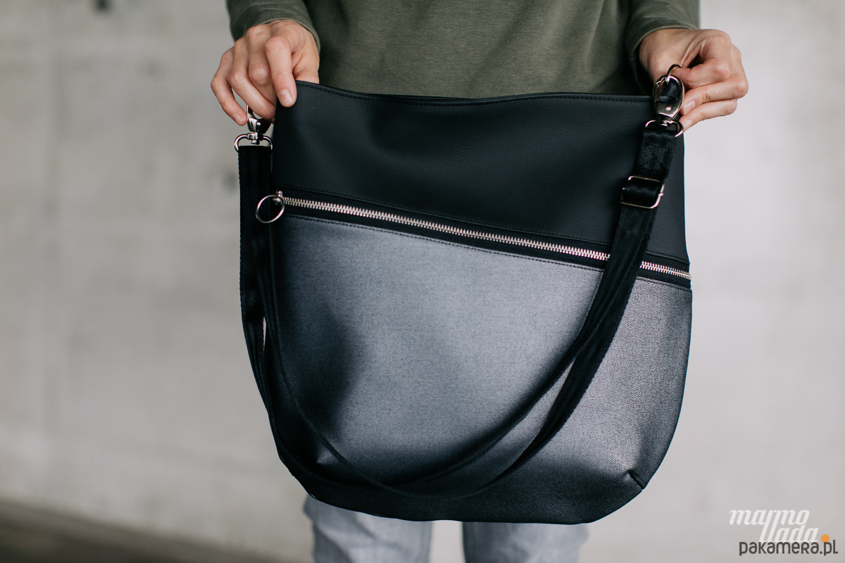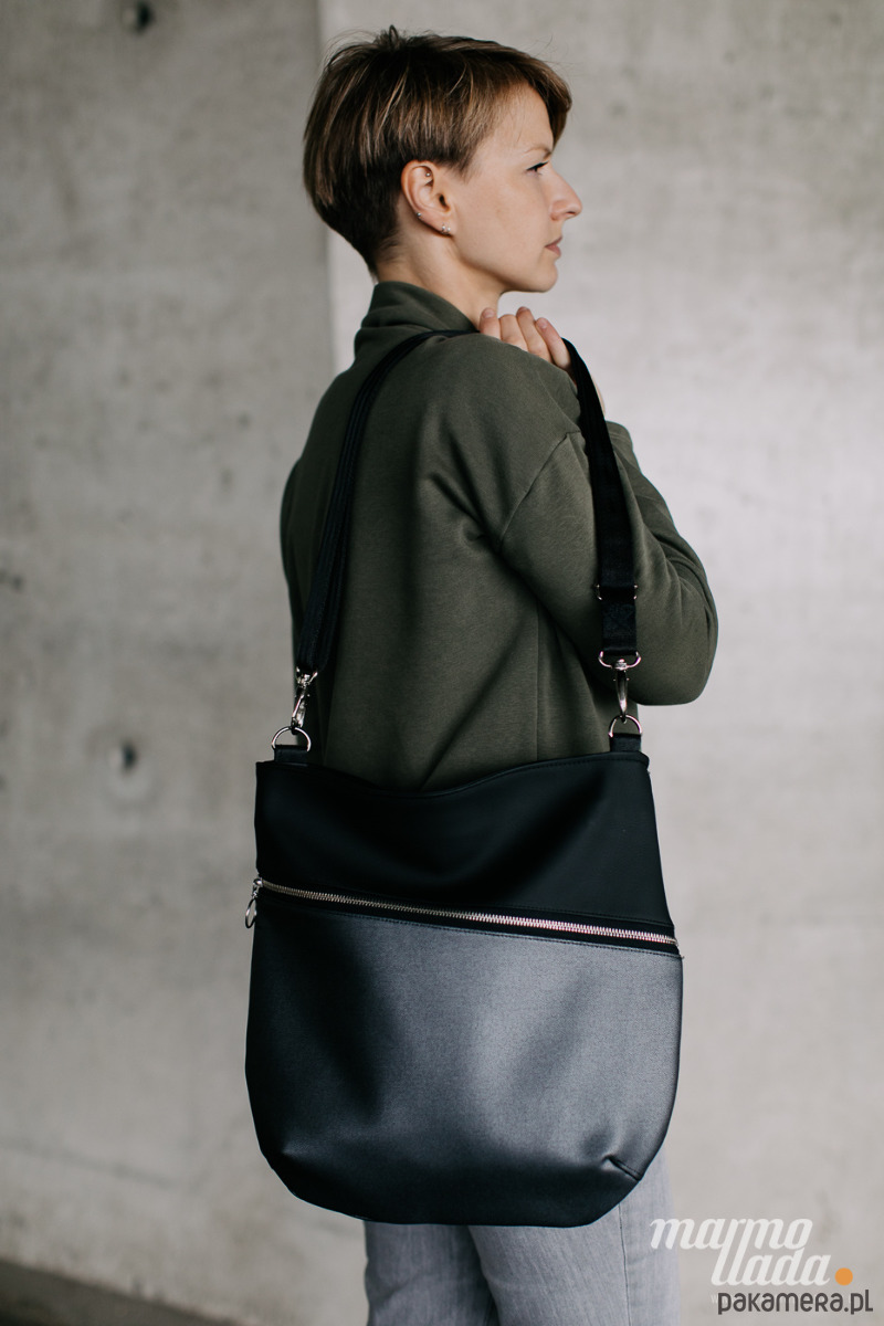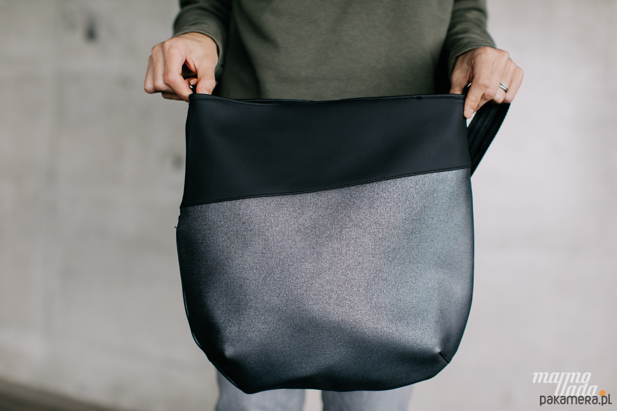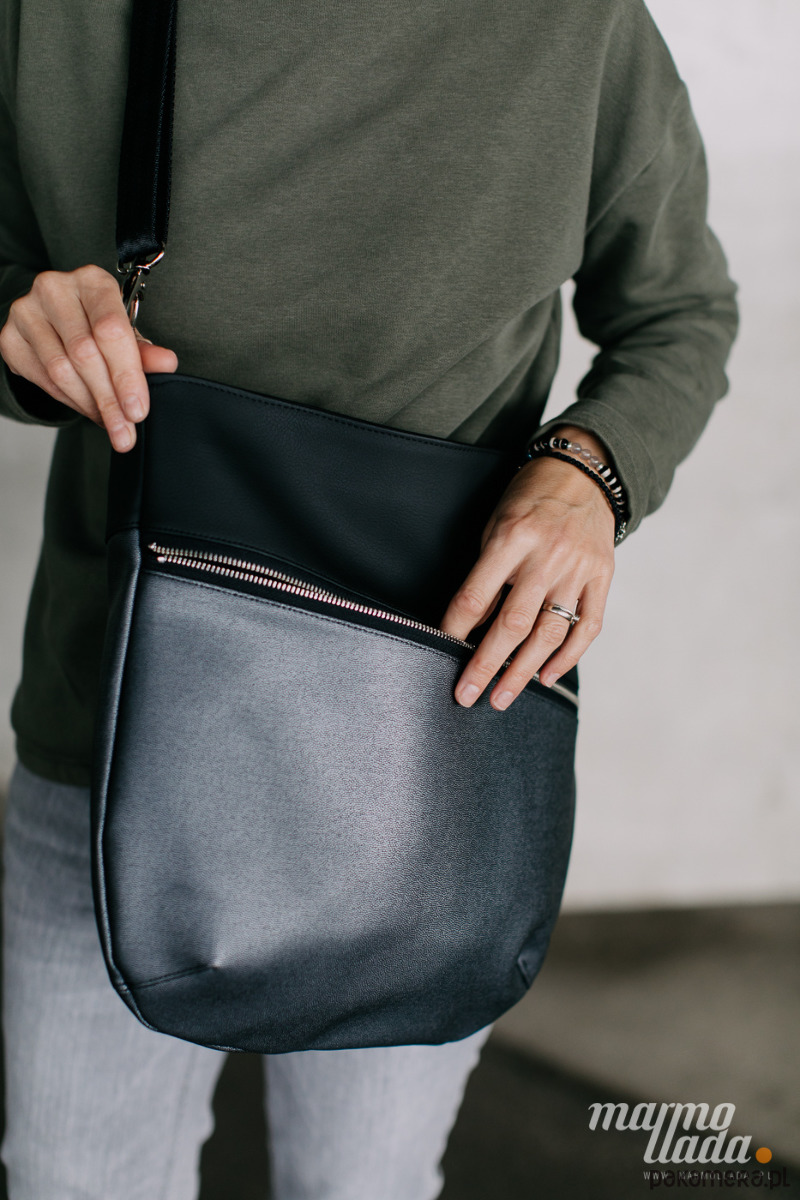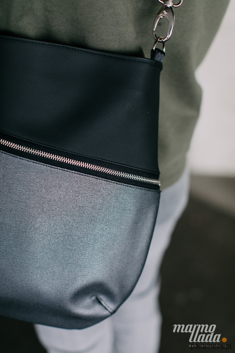 Niewielka torebka o półokrągłym kształcie, wykonana z tkaniny samochodowej: czarnej gładkiej połączonej z połyskującą i miłą w dotyku tkaniną o we wzór pęcherzyków powietrza w kolorze srebrnym. Torebka posiada regulowany pasek do noszenia torby na skos wykonany z pasów samochodowych w kolorze czarnym. Na zewnątrz znajduje się spora kieszeń zapinana na metalowy zamek.