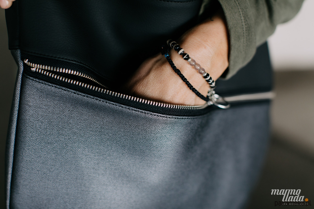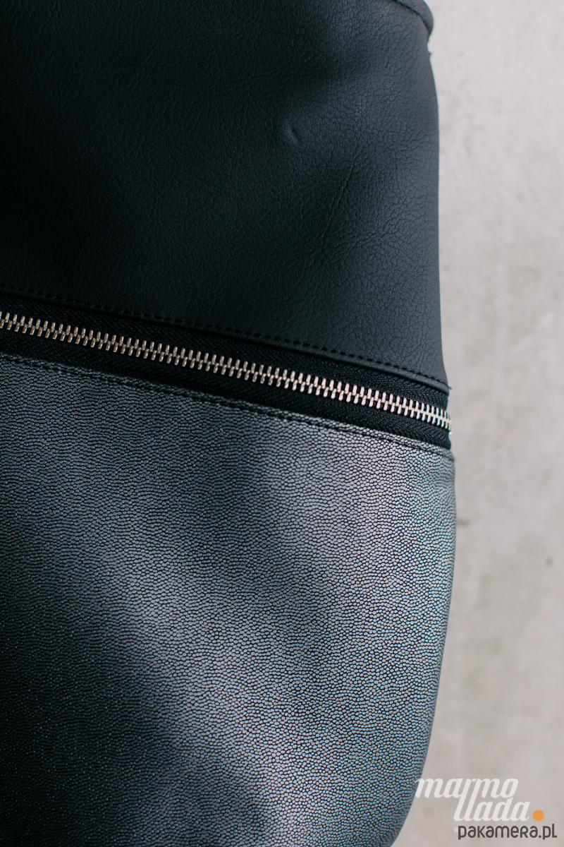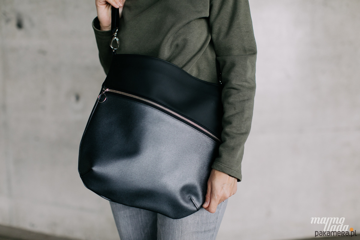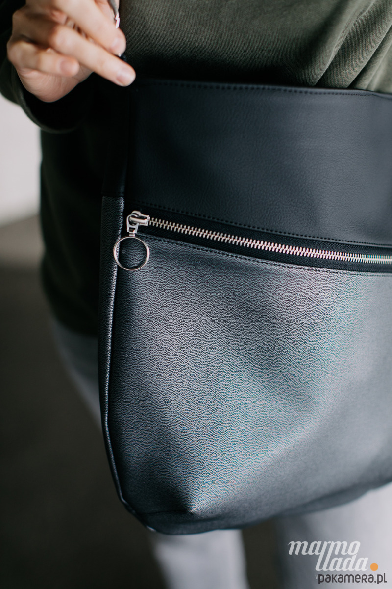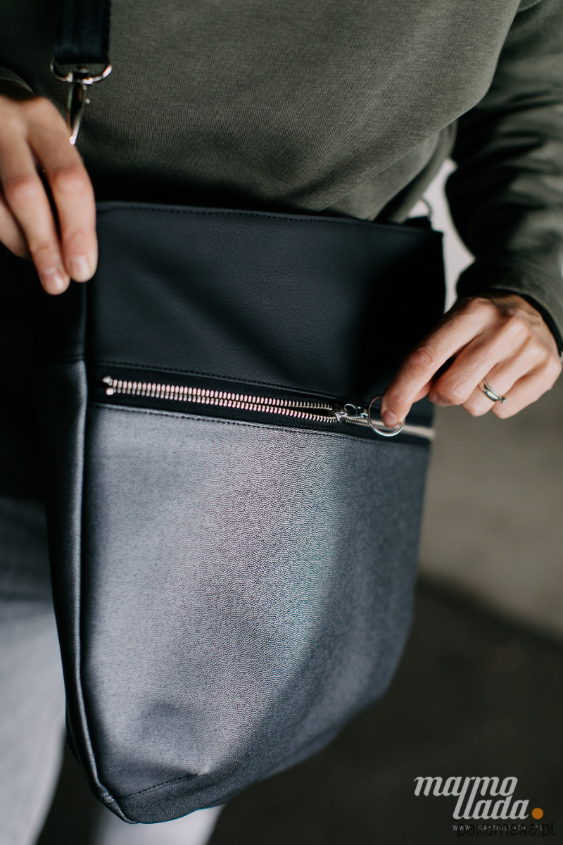Niewielka torebka o półokrągłym kształcie, wykonana z tkaniny samochodowej: czarnej gładkiej połączonej z połyskującą i miłą w dotyku tkaniną o we wzór pęcherzyków powietrza w kolorze srebrnym. Torebka posiada regulowany pasek do noszenia torby na skos wykonany z pasów samochodowych w kolorze czarnym. Na zewnątrz znajduje się spora kieszeń zapinana na metalowy zamek.