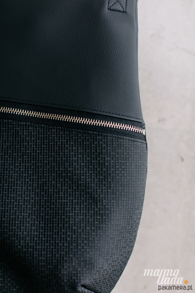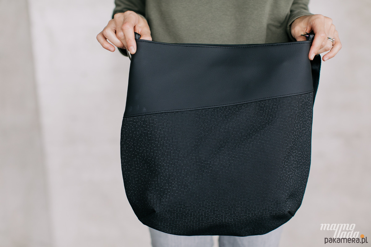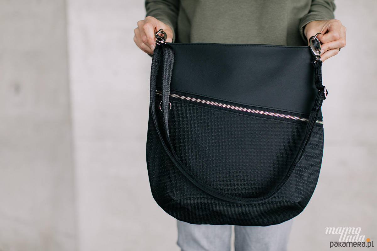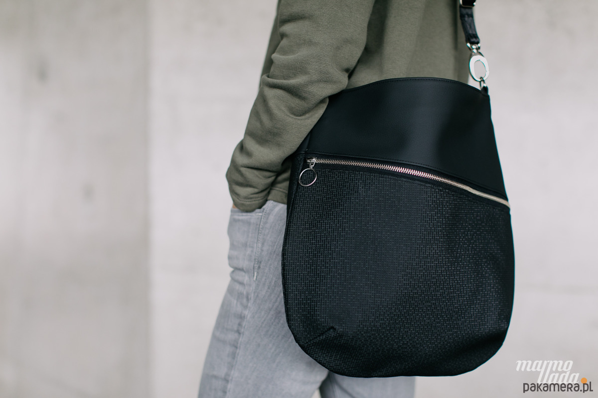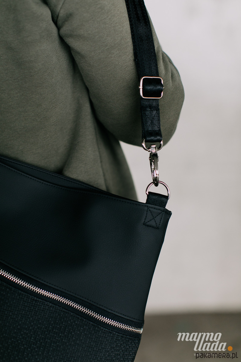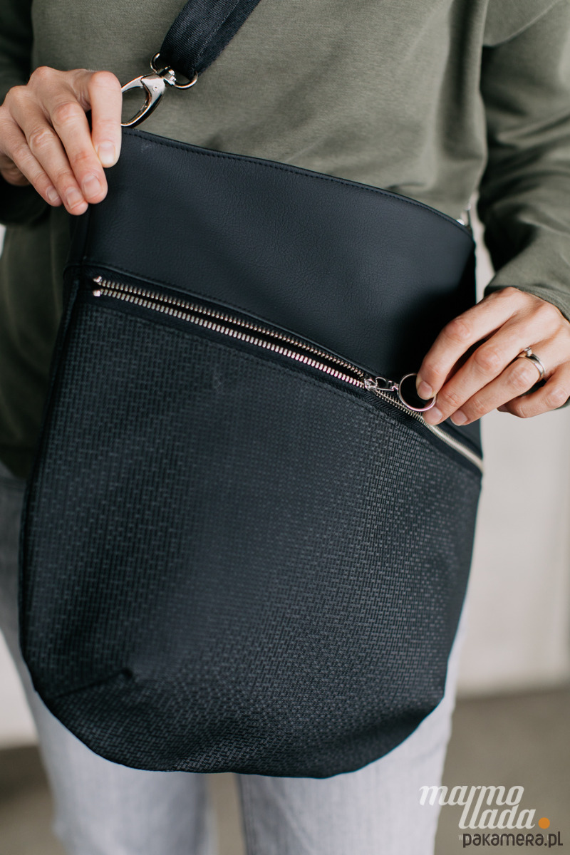 Niewielka torebka o półokrągłym kształcie, wykonana z tkaniny samochodowej: czarnej gładkiej połączonej z chropowatą i nieco szorstką w dotyku tkaniną w kolorze czarnym. Torebka posiada regulowany pasek do noszenia torby na skos wykonany z pasów samochodowych w kolorze czarnym. Na zewnątrz znajduje się spora kieszeń zapinana na metalowy zamek.