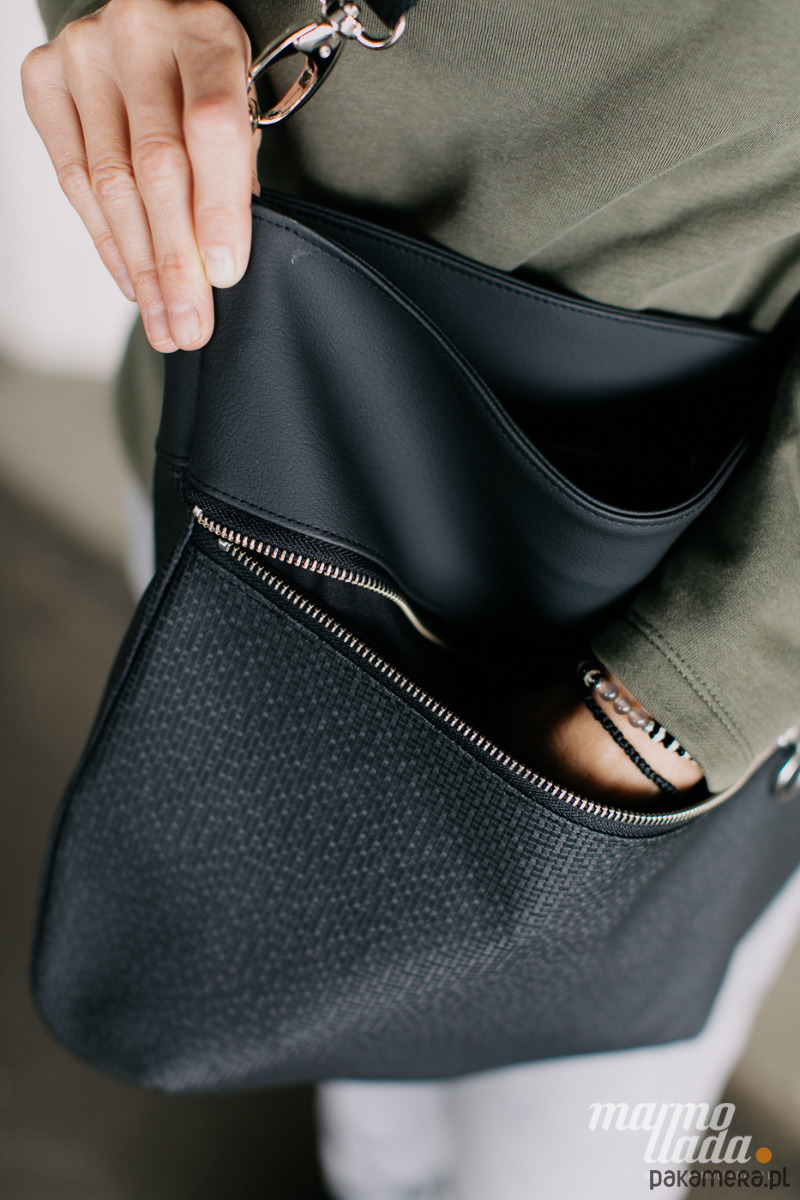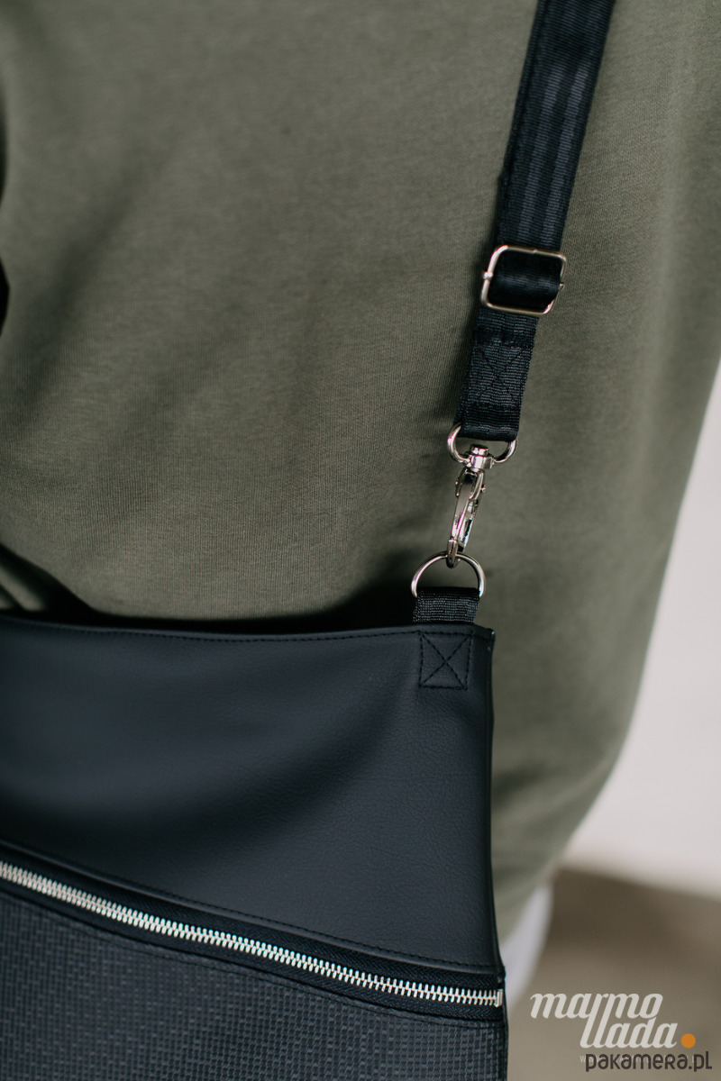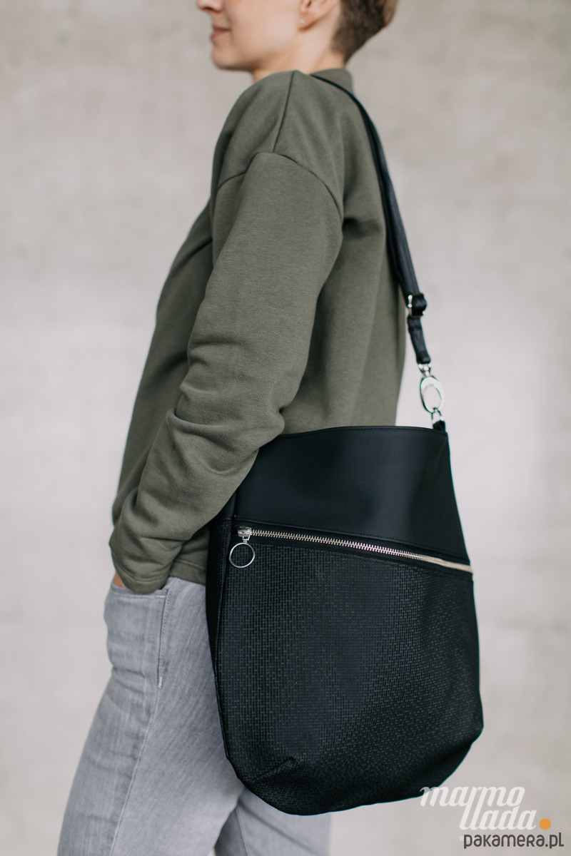 Niewielka torebka o półokrągłym kształcie, wykonana z tkaniny samochodowej: czarnej gładkiej połączonej z chropowatą i nieco szorstką w dotyku tkaniną w kolorze czarnym. Torebka posiada regulowany pasek do noszenia torby na skos wykonany z pasów samochodowych w kolorze czarnym. Na zewnątrz znajduje się spora kieszeń zapinana na metalowy zamek.