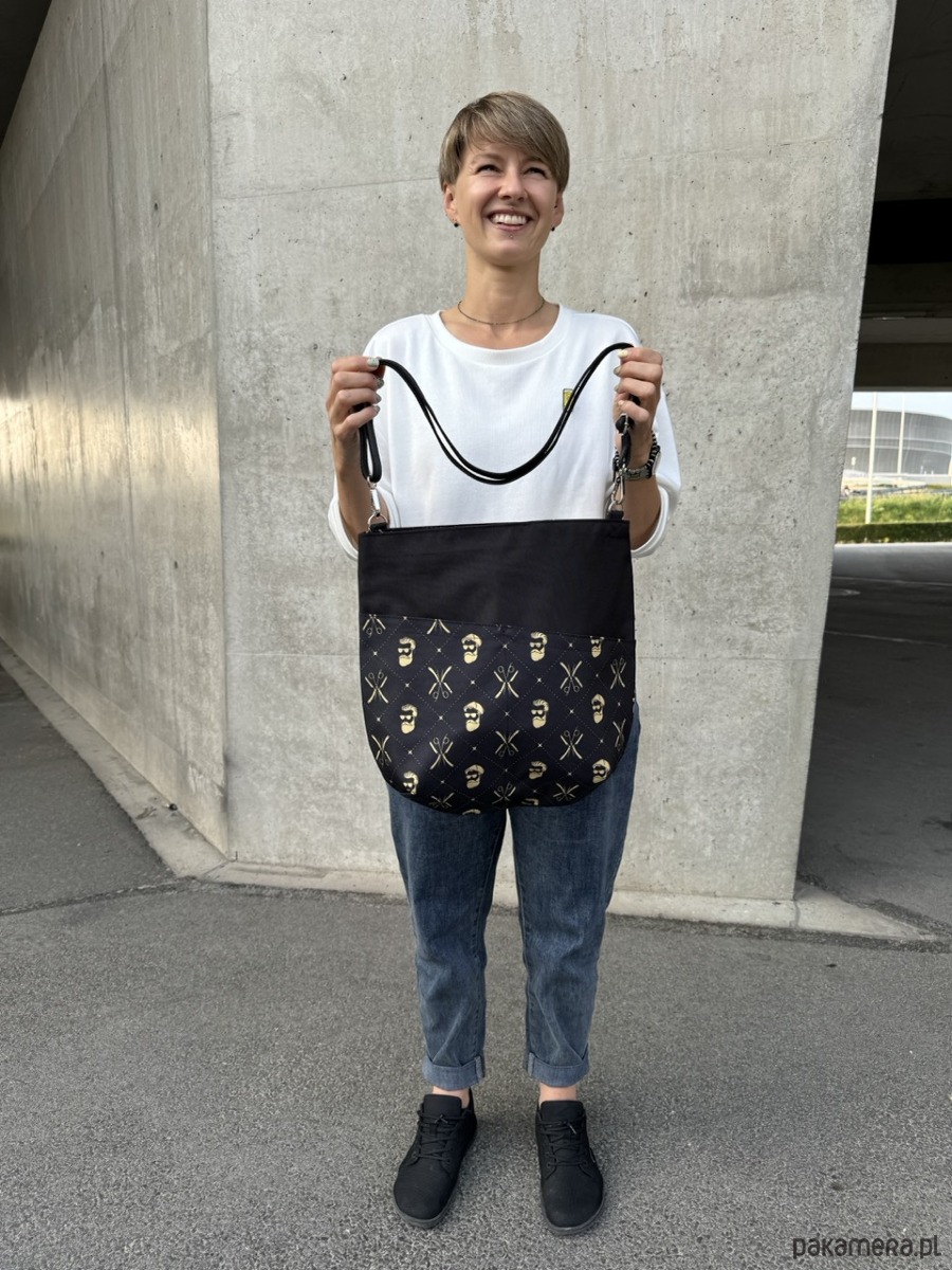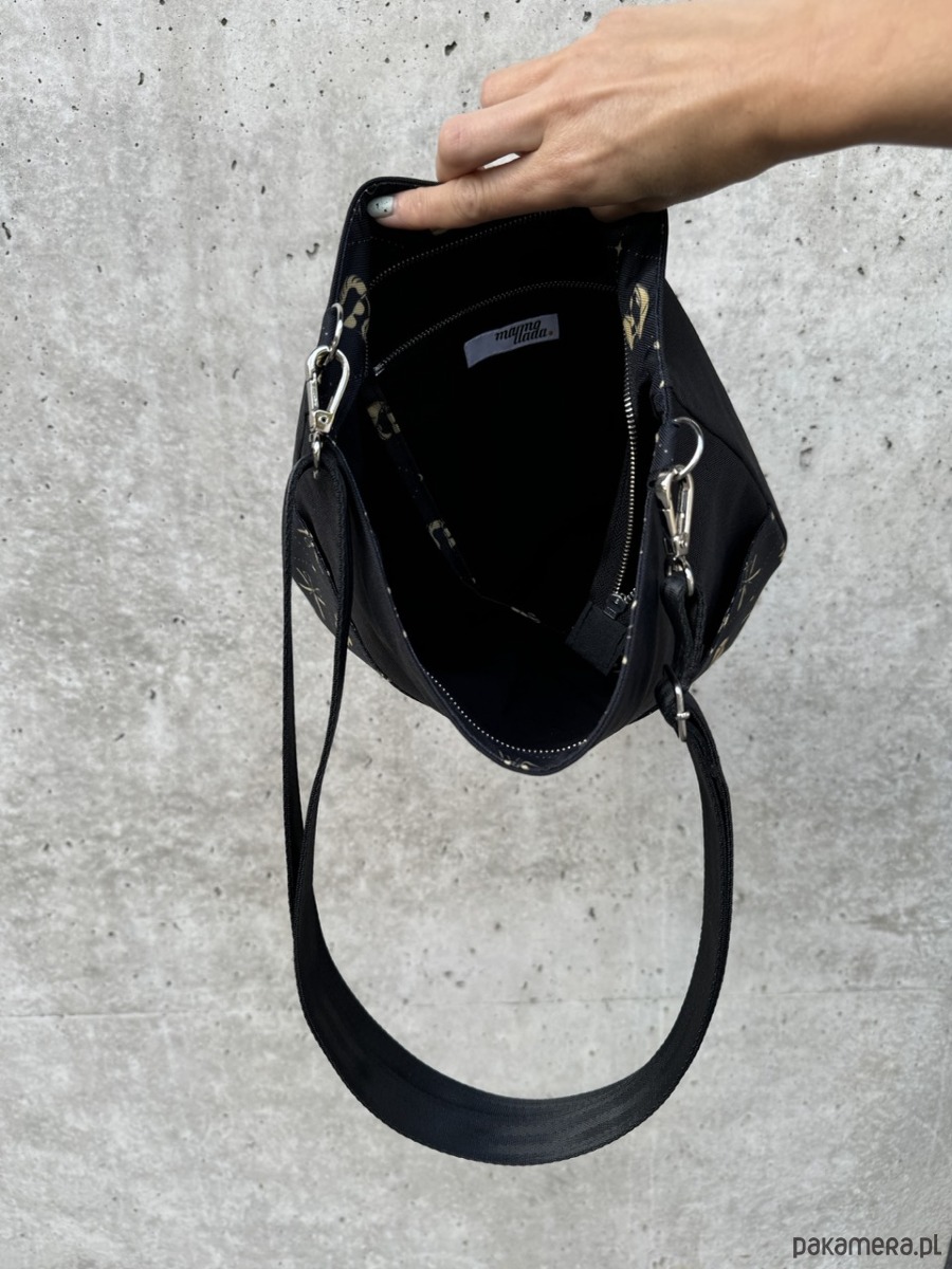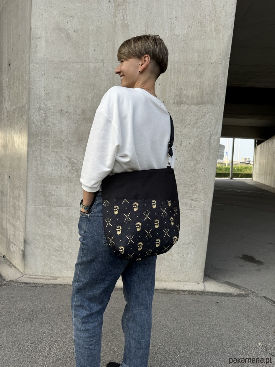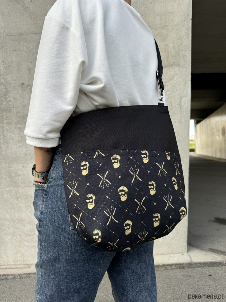 Średniej wielkości torebka o półokrągłym kształcie, wykonana z tkaniny wodoodpornej czarnej + wzór barbera. Na zewnątrz torebka ma 2 otwarte kieszenie, wewnątrz znajduje się czarna bawełniana podszewka, w niej kieszonka zapinana na metalowy zamek oraz pasek zakończony karabińczykiem do przypięcia kluczy lub portfela.