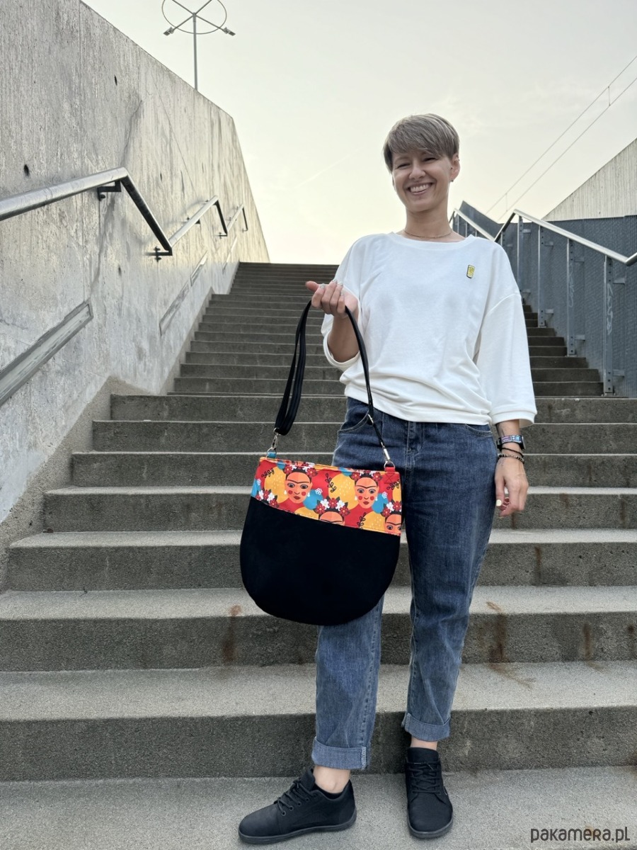 Średniej wielkości torebka o półokrągłym kształcie, uszyta z czarnej zamszowej tkaniny tapicerskiej (alkantara) z wzorzystym klinem z wodoodpornej tkaniny. Wewnątrz znajduje się czarna bawełniana podszewka, w niej kieszonka zapinana na metalowy zamek oraz pasek zakończony karabińczykiem do przypięcia kluczy lub portfela.