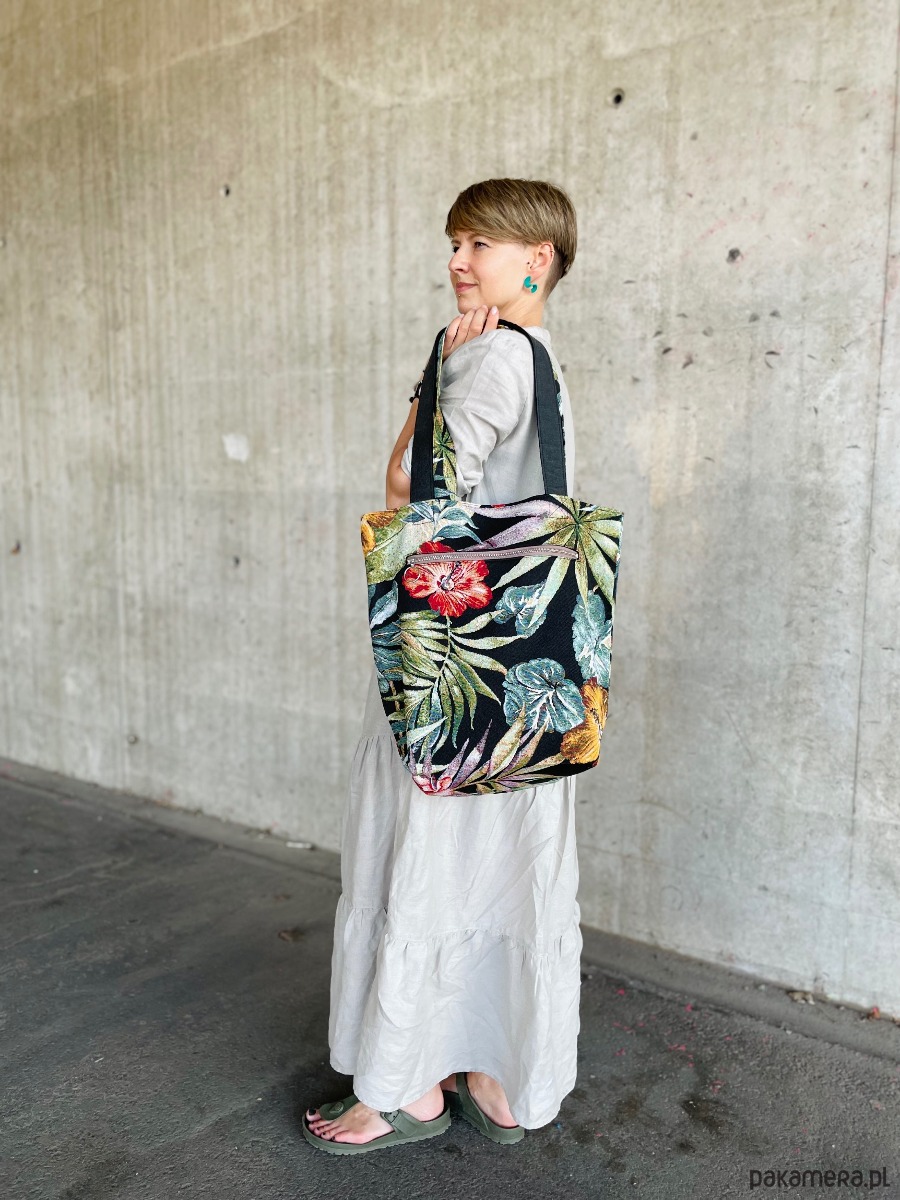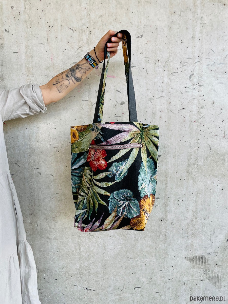 Torebka o prostokątnym kształcie na ramię, uszyta z grubej bawełnianej tkaniny tapicerskiej w kolorowe kwiaty i liście, wnętrze jest wykończone bawełnianą podszewką. Na zewnątrz posiada dużą kieszeń zapinaną na zamek.