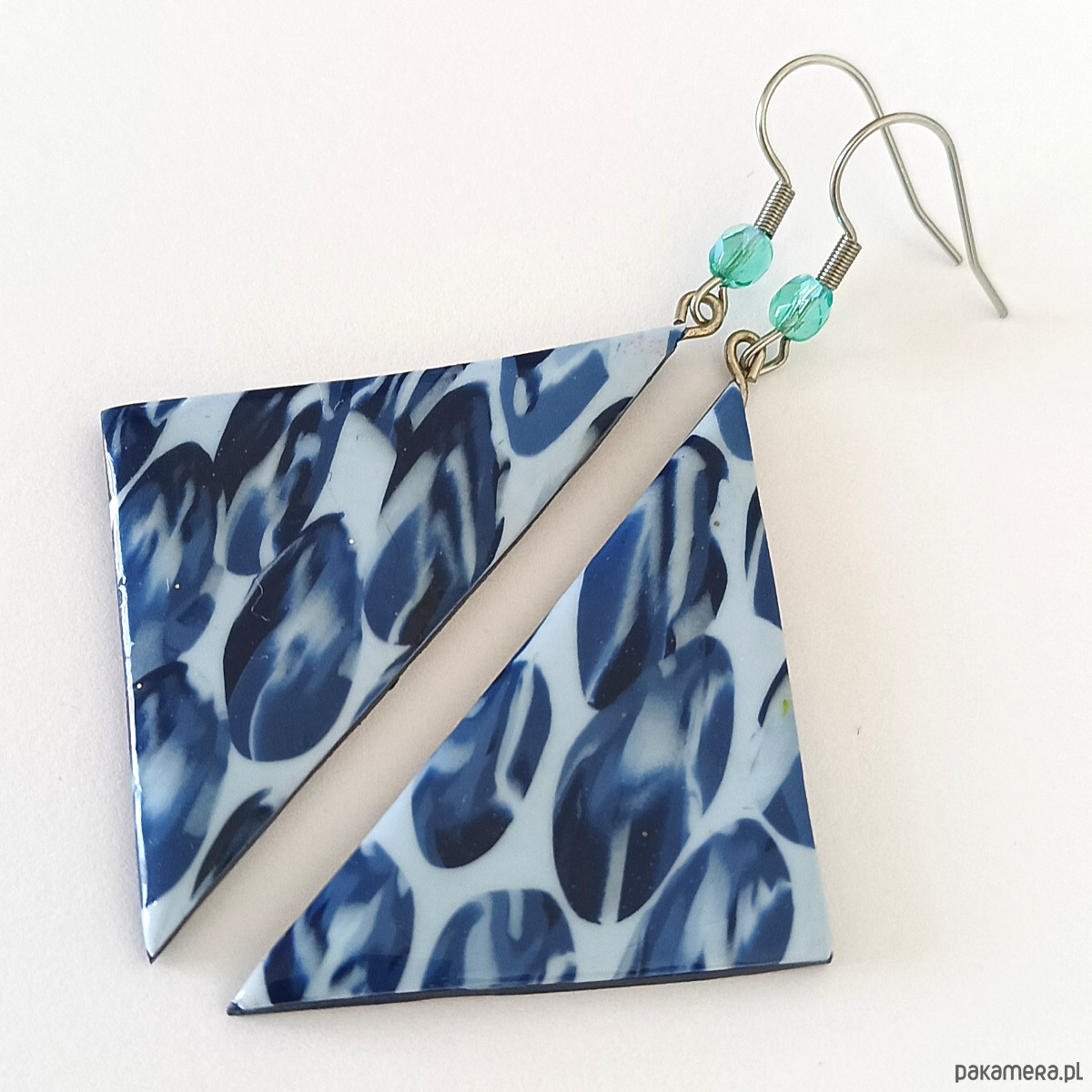 Ręcznie robione kolczyki z lekkiej glinki polimerowej w kształcie dużych trójkątów. Niebieska marmurkowa struktura nadaje im unikalny, nowoczesny charakter. Ta para jest jedyna w swoim rodzaju.