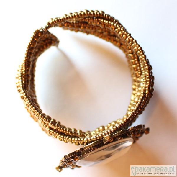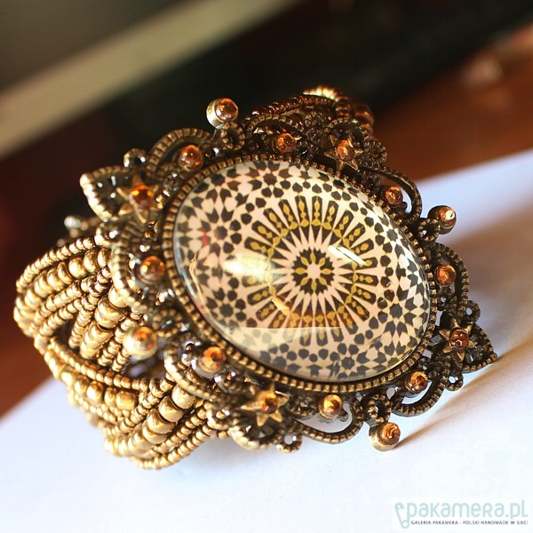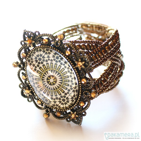 Autorska bransoleta z koralików w odcieniach brązu. Retro broszka na stylowej bazie w odcieniu starego złota ze szklanym kaboszonem, ozdobiona oryginalną marokańską mozaiką z Fezu, z kolekcji autorskich prac fotograficznych KEIT oraz bursztynowymi jetami.