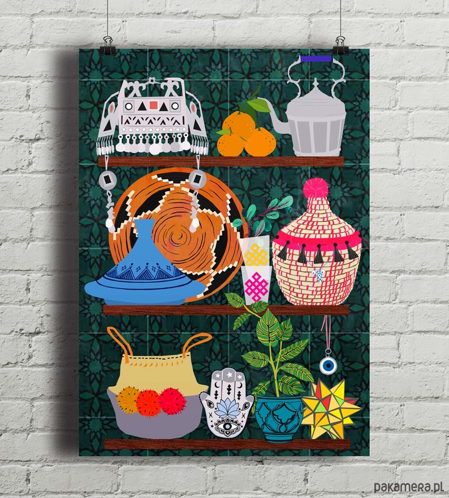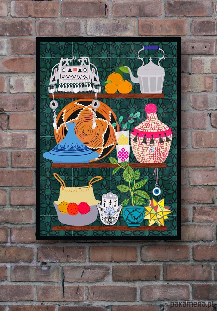 Plakat w stylu skandynawskim z autorską grafiką przedstawiającą kuchenne półki wypełnione marokańskimi naczyniami. Oryginalna dekoracja do wymarzonej kuchni. Zaprojektowany przez niemiecką artystkę Elisandrę Sevenstar.