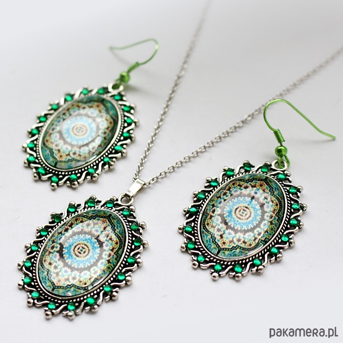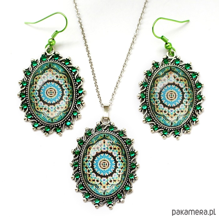 Autorskie kolczyki i wisiorek na bazie w odcieniu srebra ze szklanym kaboszonem, ozdobione oryginalną marokańską mozaiką z Fezu,z kolekcji autorskich prac fotograficznych KEIT, oraz szmaragdowymi cyrkonikami.