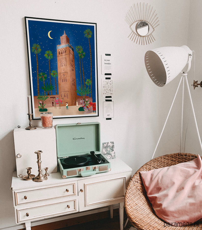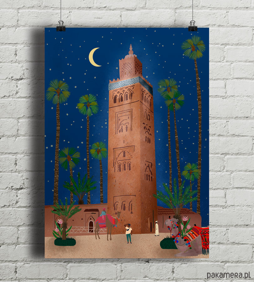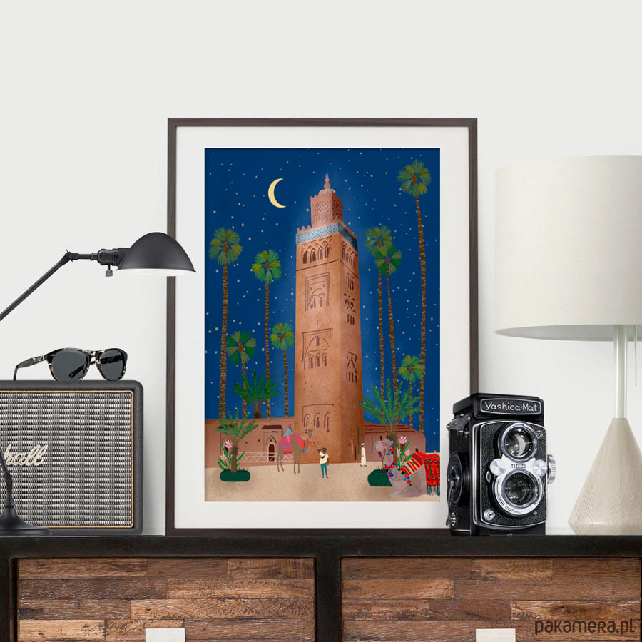 Plakat z autorską grafiką przedstawiający Meczet Księgarzy w Marrakeszu w Maroko. Zaprojektowany przez niemiecką artystkę Elisandrę Sevenstar.