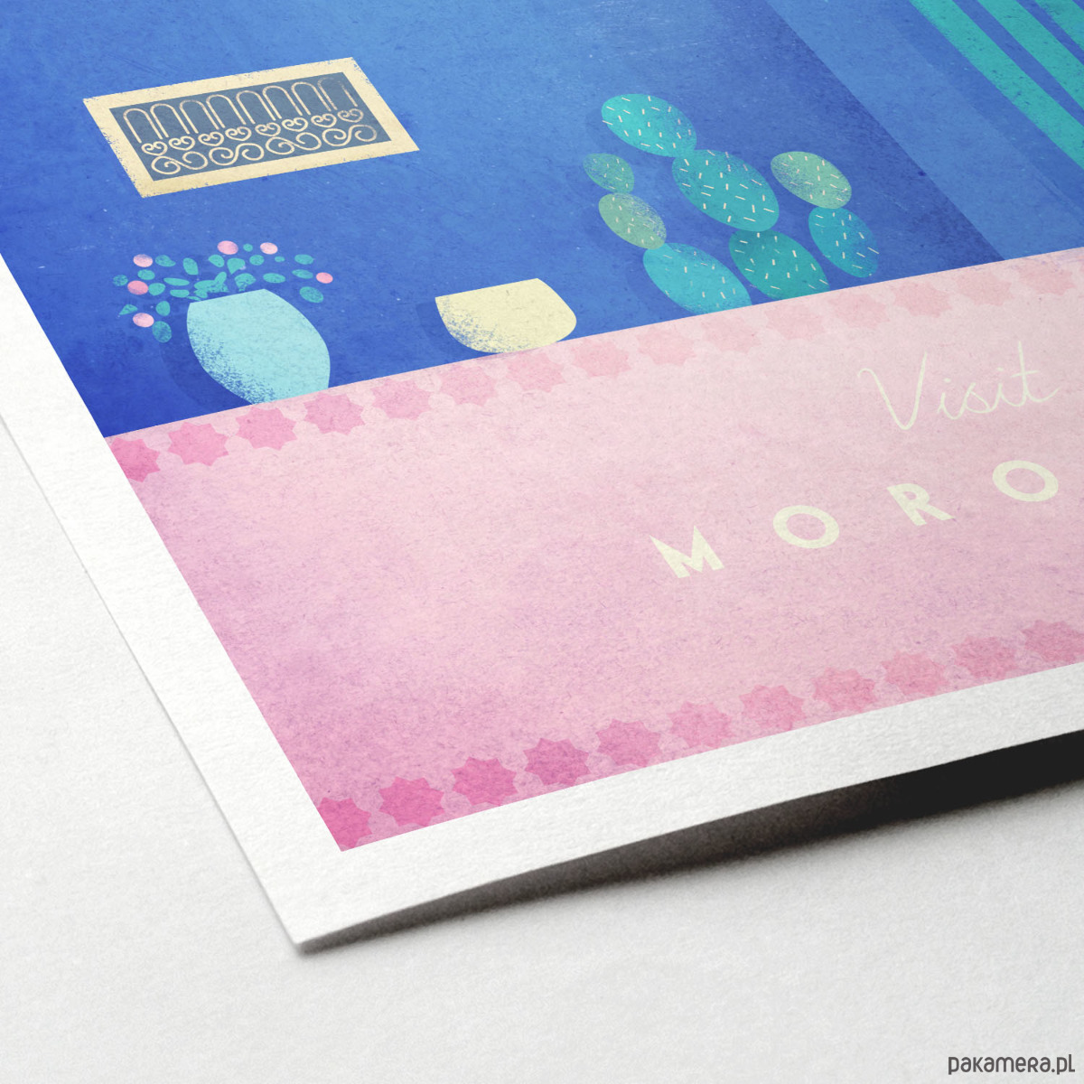 Plakat w stylu vintage przedstawiający różne gatunki kaktusów na tle charakterystycznej niebieskiej ściany w słynnych ogrodach Majorelle w Marakeszu, Maroko. Inspirowany plakatami podróżniczymi z lat 20-tych XX wieku.