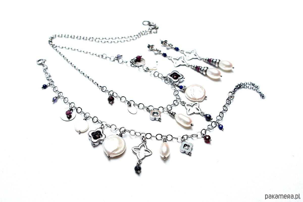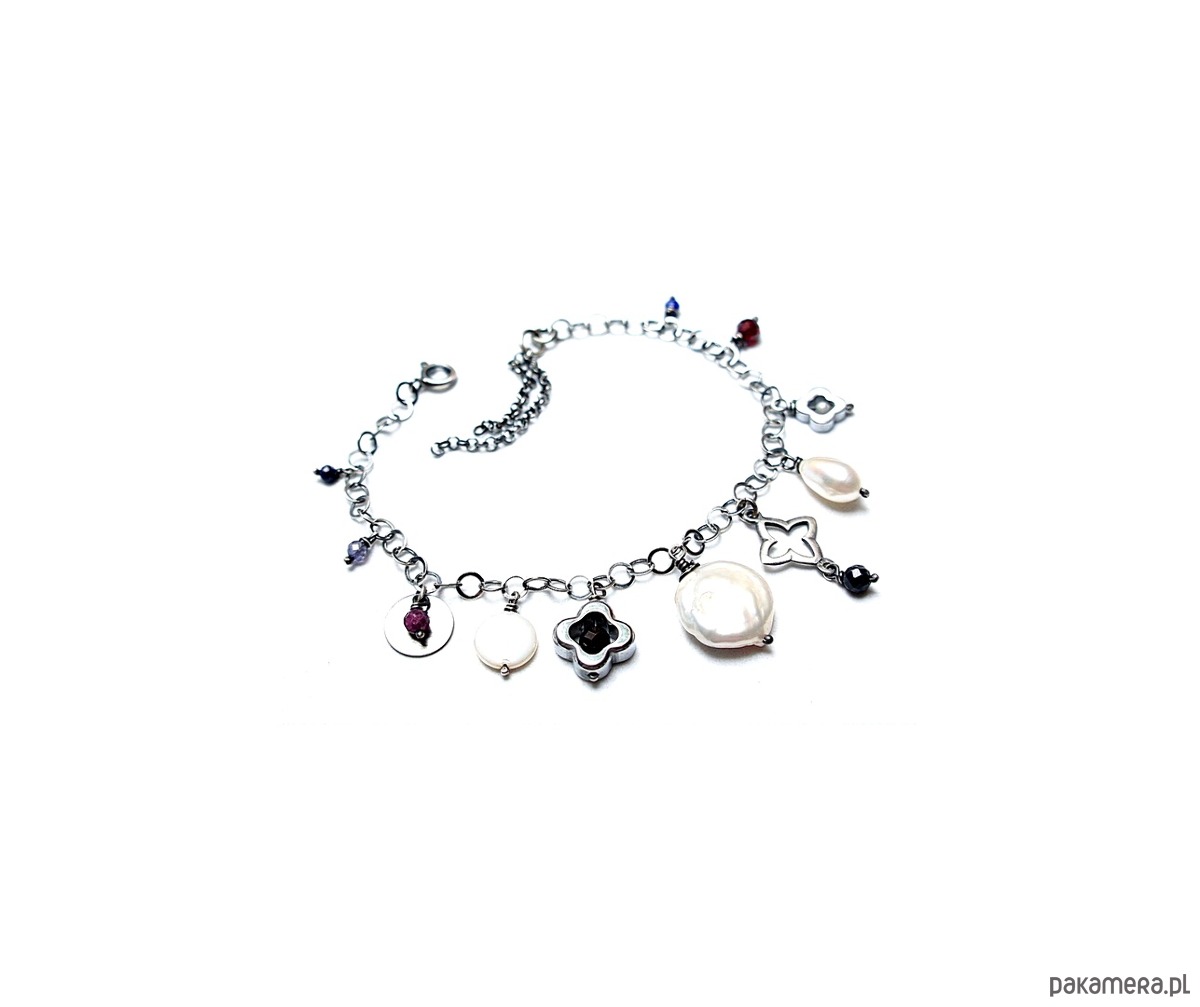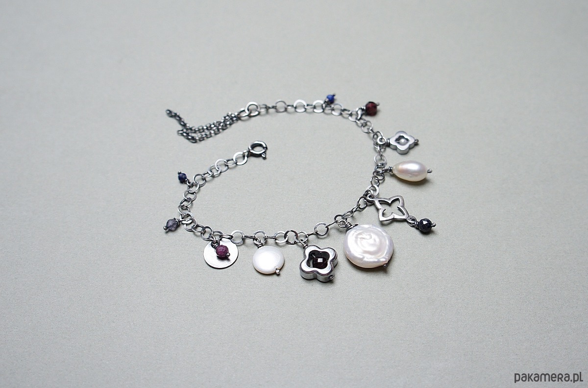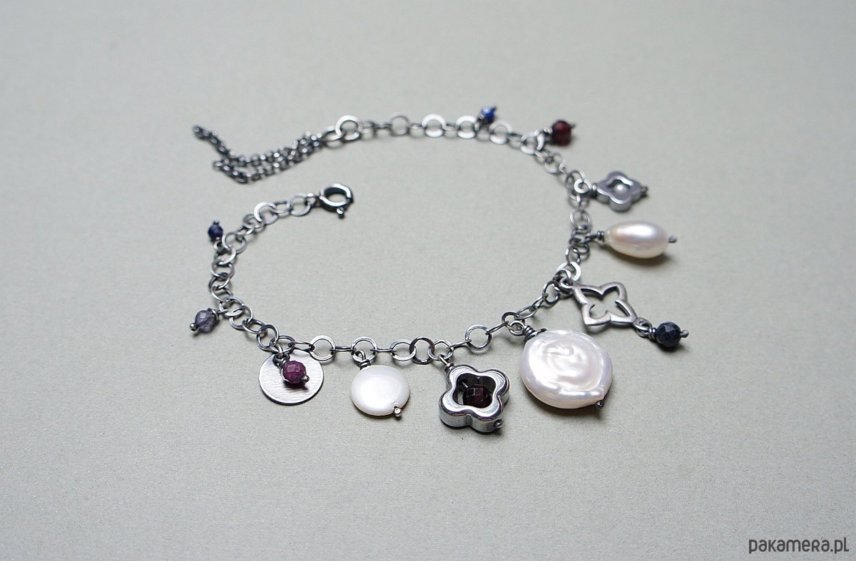 Bransoletka wykonana ze srebra pr. 925 w połączeniu z naturalną perłą [10mm kropla], perłą seashell [pastylka 8mm], naturalną perłą biwa [14mm - monetka], naturalnymi rubinami, szafirami, granatami, iolitami, lapisem lazuli [4mm,3mm i 2mm], hematytowymi koniczynkami oraz srebrną koniczynką. Srebro oksydowane i przetarte. Całkowita długość bransoletki 18,5cm plus ozdobna przedłużka.