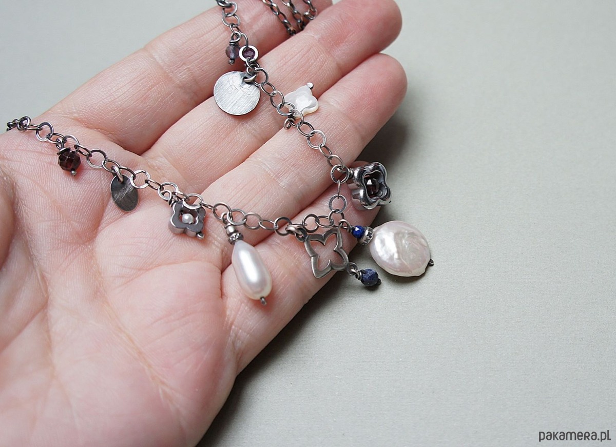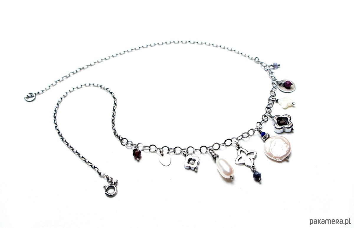 Naszyjnik wykonany ze srebra pr. 925 w połączeniu z naturalną perłą [13mm kropla], macicą perłową [koniczynka 8mm], naturalną perłą biwa [14mm - monetka], naturalnymi rubinami, szafirami, granatami, iolitami, lapisem lazuli [4mm, 3mm i 2mm], hematytowymi koniczynkami oraz srebrną koniczynką. Srebro oksydowane i przetarte. Całkowita długość naszyjnika 45,5cm plus ozdobna przedłużka.