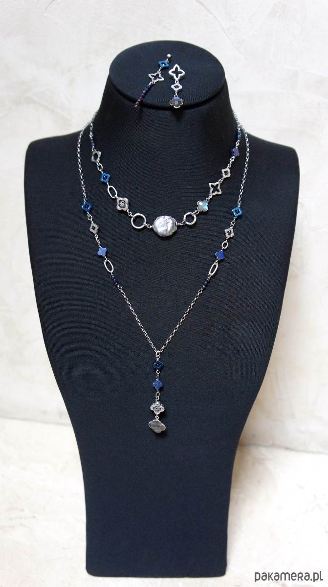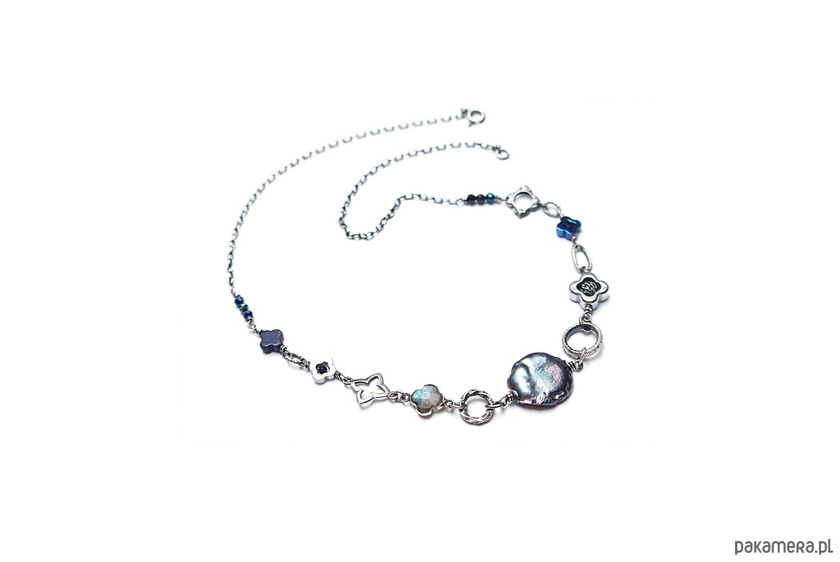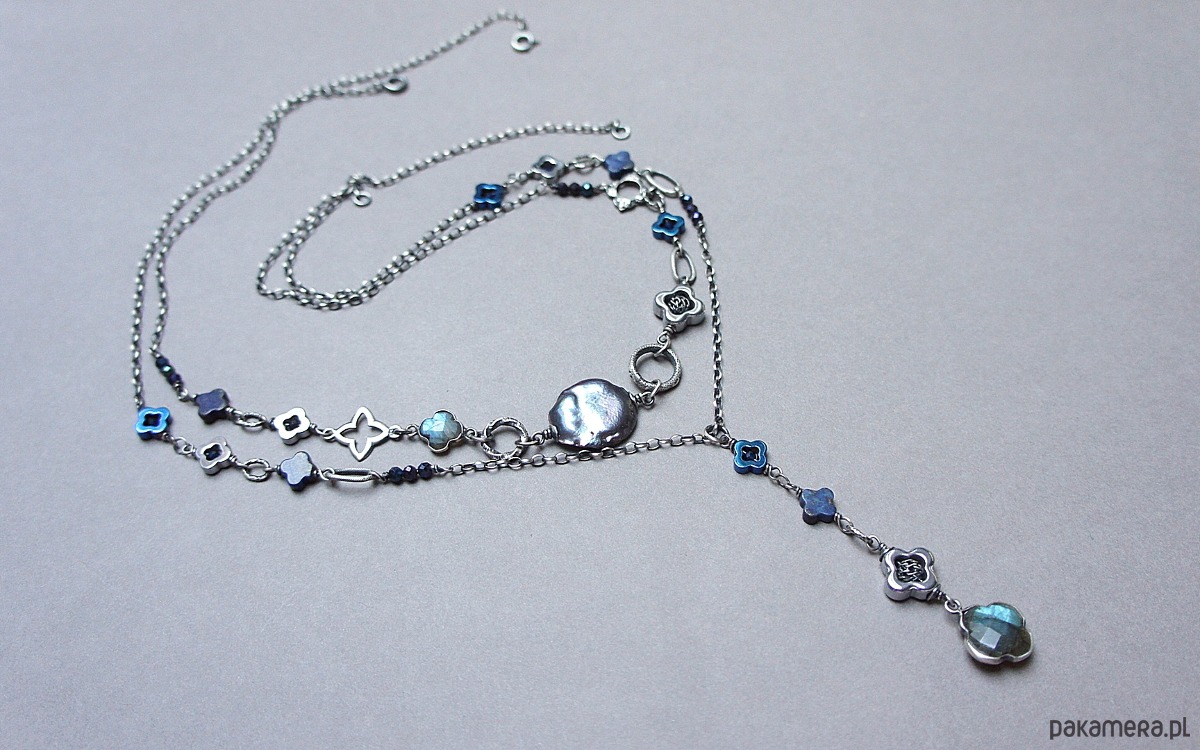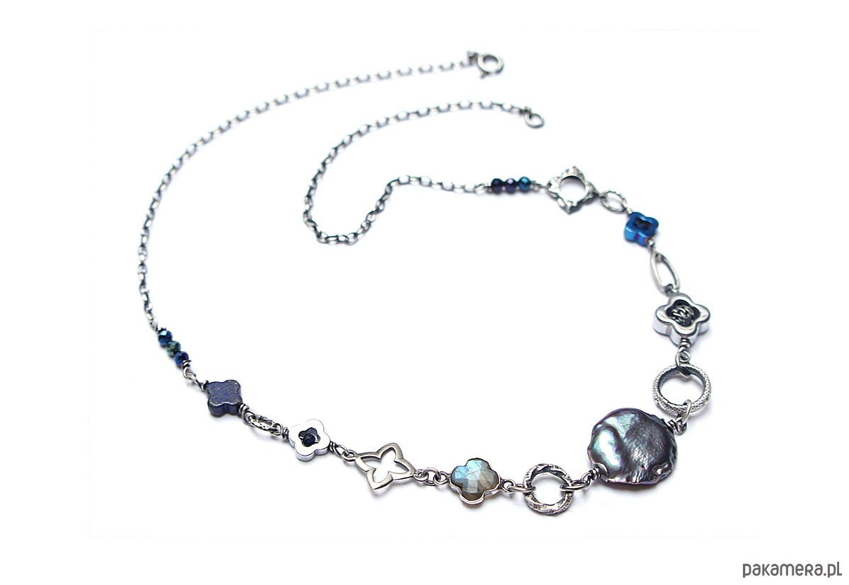 Naszyjnik wykonany ze srebra pr. 925 w połączeniu z naturalną perłą biwa [18mm ],hematytowymi koniczynkami [ 8mm i 12mm], fasetowanymi spinelami mystic [3mm] , szafirami[2mm -syntetyczne] lapisem lazuli [8mm -koniczynka], labradorytem w okuciu oraz srebrnymi ozdobnikami [koniczynki i ogniwa] . Srebro oksydowane i przetarte. Całkowita długość naszyjnika 46,5cm .