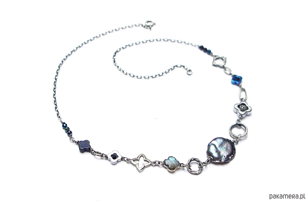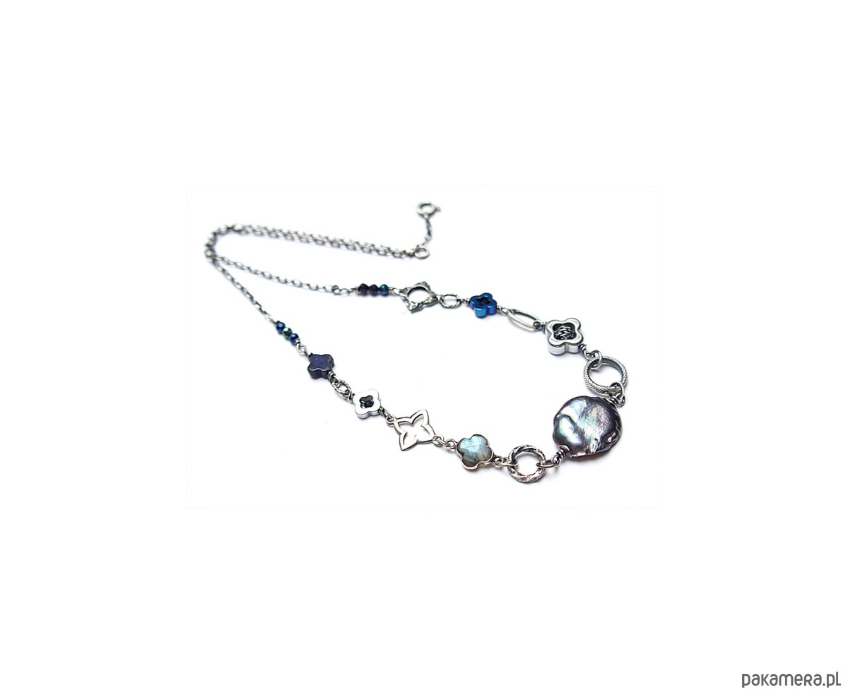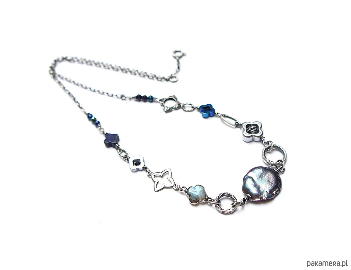 Naszyjnik wykonany ze srebra pr. 925 w połączeniu z naturalną perłą biwa [18mm ], hematytowymi koniczynkami [ 8mm i 12mm], fasetowanymi spinelami mystic [3mm], szafirami[2mm - syntetyczne], lapisem lazuli [8mm - koniczynka], labradorytem w okuciu oraz srebrnymi ozdobnikami [koniczynki i ogniwa]. Srebro oksydowane i przetarte. Całkowita długość naszyjnika 46,5cm. Biżuteria ozdobnie zapakowana.