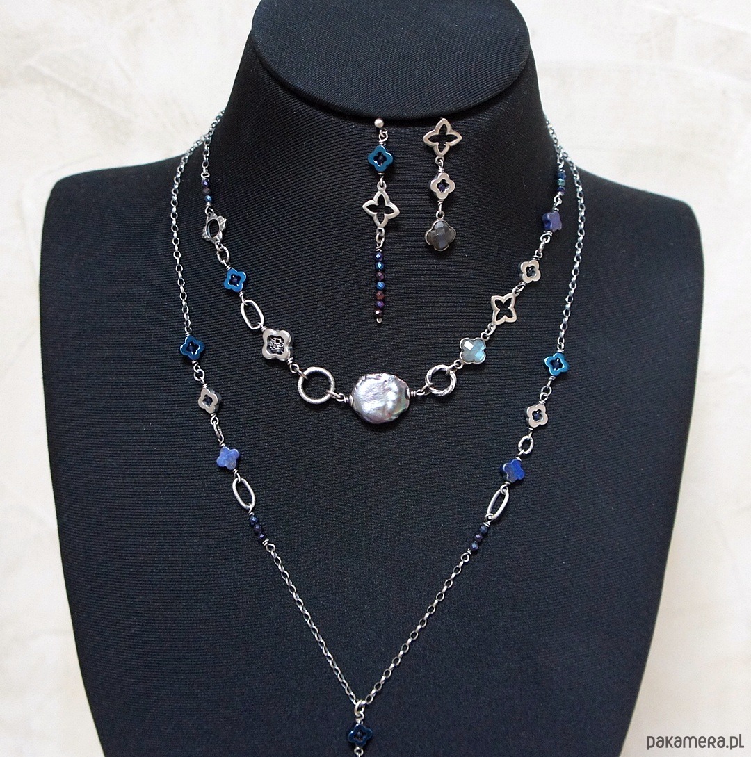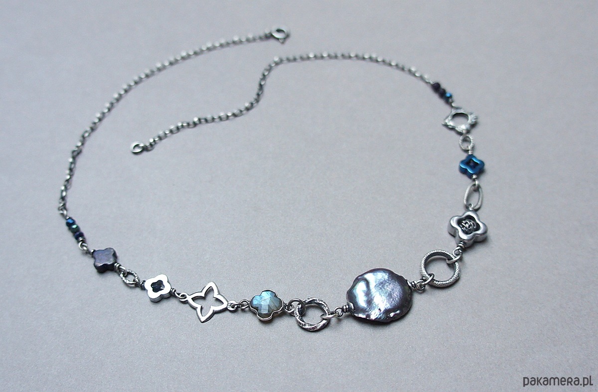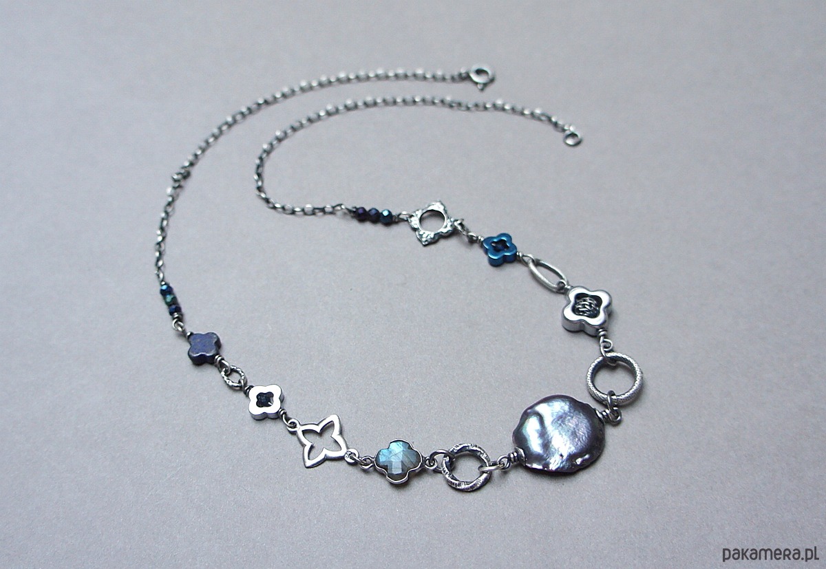 Naszyjnik wykonany ze srebra pr. 925 w połączeniu z naturalną perłą biwa [18mm ], hematytowymi koniczynkami [ 8mm i 12mm], fasetowanymi spinelami mystic [3mm], szafirami[2mm - syntetyczne], lapisem lazuli [8mm - koniczynka], labradorytem w okuciu oraz srebrnymi ozdobnikami [koniczynki i ogniwa]. Srebro oksydowane i przetarte. Całkowita długość naszyjnika 46,5cm. Biżuteria ozdobnie zapakowana.