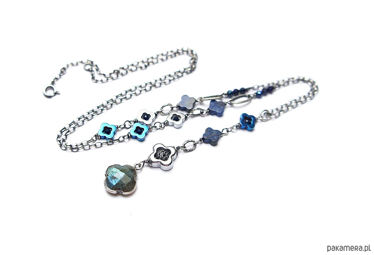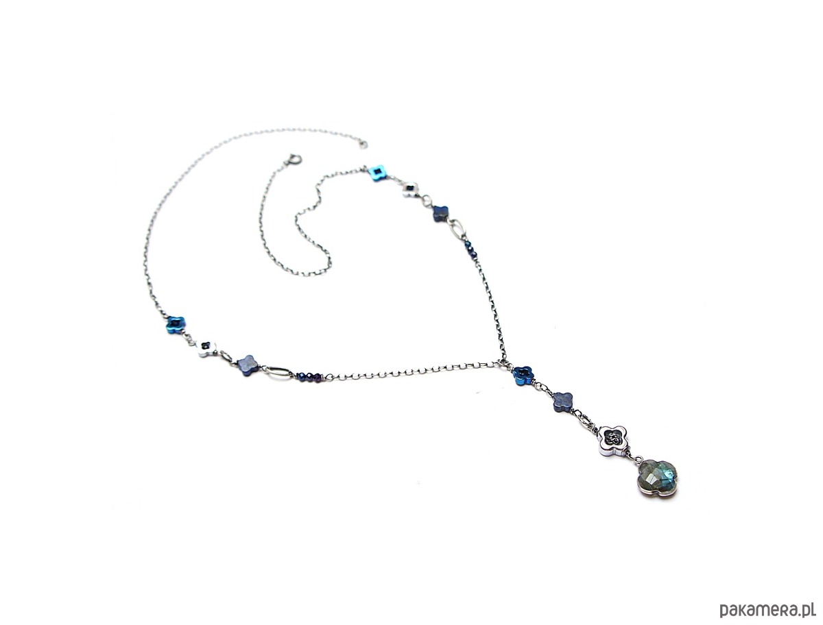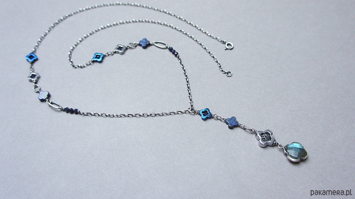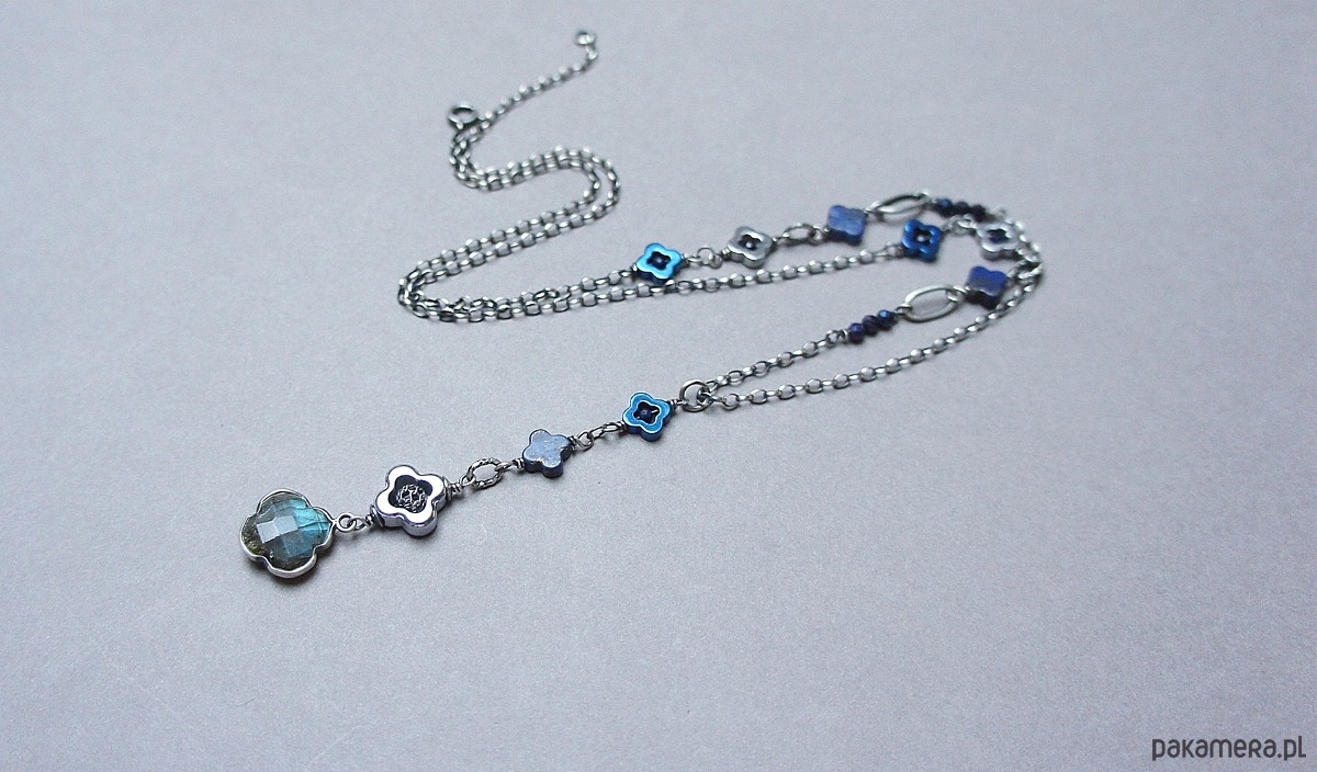 Naszyjnik wykonany ze srebra pr. 925 w połączeniu z hematytowymi koniczynkami [ 8mm i 12mm], fasetowanymi spinelami mystic [3mm] , szafirami[2mm -syntetyczne] lapisem lazuli [8mm -koniczynka], labradorytem w okuciu . Srebro oksydowane i przetarte. Całkowita długość naszyjnika 63cm ,długość części wiszącej 8cm .