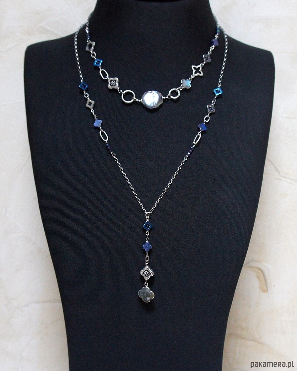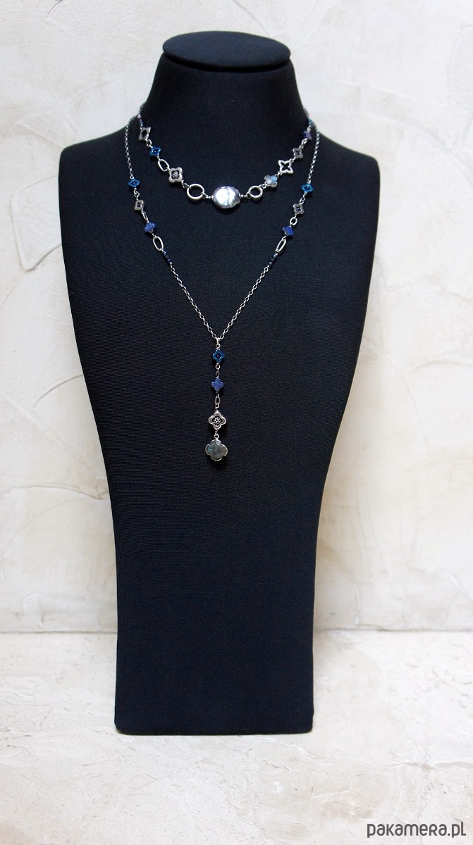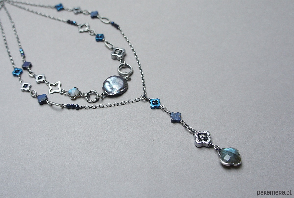 Naszyjnik wykonany ze srebra pr. 925 w połączeniu z hematytowymi koniczynkami [ 8mm i 12mm], fasetowanymi spinelami mystic [3mm] , szafirami[2mm -syntetyczne] lapisem lazuli [8mm -koniczynka], labradorytem w okuciu . Srebro oksydowane i przetarte. Całkowita długość naszyjnika 63cm ,długość części wiszącej 8cm .