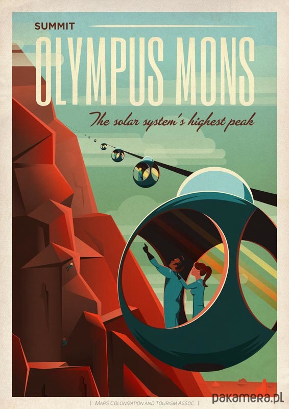 Plakat w stylu vintage promujący turystykę marsjańską. Przedstawia górę Olympus Mons o wysokości 21 kilometrów - najwyższą w całym Układzie Słonecznym.