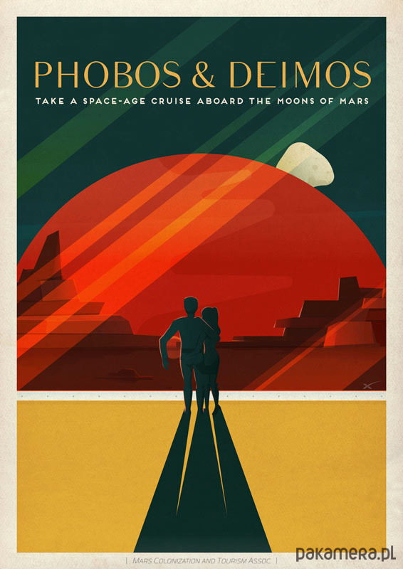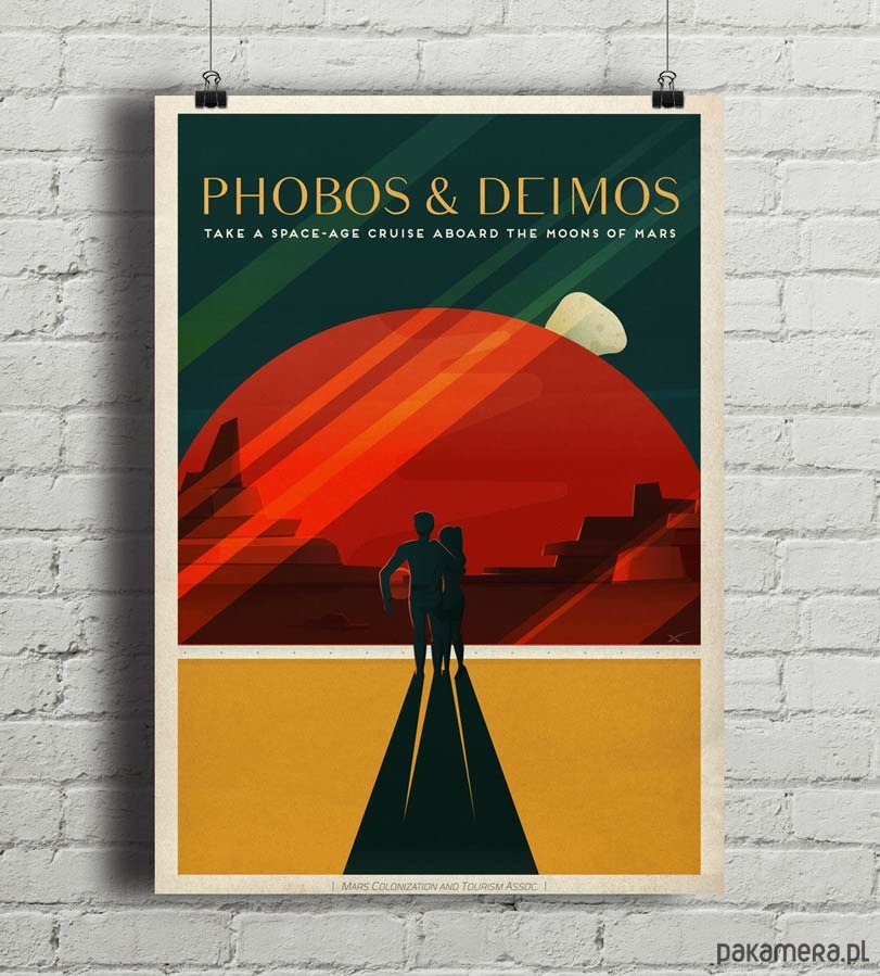 Plakat w stylu vintage promujący turystykę marsjańską. Przedstawia dwa księżyce Marsa - Fobos i Deimos.
