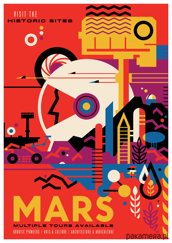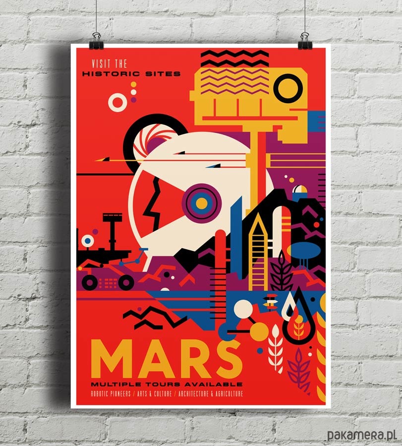Plakat w stylu vintage przedstawiający wyprawę na planetę Mars, reklamowaną sloganem "Odwiedź historyczne miejsca".