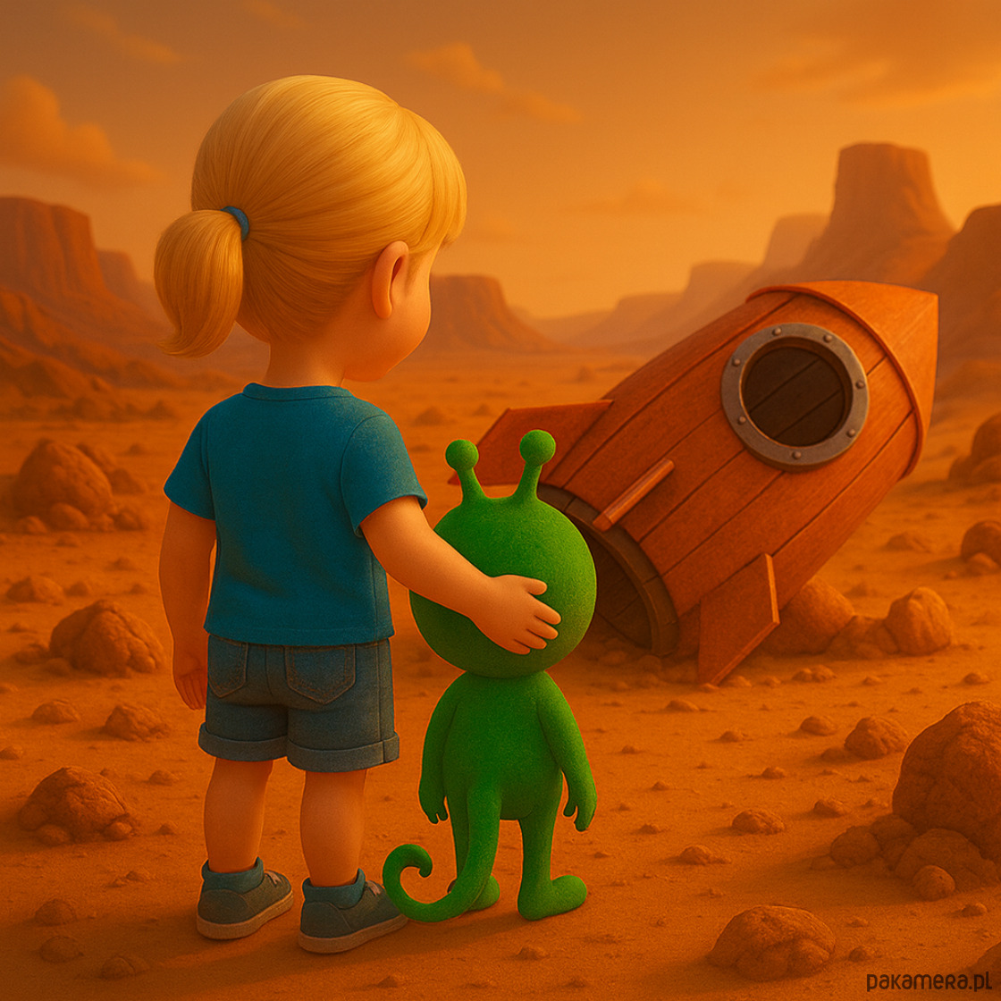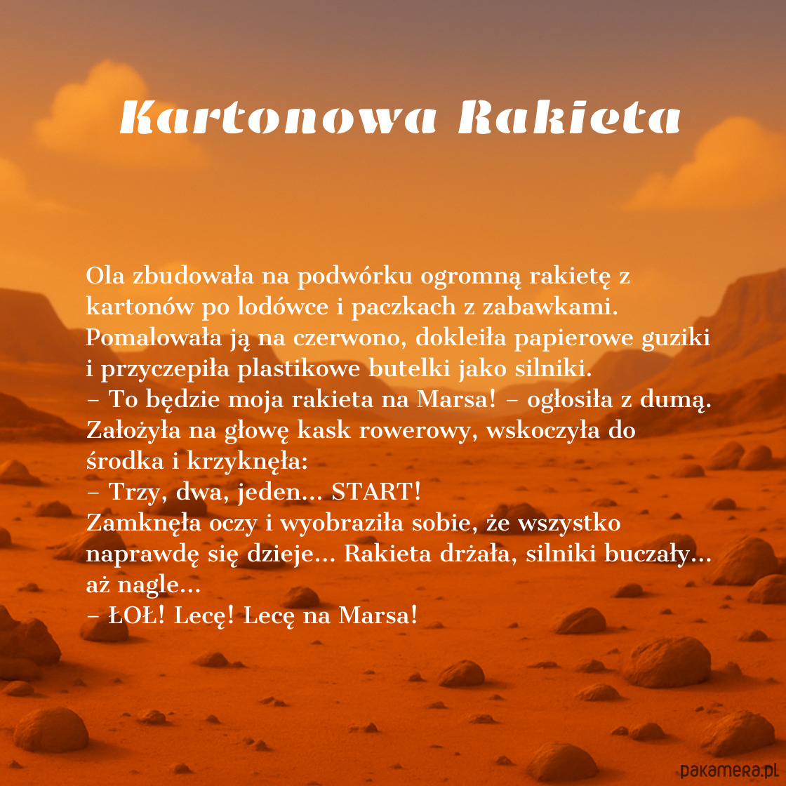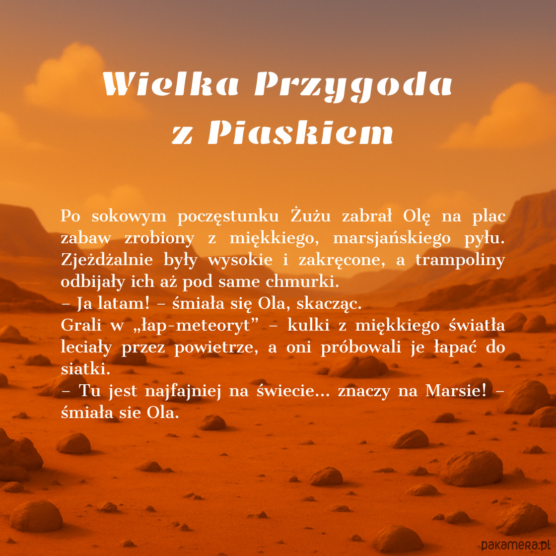 „Marsjańska przygoda Oli” to ciepła, personalizowana opowieść dla najmłodszych. Twoje dziecko startuje rakietą z podwórka, poznaje przyjaznych mieszkańców Marsa, pomaga naprawić statek, a finałem jest radosne przyjęcie urodzinowe marsjańskiego przyjaciela. Każdy z 10 rozdziałów to krótka, zrozumiała historia z odrobiną humoru i prostym morałem – idealna na wieczorne czytanie.