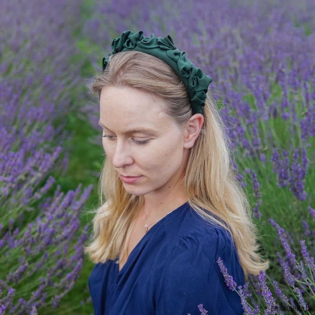 Opaska, która wygląda jak biżuteria. Powstała z luksusowego, jedwabnego krawata i została ręcznie zmarszczona na całej długości, dzięki czemu tworzy rzeźbiarskie fale dodające fryzurze objętości. Głęboka butelkowa zieleń jedwabiu subtelnie połyskuje, a miękka faktura pięknie układa się na głowie.