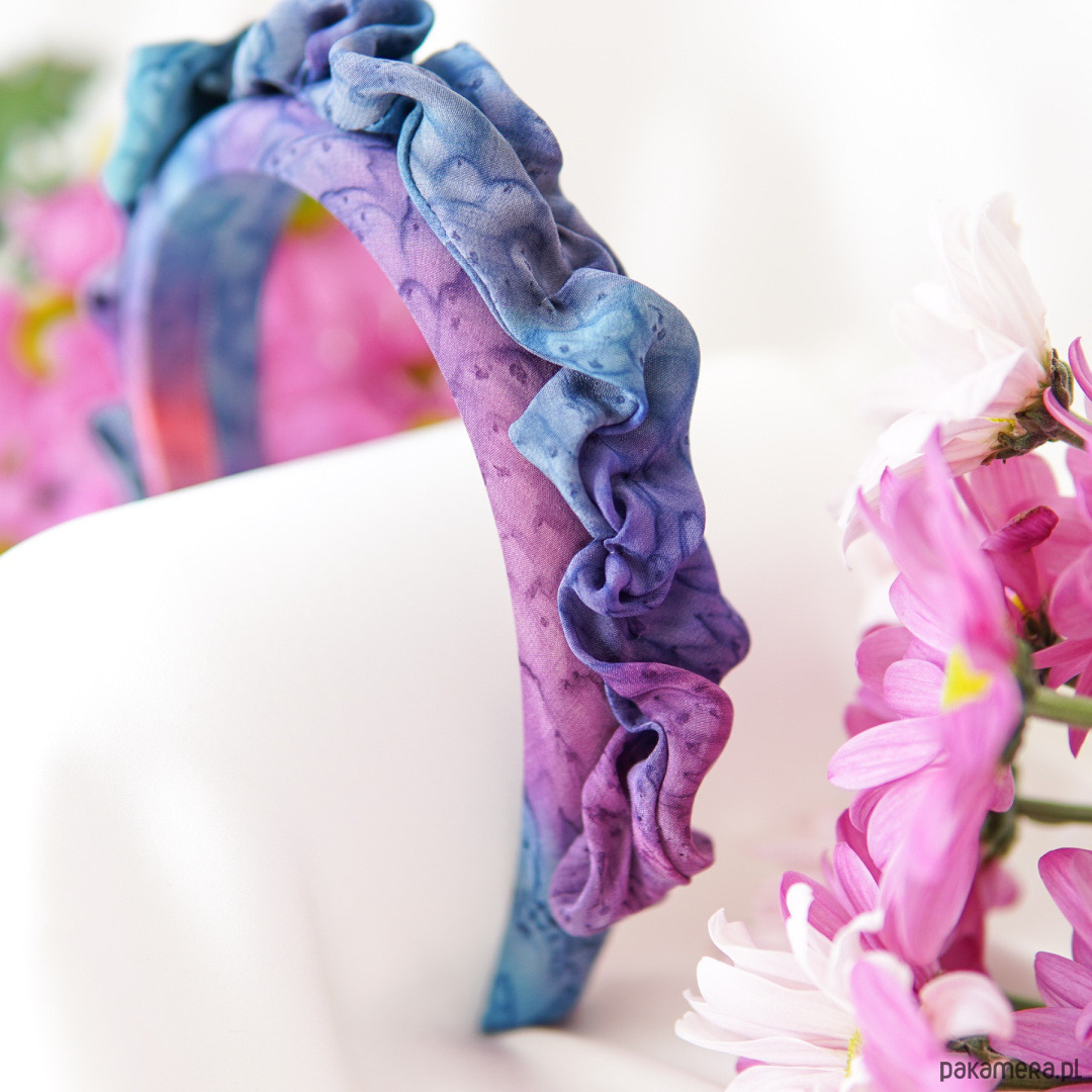 Opaska na włosy stworzona z jedwabnego, męskiego krawata. Tkanina jest wyjątkowo wzorzysta i delikatna. Model ozdoby na włosy w niecodziennym wydaniu. Lekka i wygodna opaska na głowę dla kobiet, które chcą podkreślić swoją fryzurę. Opaska jest w uniwersalnym rozmiarze, dopasowuje się do kształtu głowy. Została stworzona na gotowej wyprasce o szerokości 3 cm. Bardzo miękka gąbka powoduje, że opaska odstaje od głowy na wysokość ok. 0,5 cm. Daje to efekt tiary lub delikatnej korony. Pasuje kobietom o długich i krótkich włosach. Sprawdzi się w niedbałych koczkach, kucykach oraz warkoczach. Urozmaici fryzury wieczorowe i codzienne.