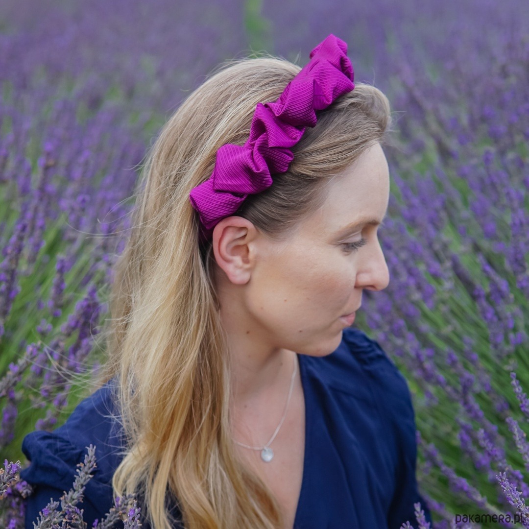 Jedwab z krawata (upcycling), miękko połyskujący w głębokim odcieniu fioletu. Tkanina została starannie oczyszczona i przygotowana, a następnie ręcznie uformowana w falujące marszczenia. Opaska osadzona jest na lekkiej, usztywnianej bazie z delikatnym wzniesieniem gąbeczki – stabilnie trzyma się na głowie, nie uciska i jest wygodna przez cały dzień.