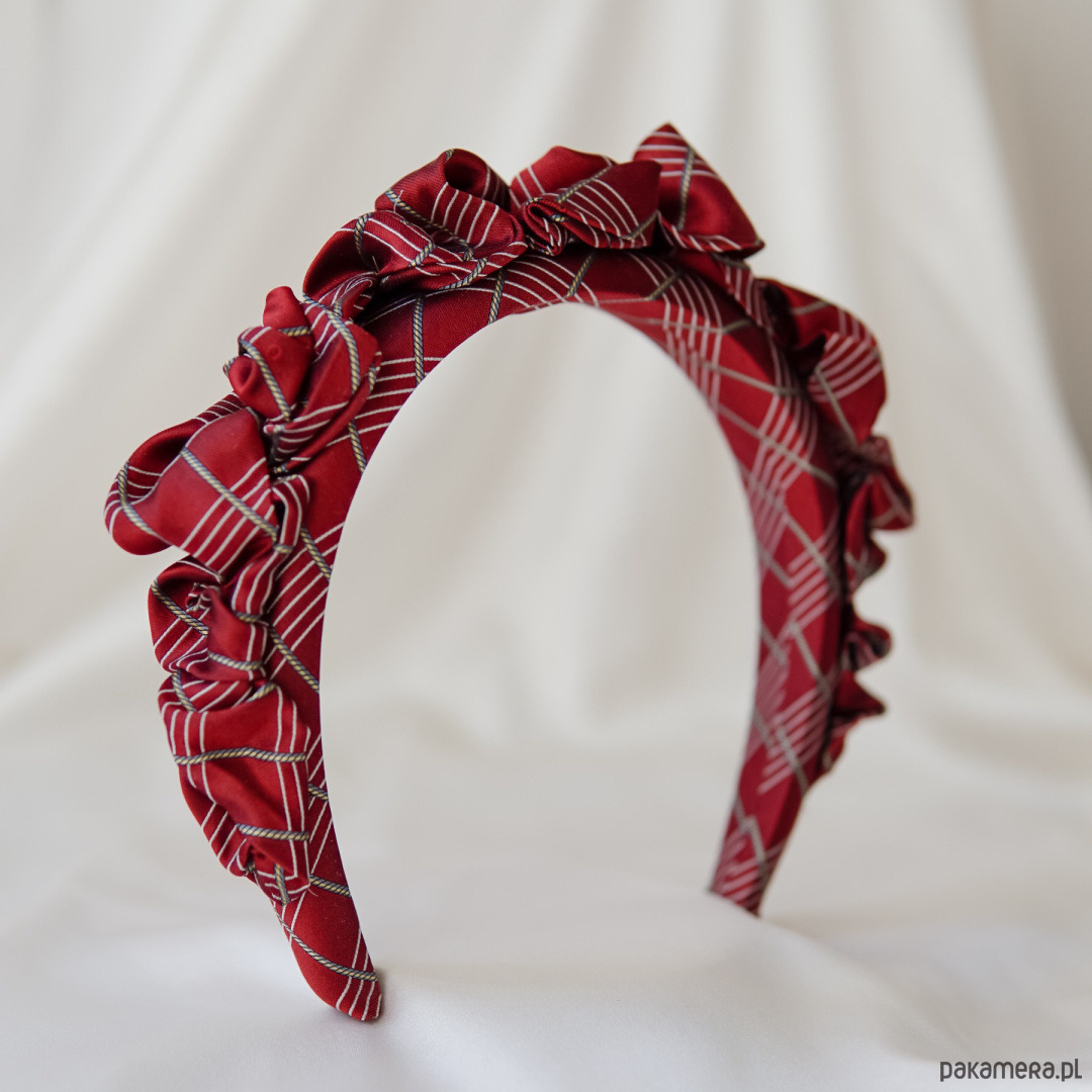 Opaska na włosy stworzona z jedwabnego, męskiego krawata. Tkanina jest wyjątkowo wzorzysta i delikatna. Model ozdoby na włosy w niecodziennym wydaniu. Lekka i wygodna opaska na głowę dla kobiet, które chcą podkreślić swoją fryzurę. Opaska jest w uniwersalnym rozmiarze, dopasowuje się do kształtu głowy. Została stworzona na gotowej wyprasce o szerokości 3 cm. Bardzo miękka gąbka powoduje, że opaska odstaje od głowy na wysokość ok. 0,5 cm. Daje to efekt tiary lub delikatnej korony. Pasuje kobietom o długich i krótkich włosach. Sprawdzi się w niedbałych koczkach, kucykach oraz warkoczach. Urozmaici fryzury wieczorowe i codzienne.