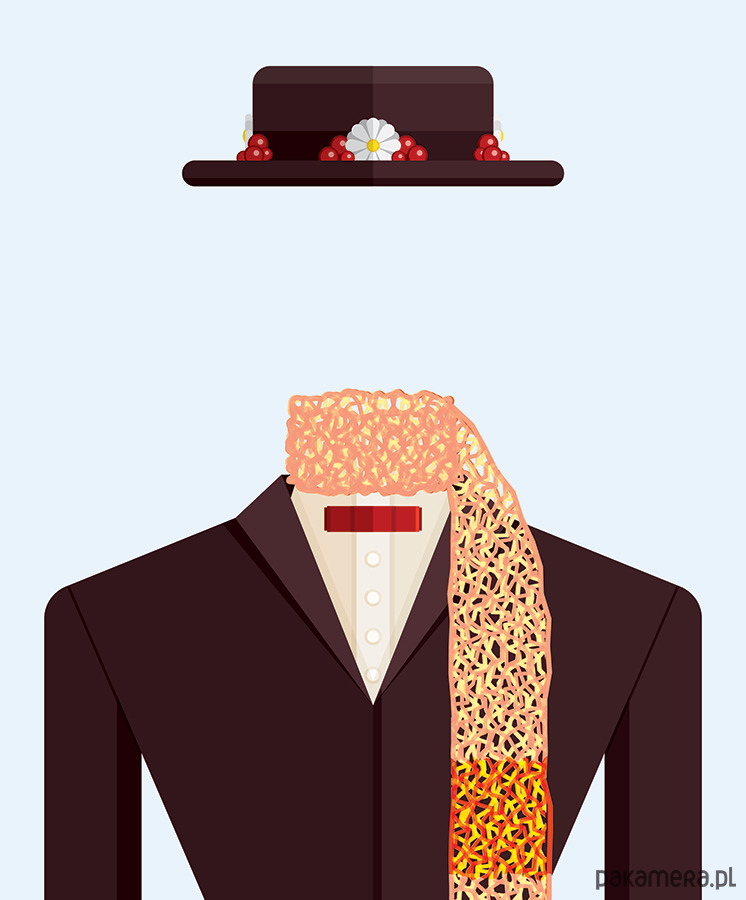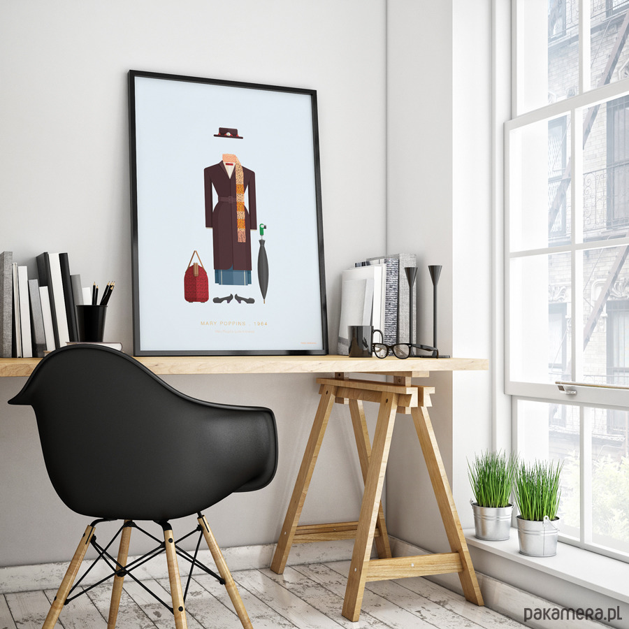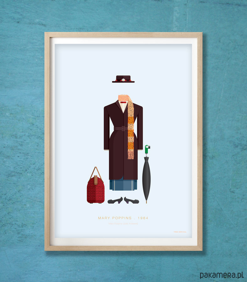 Plakat z autorską grafiką inspirowany filmem "Mary Poppins", reż. Robert Stevenson. Pochodzi z serii "Cinema Costumes" (Kostiumy kinowe) i przedstawia strój tytułowej bohaterki.