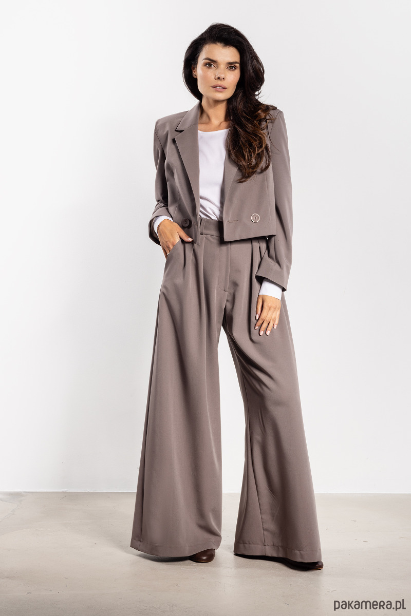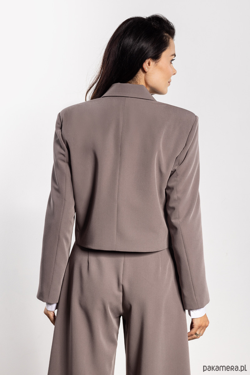 Stylowa marynarka o luźnym kroju łączy klasykę z nowoczesnym charakterem. Krótszy fason nadaje lekkości, a dwurzędowe zapięcie na guziki podkreśla elegancję. Klasyczne klapy i prosta linia ramion sprawiają, że marynarka prezentuje się profesjonalnie i szykownie, jednocześnie zapewniając komfort noszenia. Doskonale komponuje się zarówno z szerokimi spodniami, jak i spódnicą czy sukienką, tworząc uniwersalny i efektowny look na różne okazje.