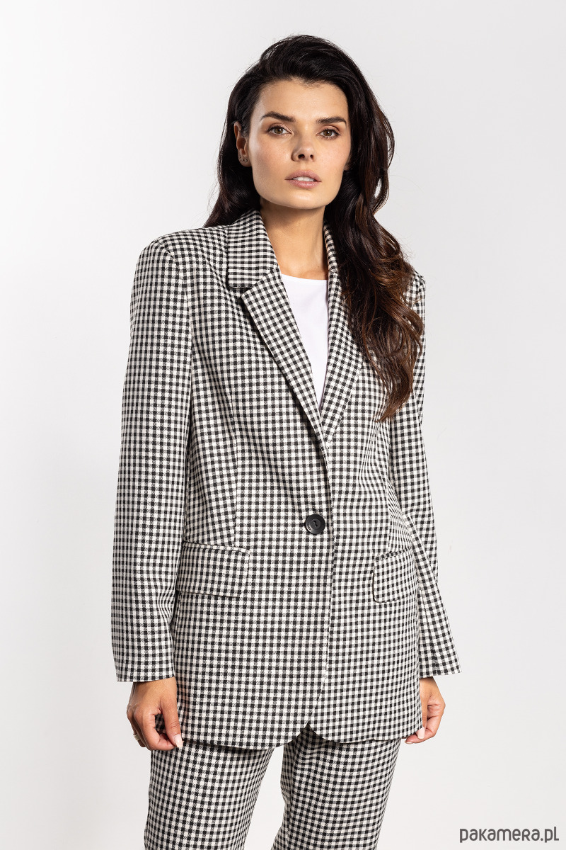 Elegancka marynarka damska w kratę o luźnym fasonie oversize łączy komfort i ponadczasowy styl. Klasyczny kołnierz z klapami i zapięcie na guzik podkreślają formalny charakter, a luźny krój zapewnia swobodę ruchów. Model doskonale komponuje się z eleganckimi spodniami, spódnicą lub casualowymi jeansami, sprawdzając się w pracy, na spotkaniach biznesowych oraz podczas codziennych stylizacji. Praktyczne kieszenie z klapką dodają funkcjonalności i nowoczesnego akcentu.